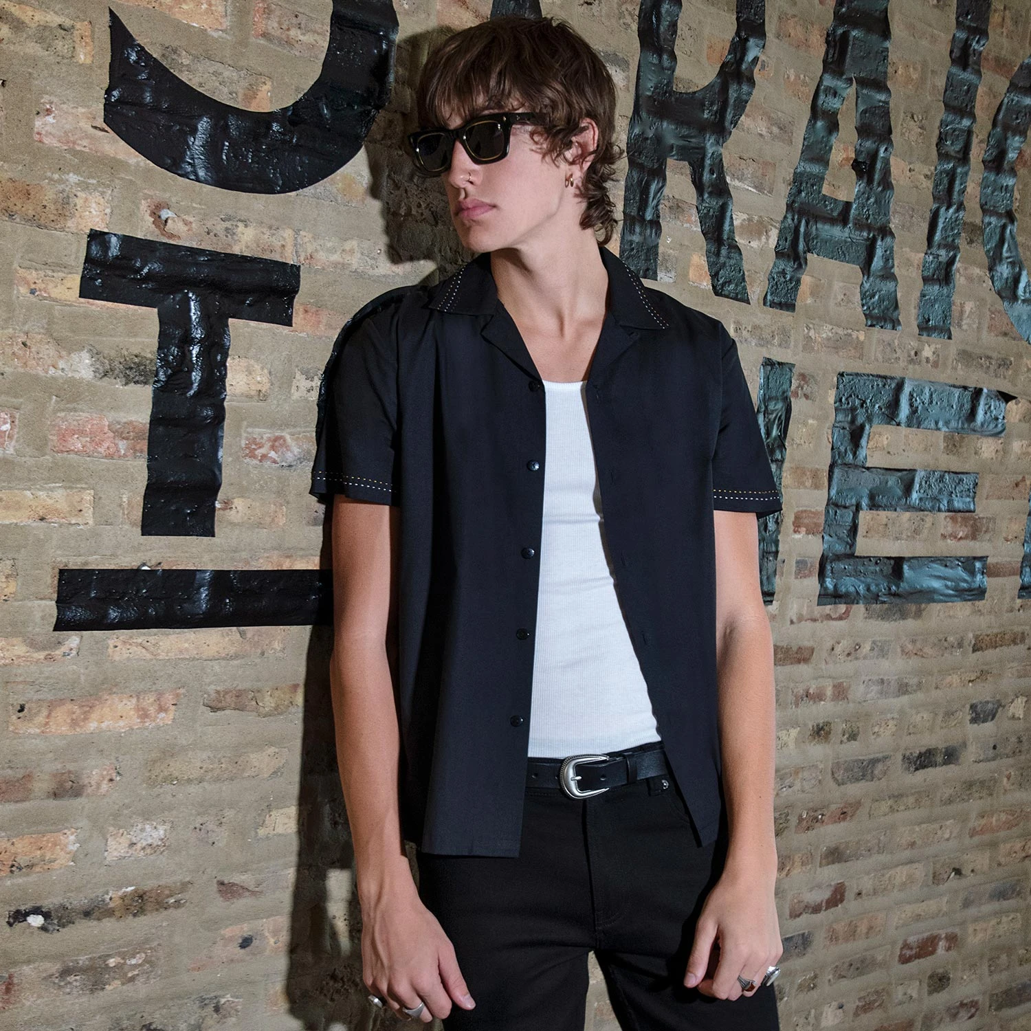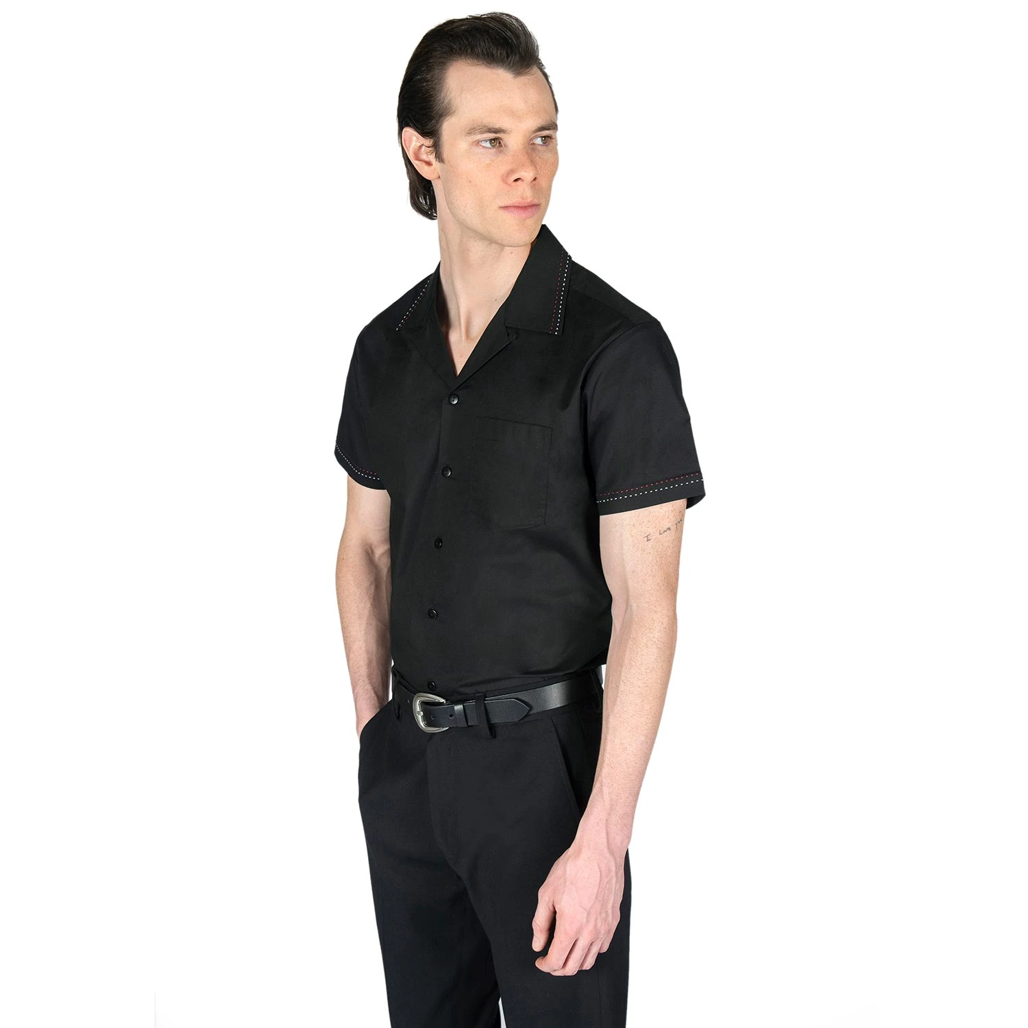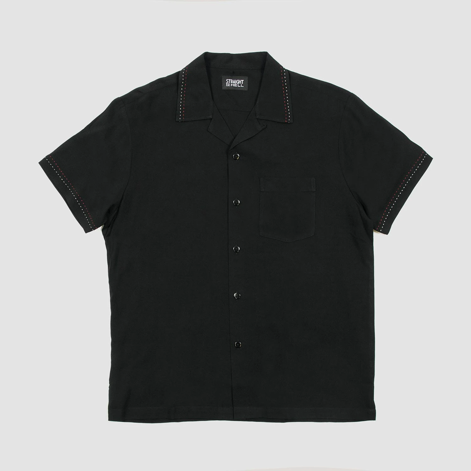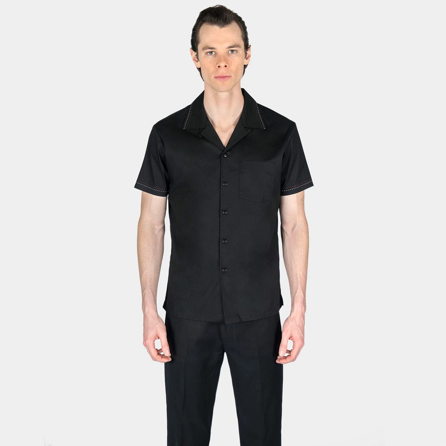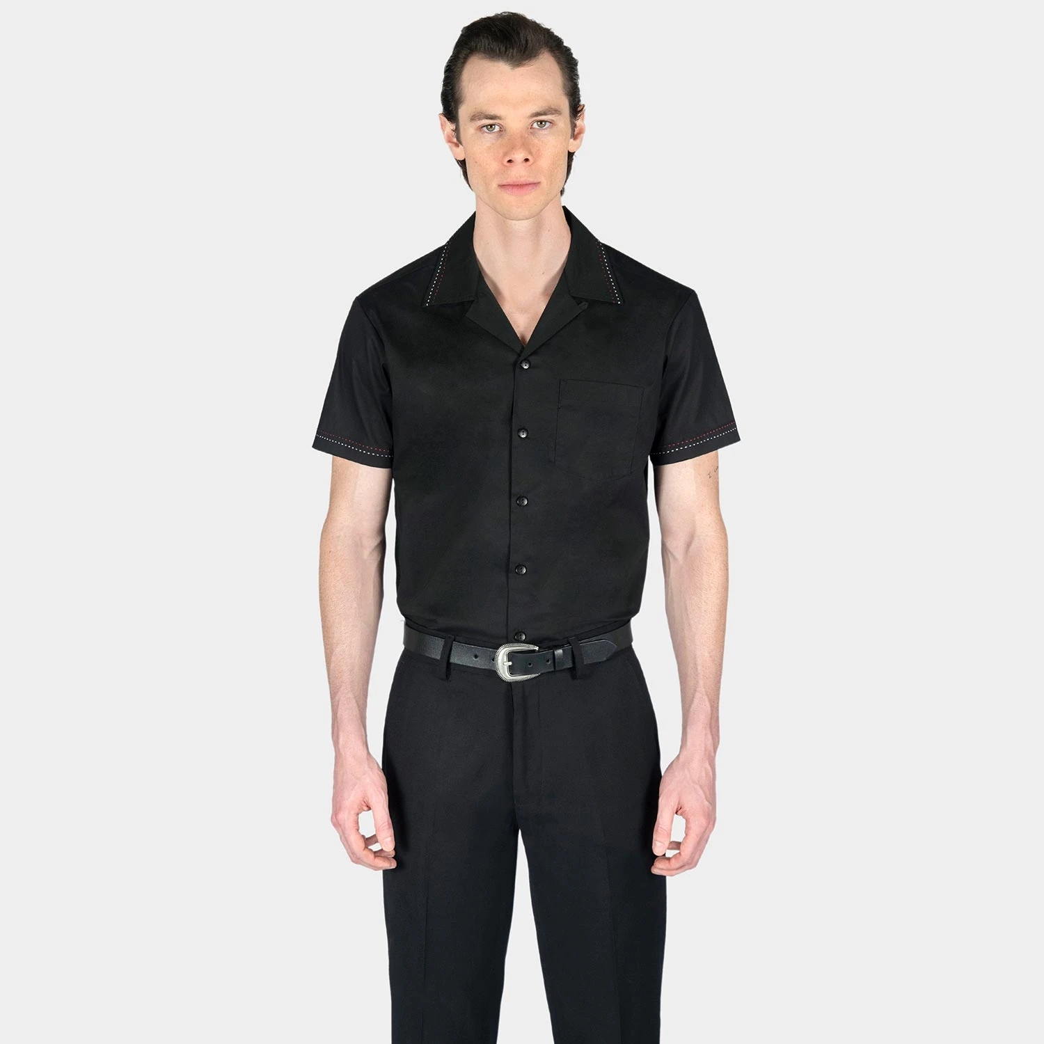 We created new, custom woven, STH Clothier cotton-modal blended fabric. The strong cotton offers durability, and the modal allows for a soft texture that drapes perfectly. Short sleeve button up black camp shirt with spread collar. White and red contrast stitching on the collar and sleeves. Tailored for a slimmer fit but loose enough for comfort.