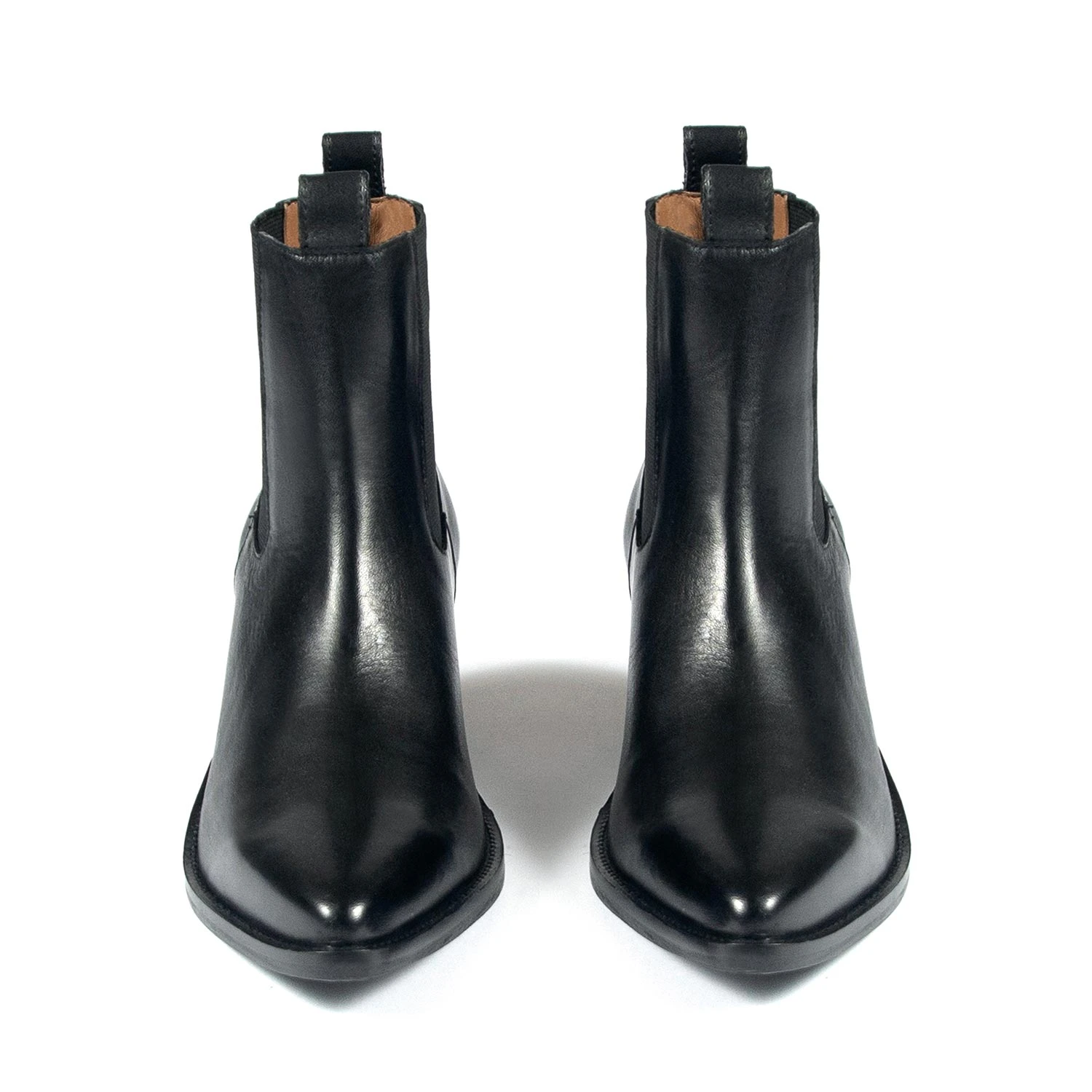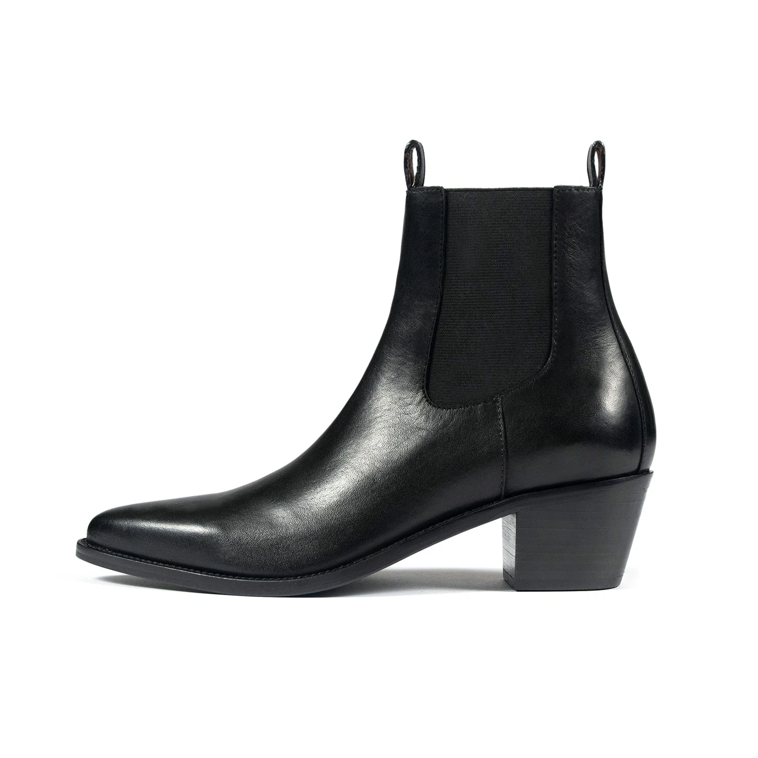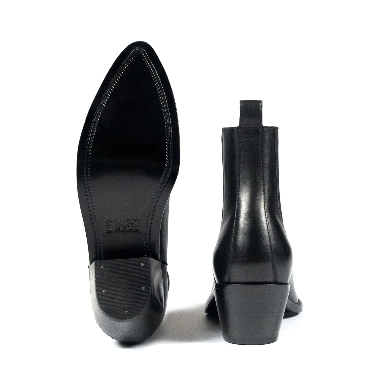 The Addison is a women’s black, premium leather Chelsea boot featuring an elastic ankle, stacked heel, and pointed toe. Hand-made, leather sole with STH logo engraving.