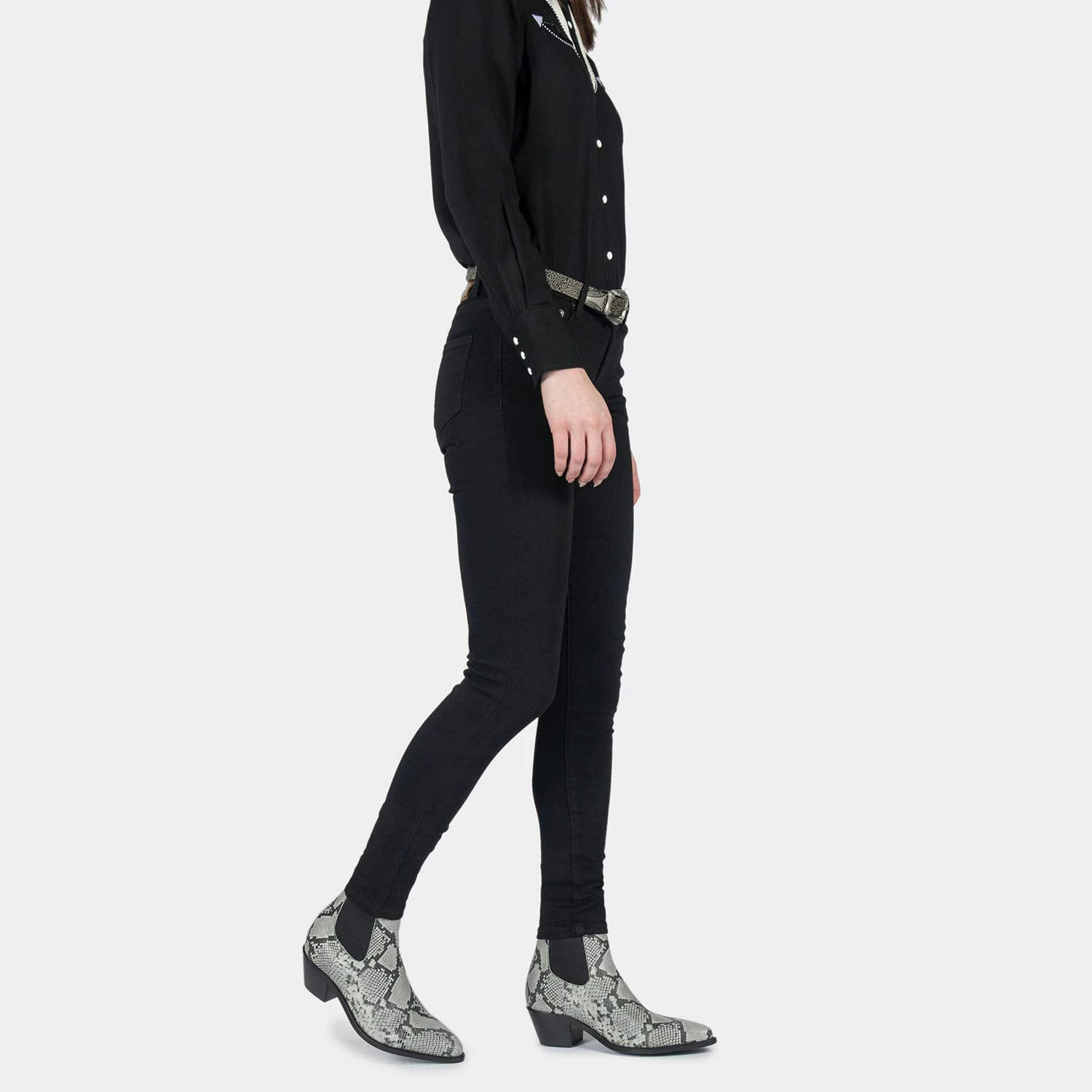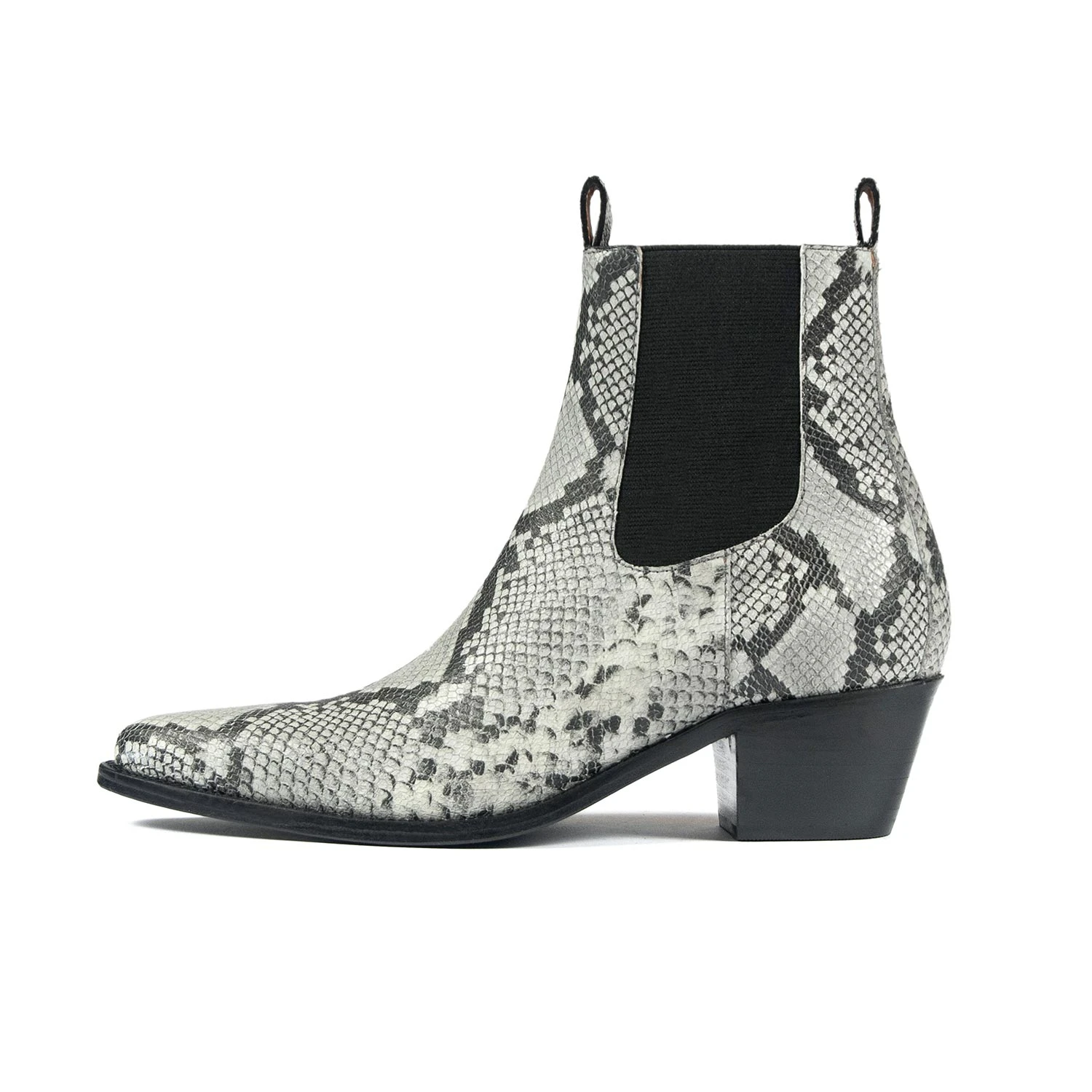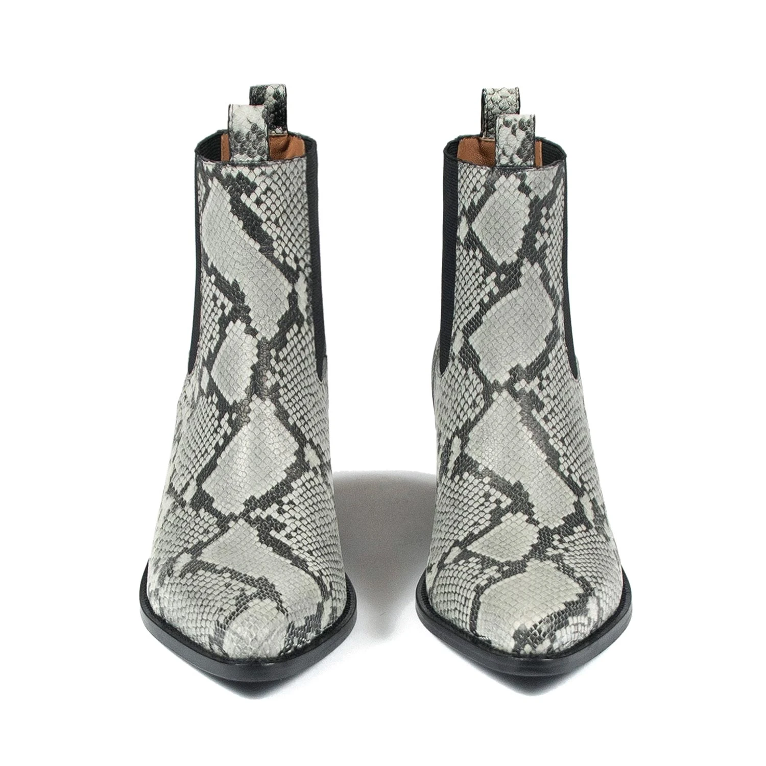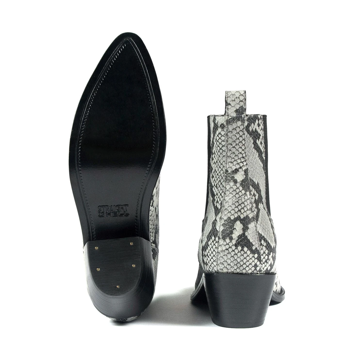 The Addison is a women’s grey snakeskin pattern, premium leather Chelsea boot featuring an elastic ankle, stacked heel, and pointed toe. Hand-made, leather sole with STH logo engraving.