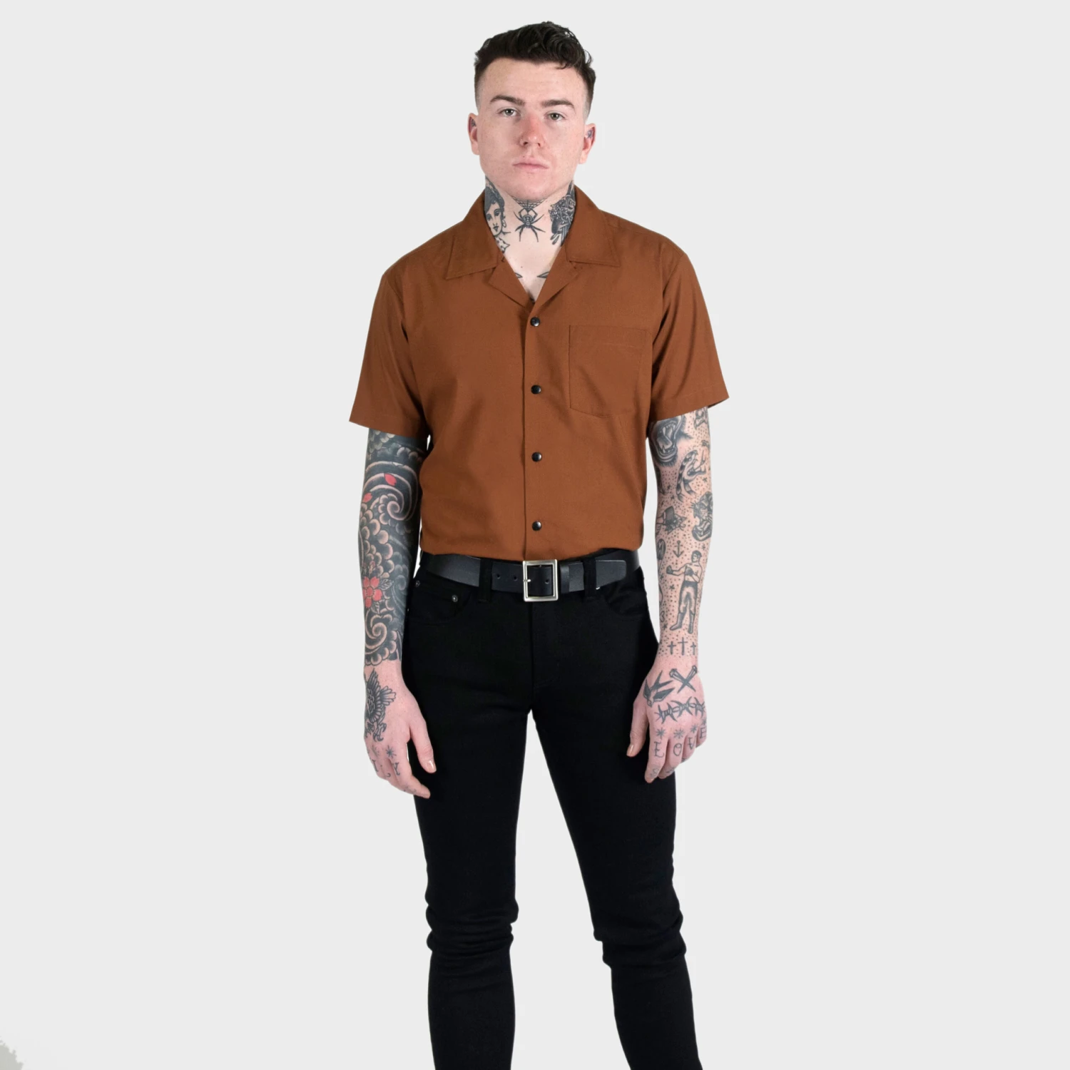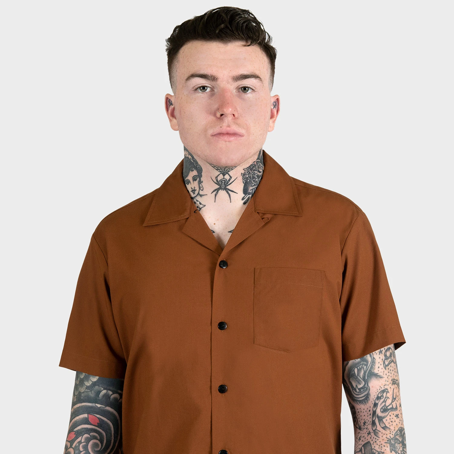 We created new, custom woven, STH Clothier cotton-modal blended fabric. The strong cotton offers durability, and the modal allows for a soft texture that drapes perfectly. Short sleeve button up brown camp shirt with spread collar. The neck interior features subtle black piping detail to match the black STH engraved buttons. Tailored for a slimmer fit but loose enough for comfort.