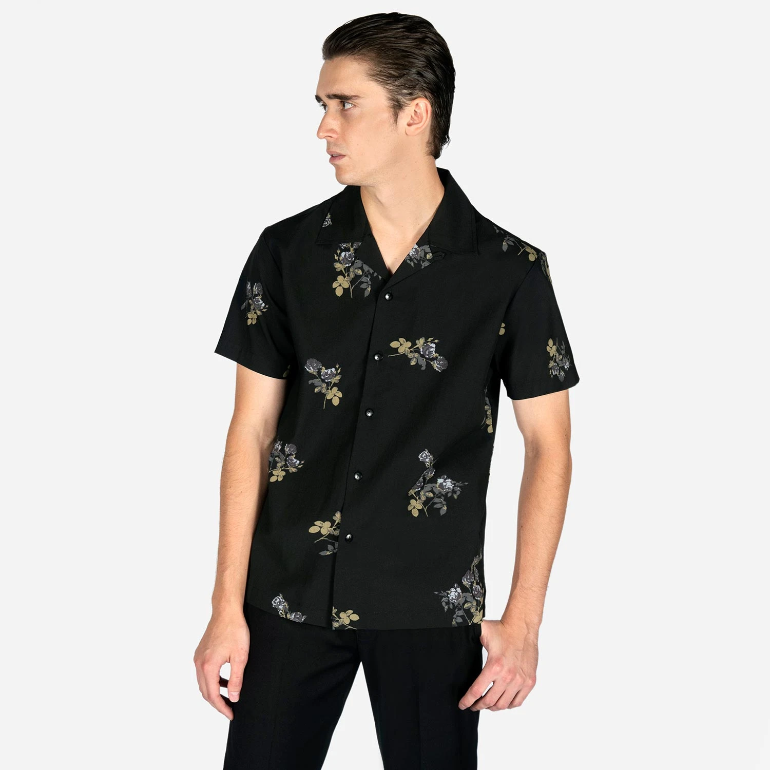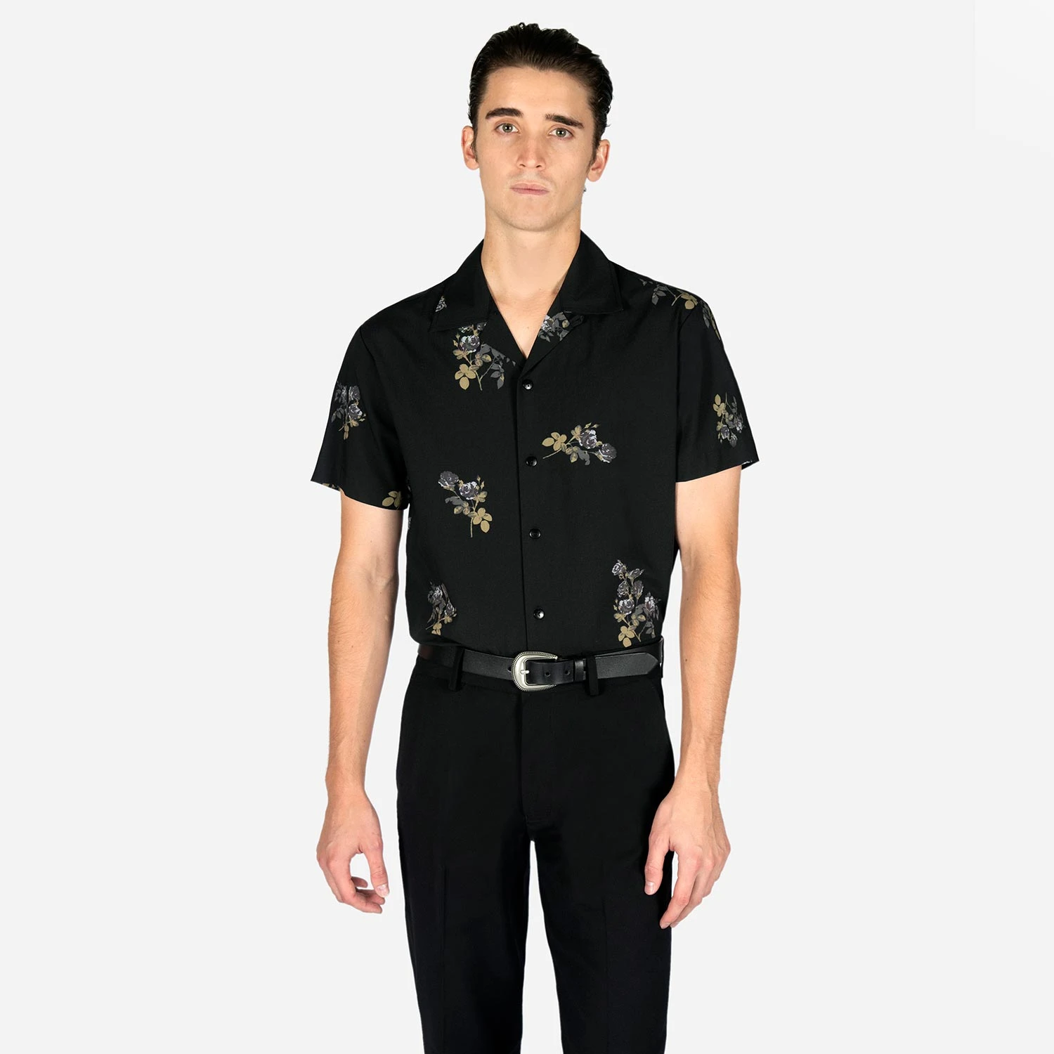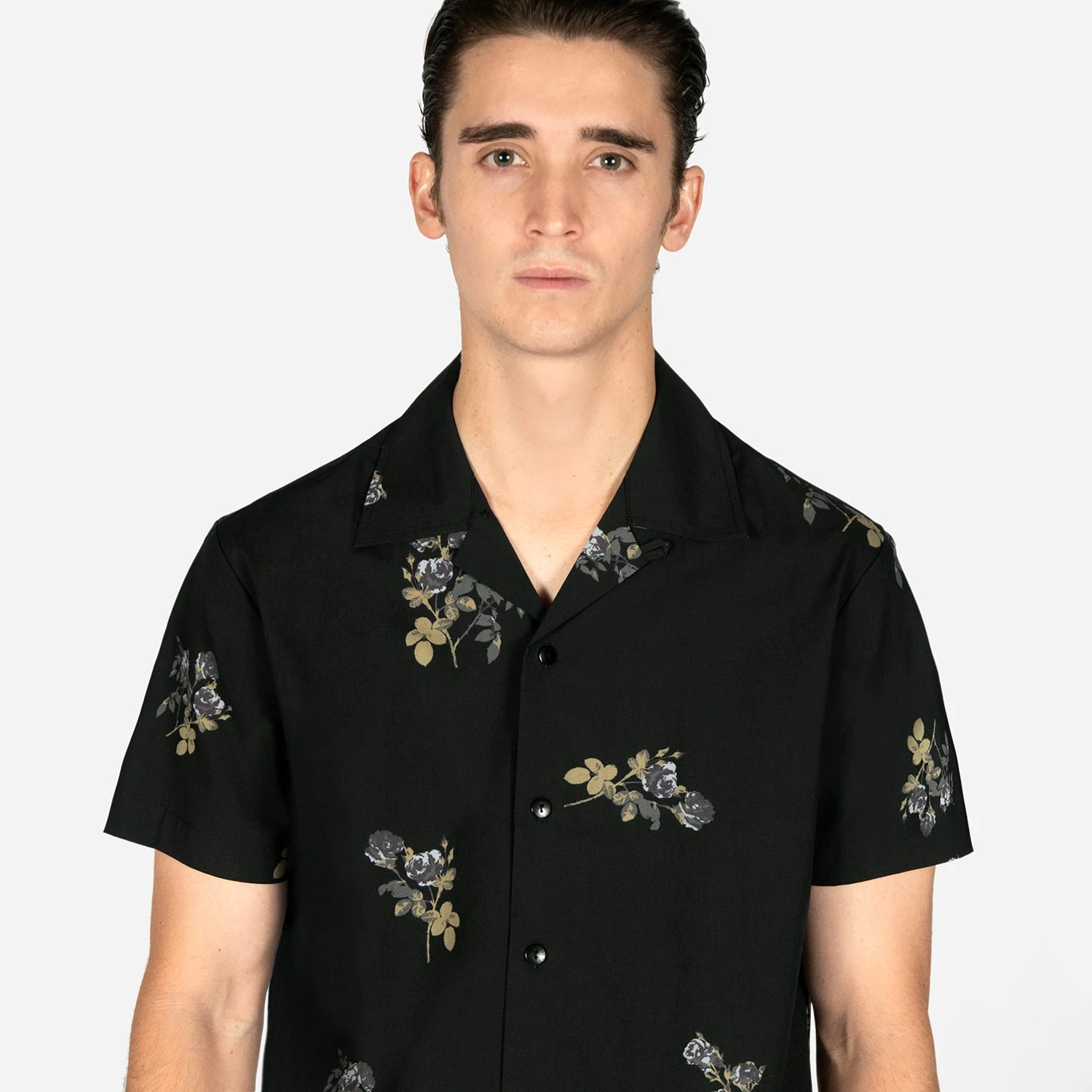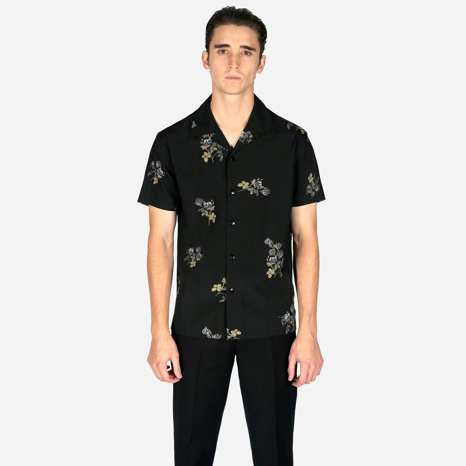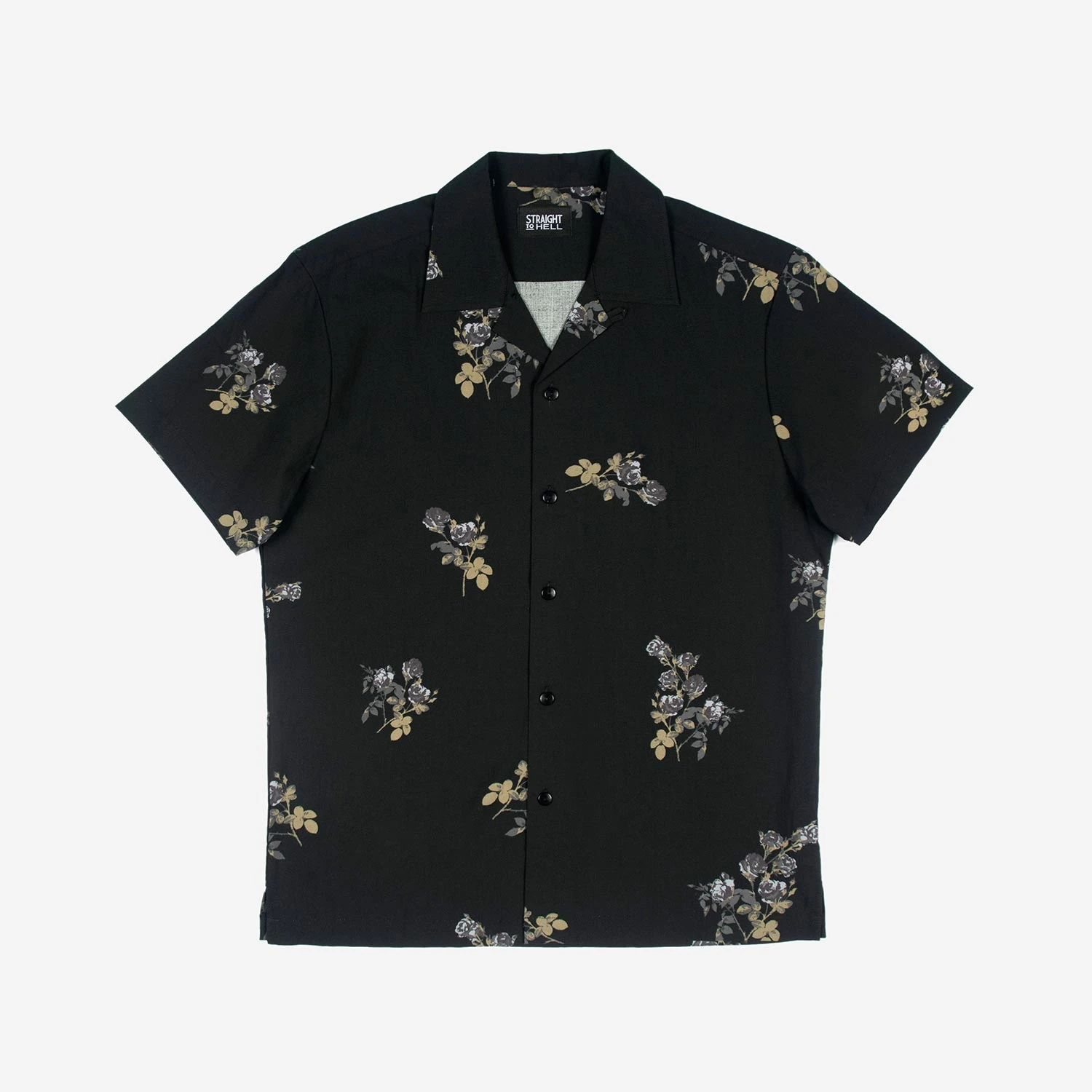 We created new, custom woven, STH Clothier cotton-modal blended fabric. The strong cotton offers durability, and the modal allows for a soft texture that drapes perfectly. Short sleeve button up camp shirt with our roses artwork and spread collar. Tailored for a slimmer fit but loose enough for comfort.