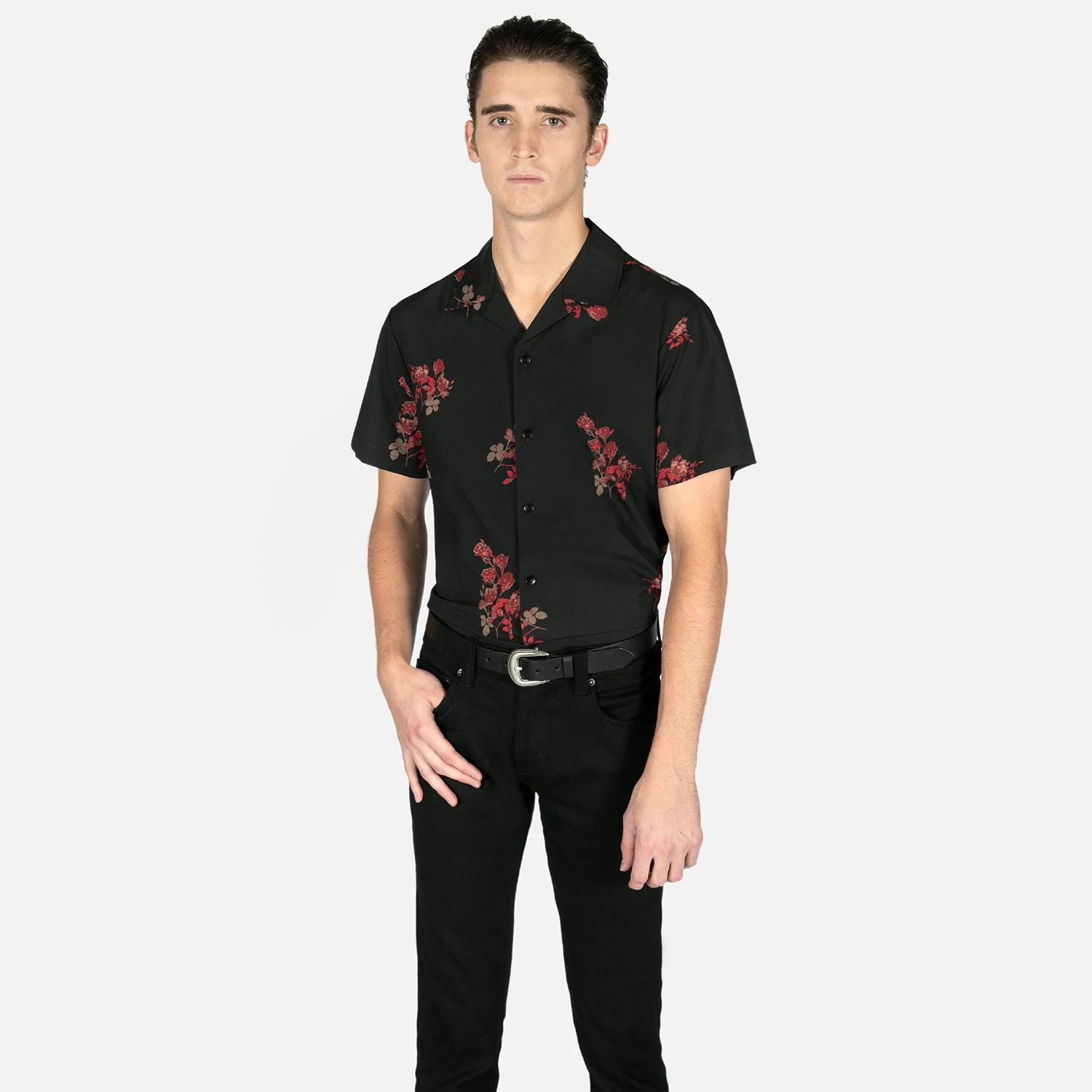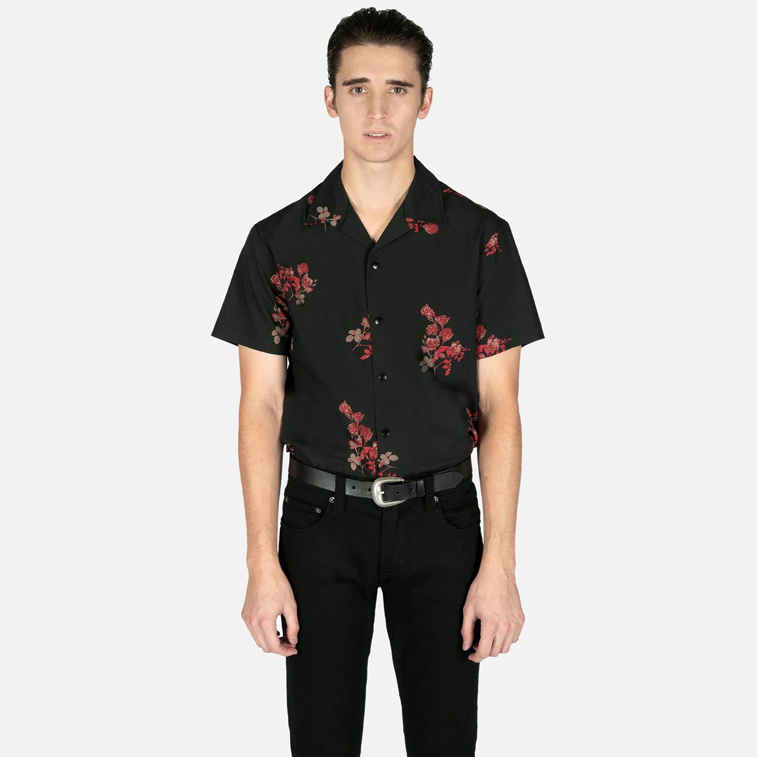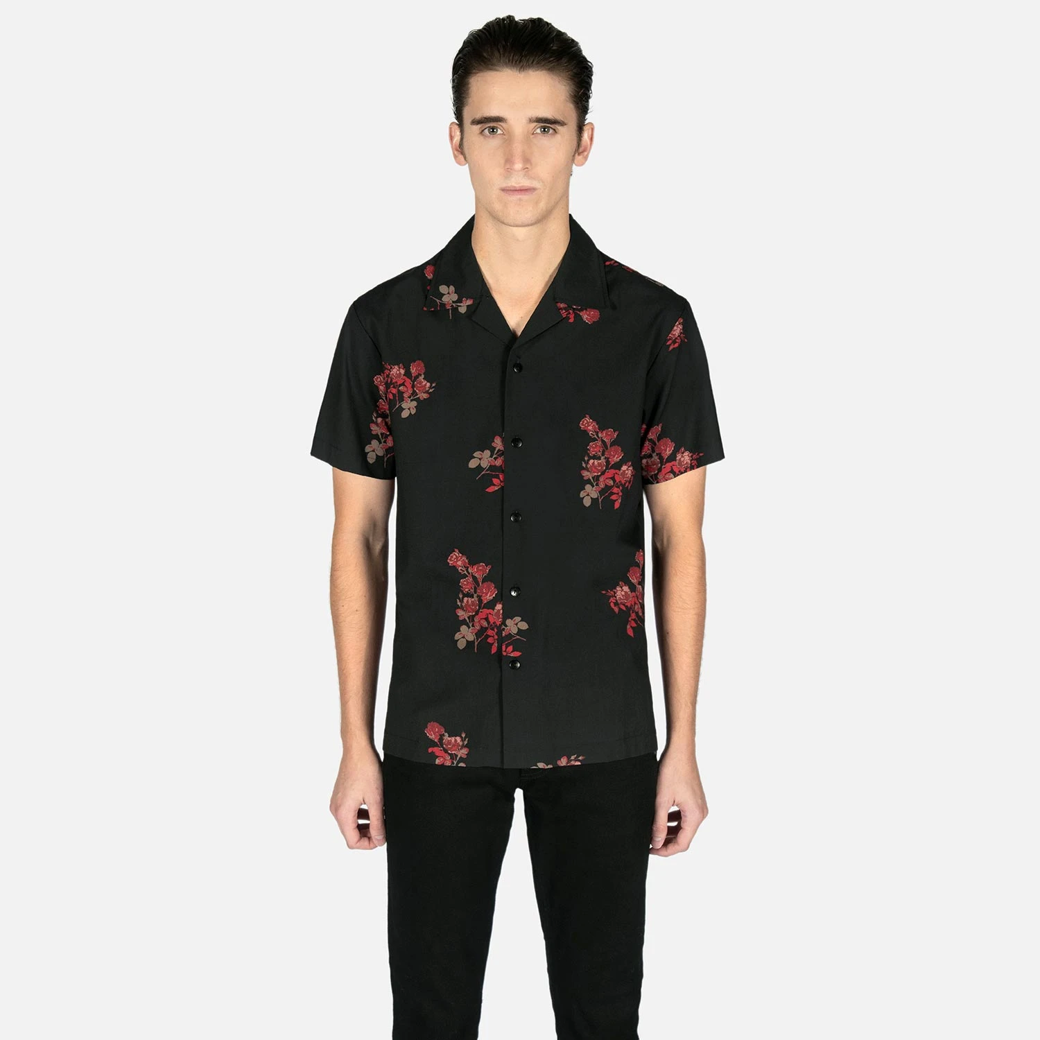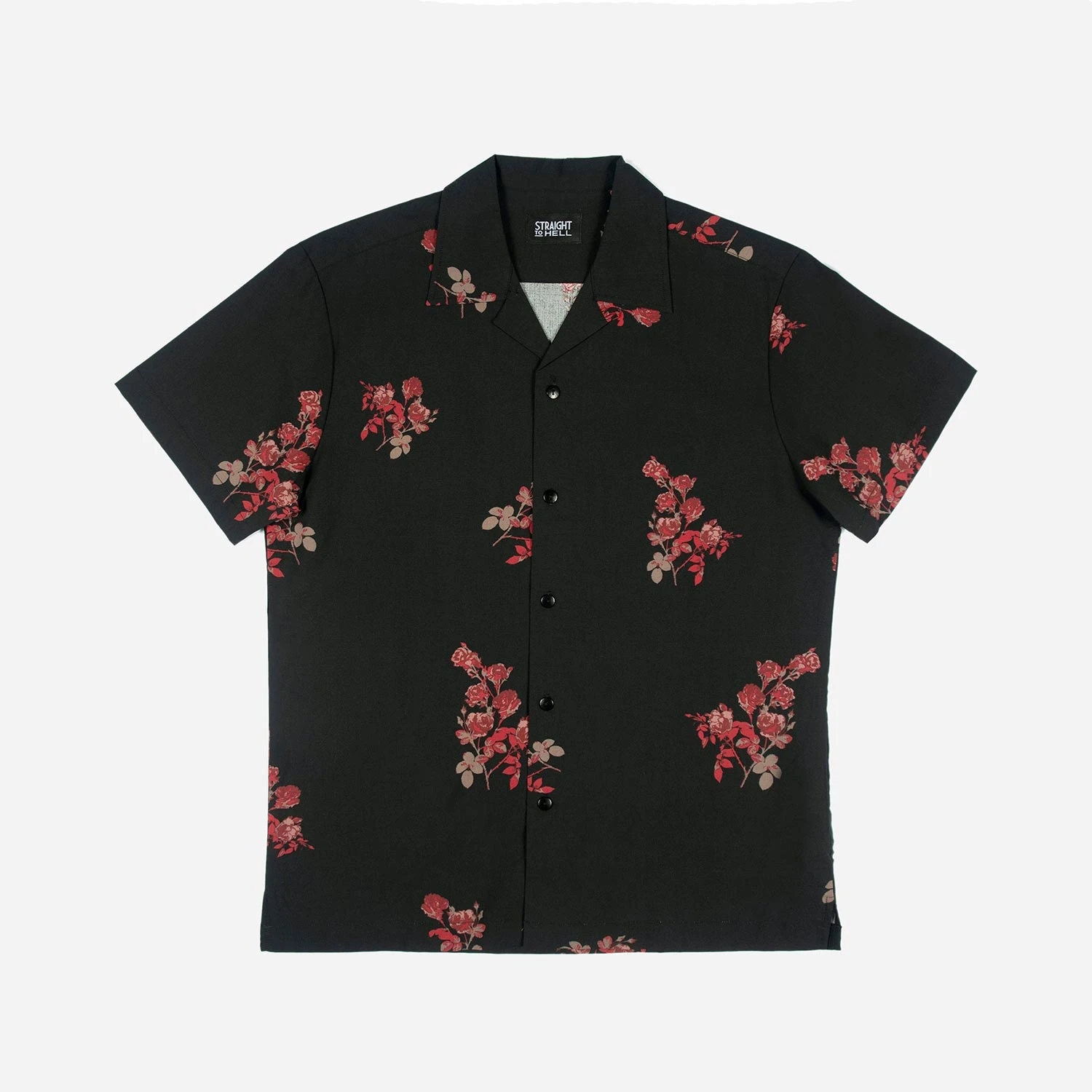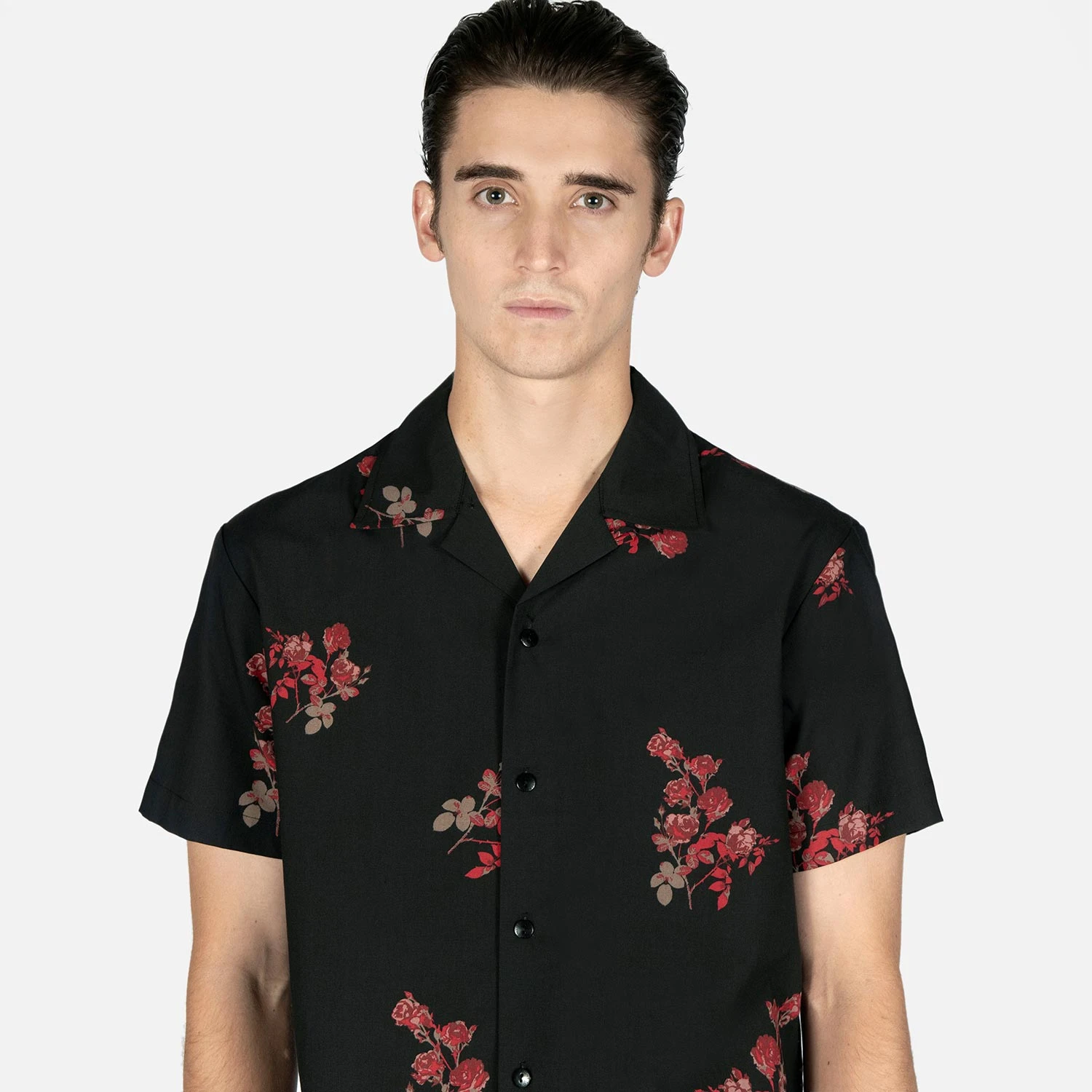 We created new, custom woven, STH Clothier cotton-modal blended fabric. The strong cotton offers durability, and the modal allows for a soft texture that drapes perfectly. Short sleeve button up camp shirt with our roses artwork and spread collar. Tailored for a slimmer fit but loose enough for comfort.
