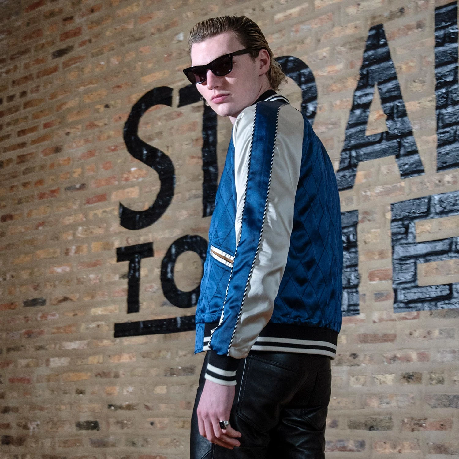 The Boogie is a timeless, blue and copper souvenir jacket. Reversible soft satin with twist piping and striped elastic. Chain-stitched diamond pattern. Unisex sizing.