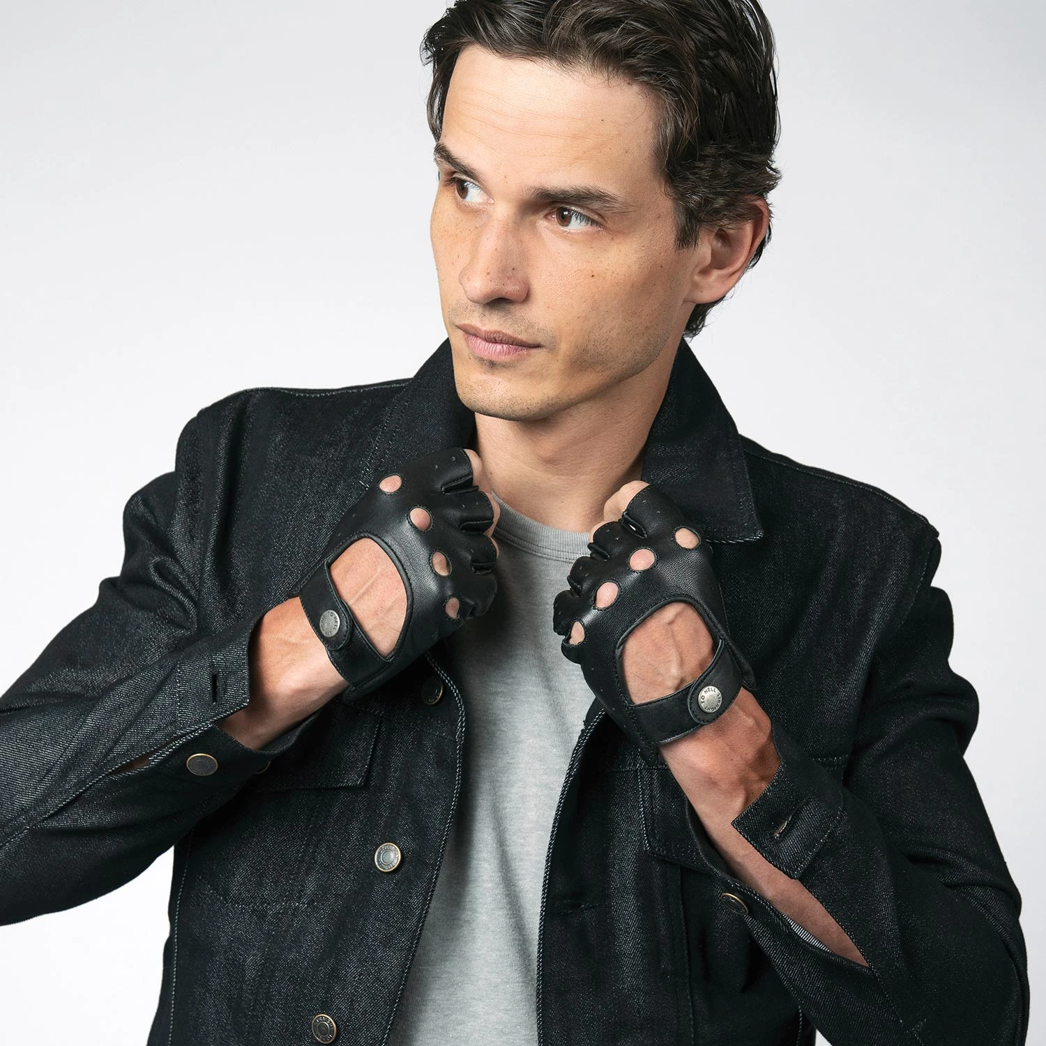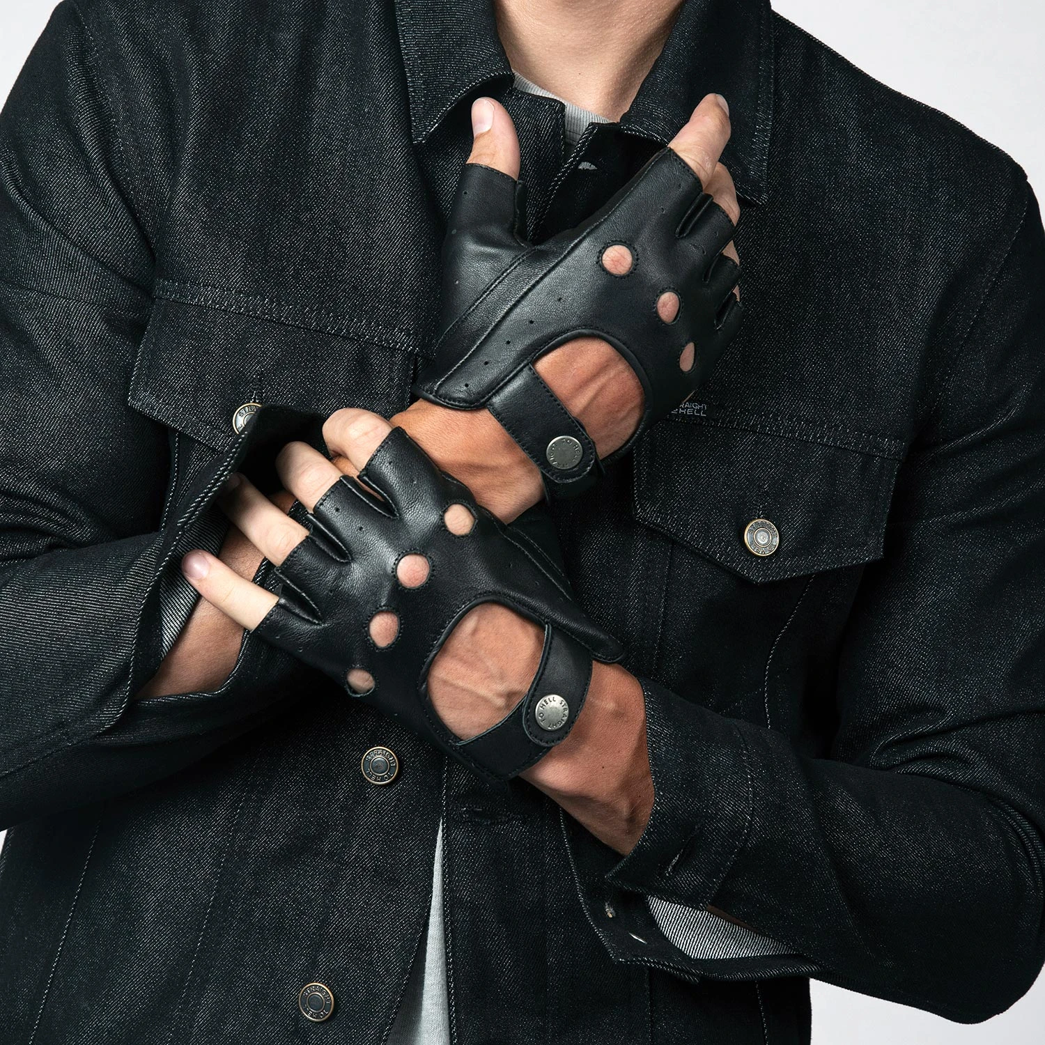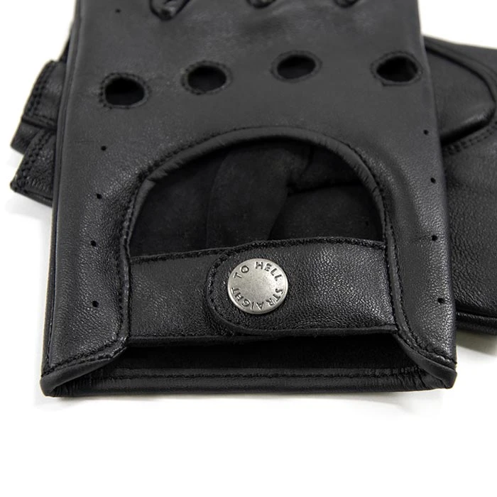 Leather fingerless gloves designed for men’s hands. Soft leather quickly conforms to your hand’s shape. Comfortable on the inside and outside for a smooth grip. Straight To Hell engraved gun metal snap closure.