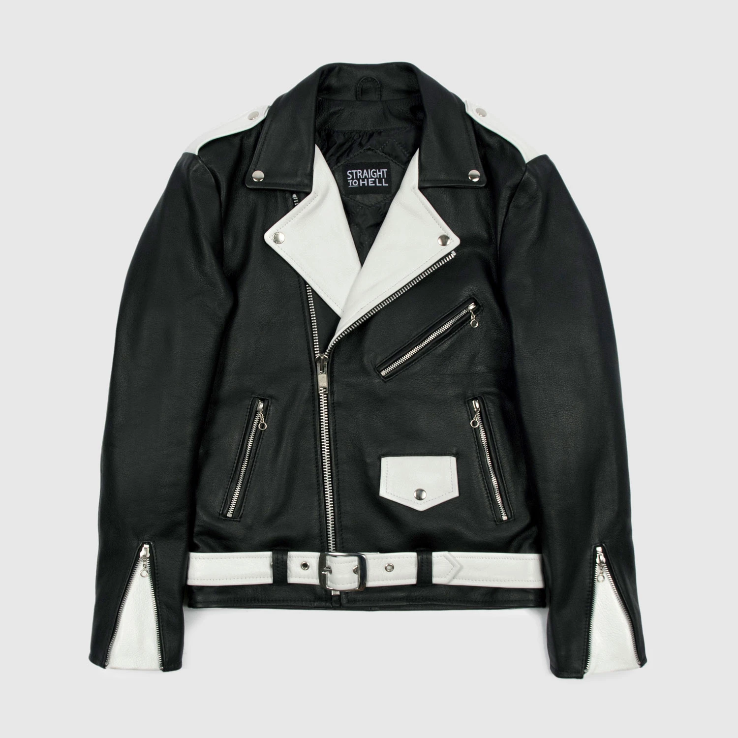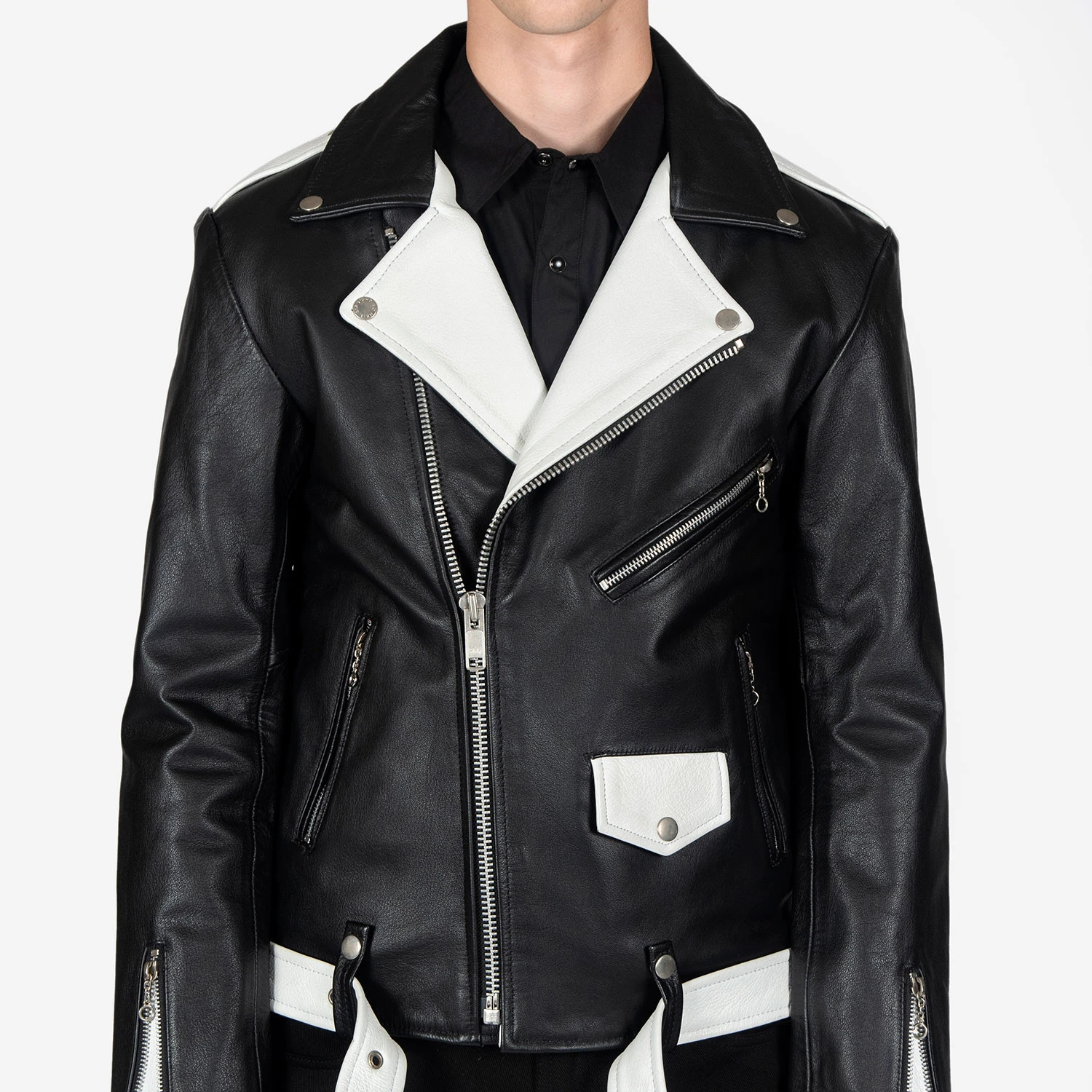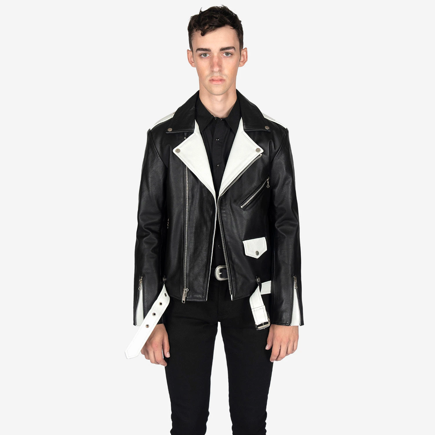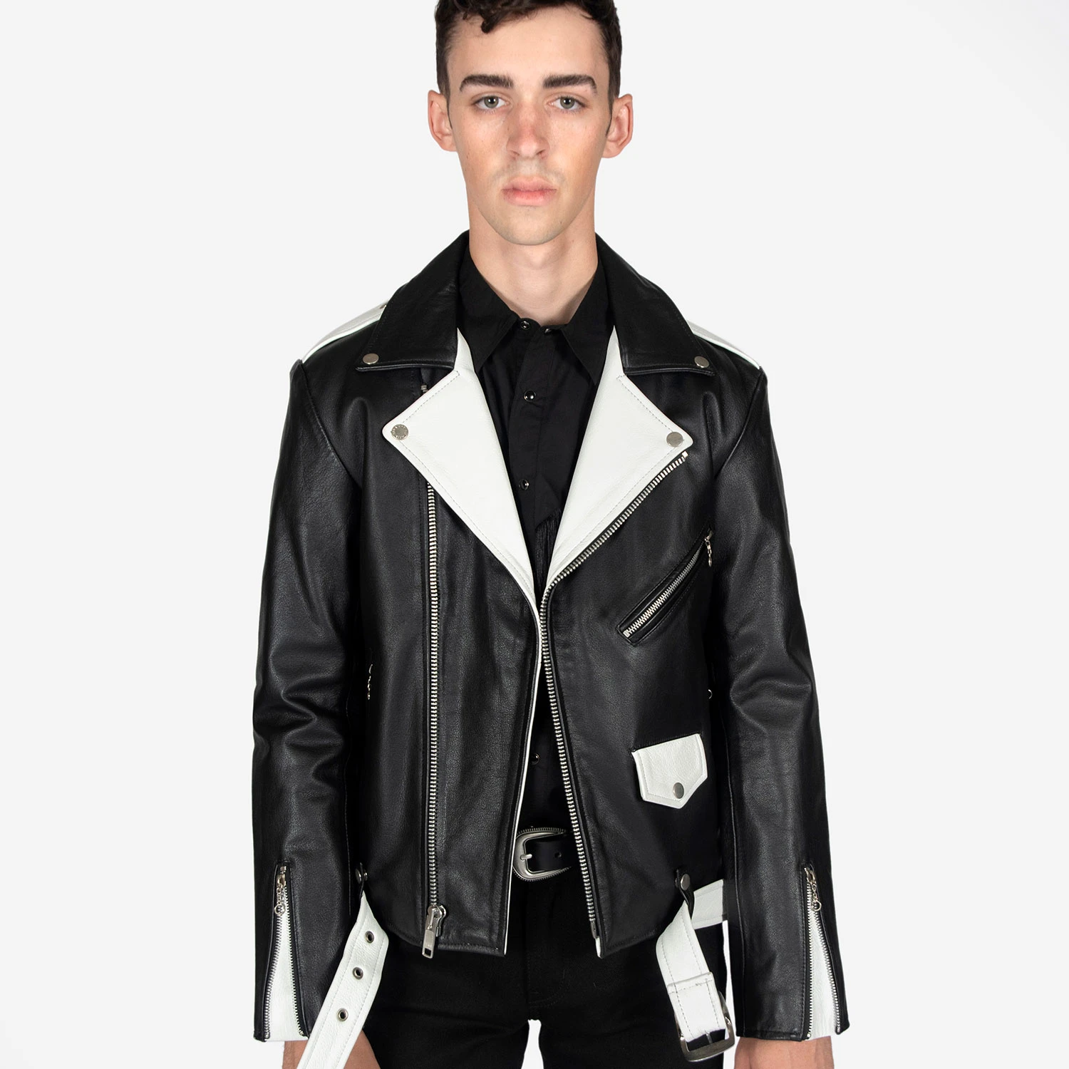 The Commando is our most traditional and recognizable leather jacket, featured here with black and white leather, a removable belt, and chain zipper pulls. The body features quilted lining and the sleeves are non-quilted. Fitted, premium leather relaxes and conforms to your shape and breaks in perfectly.