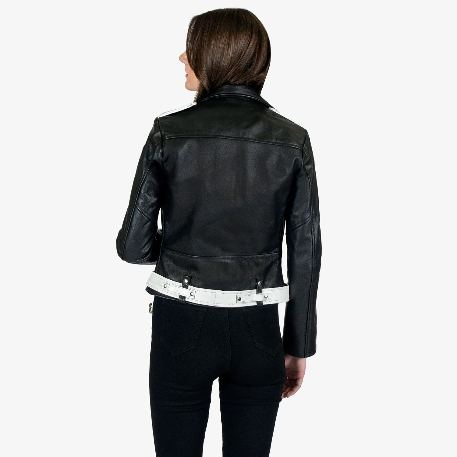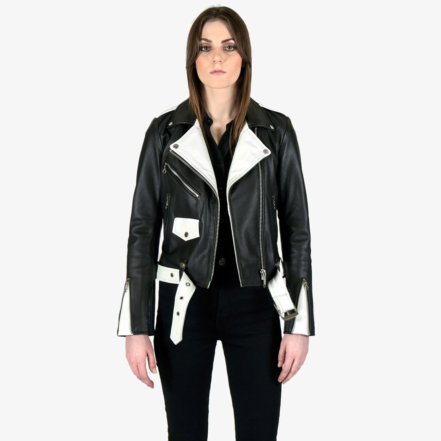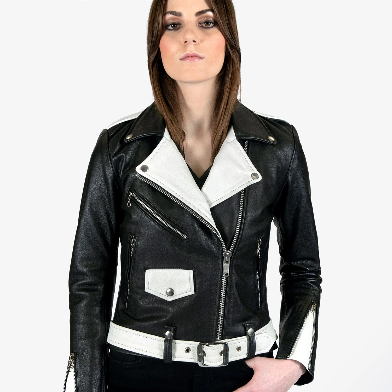 The Commando is our most traditional and recognizable leather jacket, featured here with black and white leather, a removable belt, and chain zipper pulls. The body features quilted lining and the sleeves are non-quilted. Fitted, premium leather relaxes and conforms to your shape and breaks in perfectly.