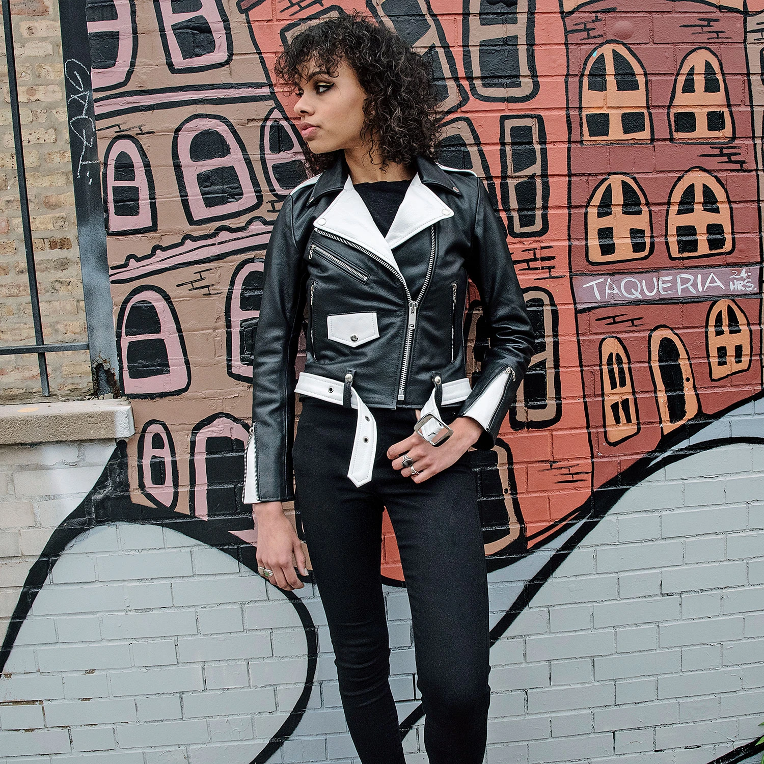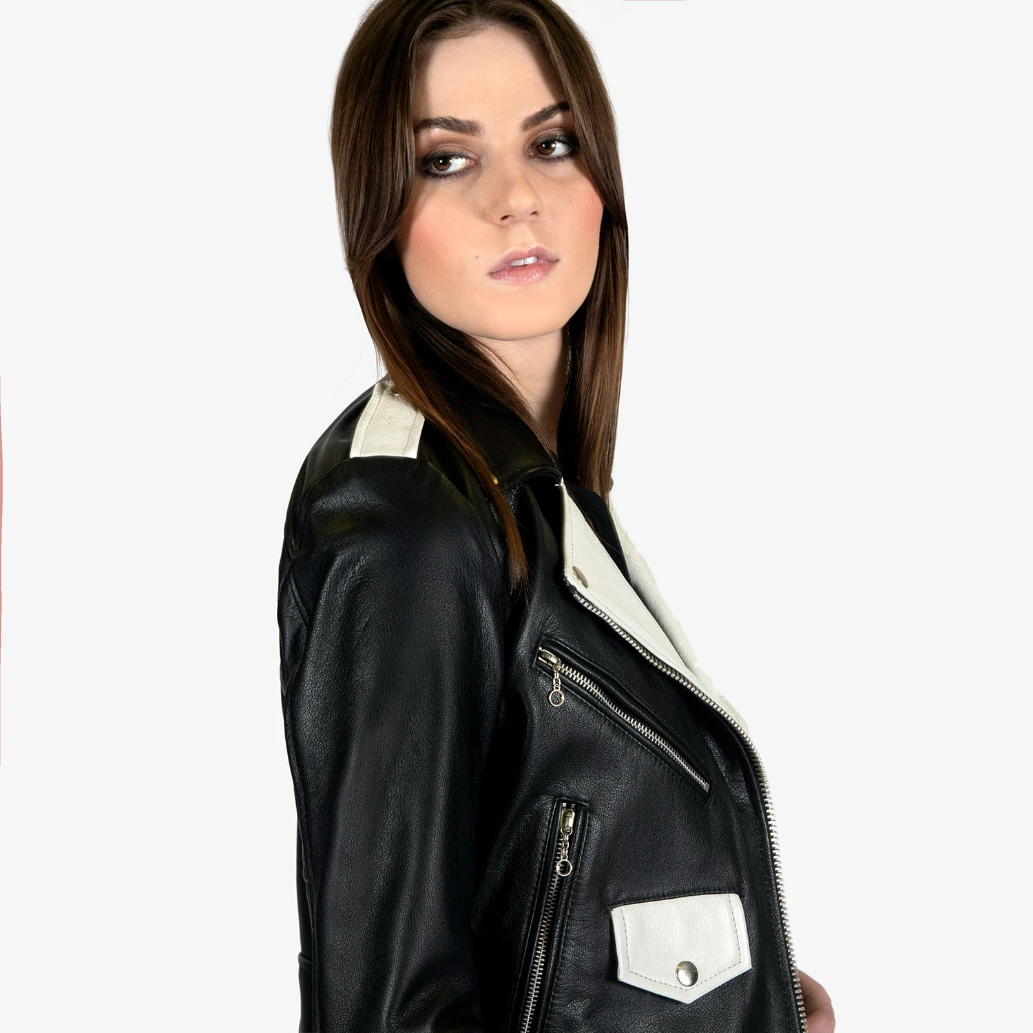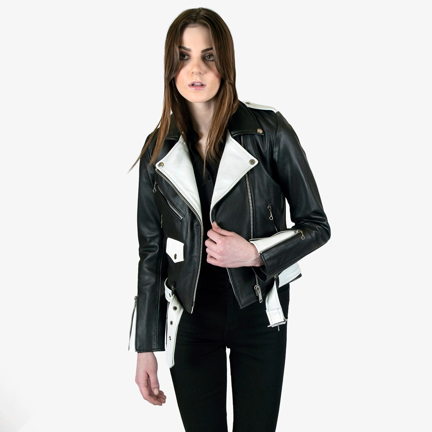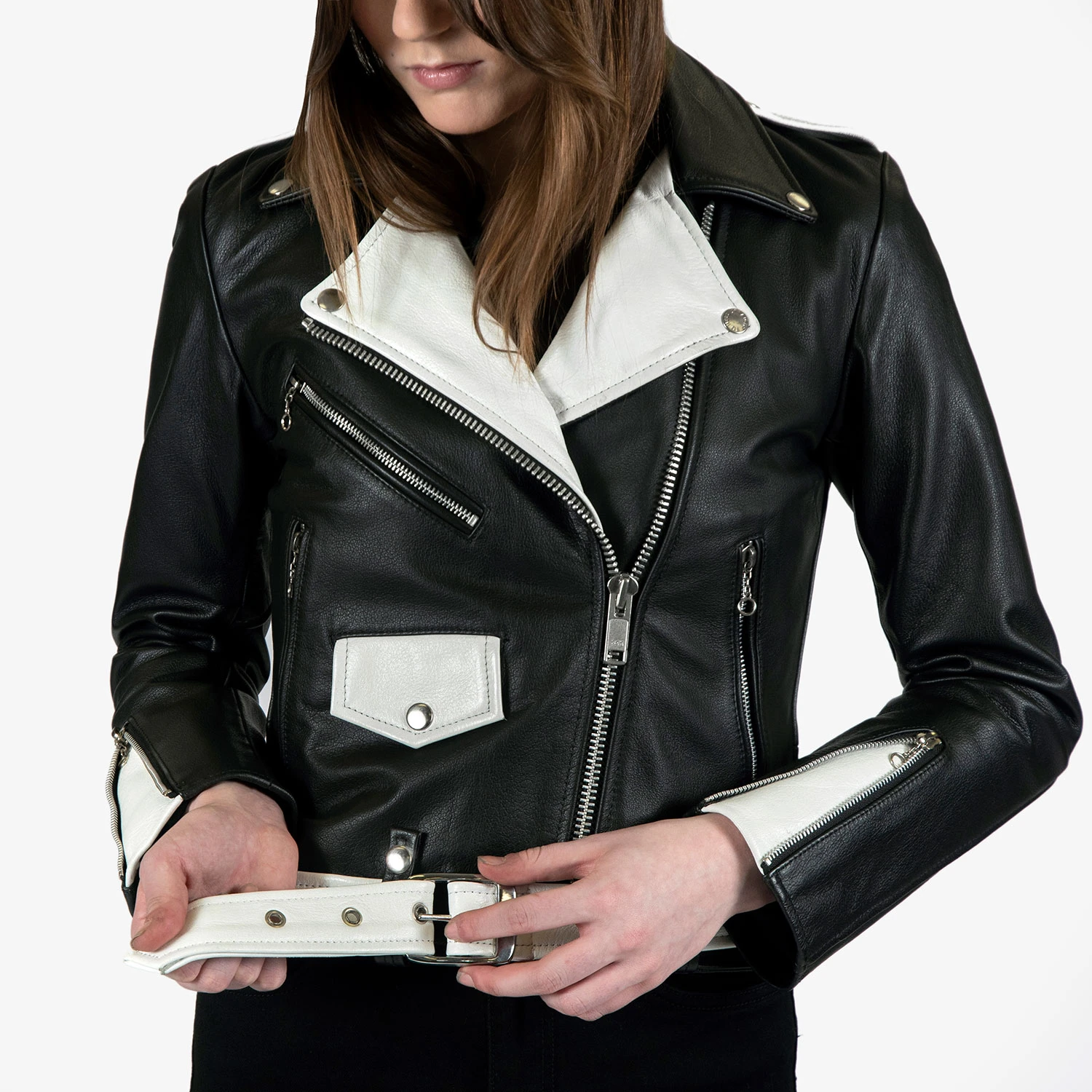 The Commando is our most traditional and recognizable leather jacket, featured here with black and white leather, a removable belt, and chain zipper pulls. The body features quilted lining and the sleeves are non-quilted. Fitted, premium leather relaxes and conforms to your shape and breaks in perfectly.