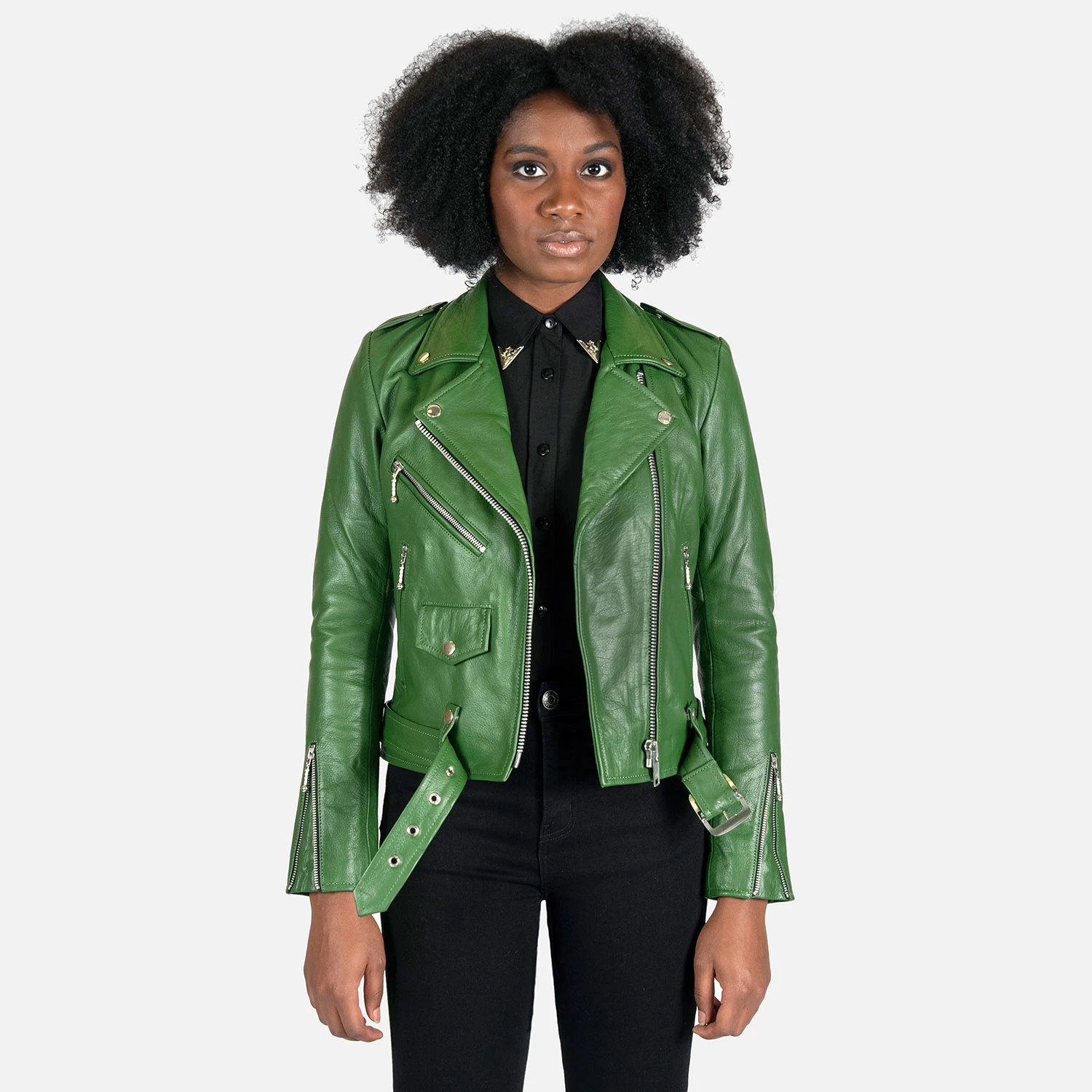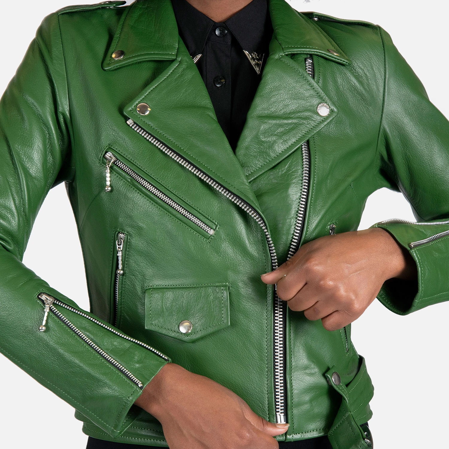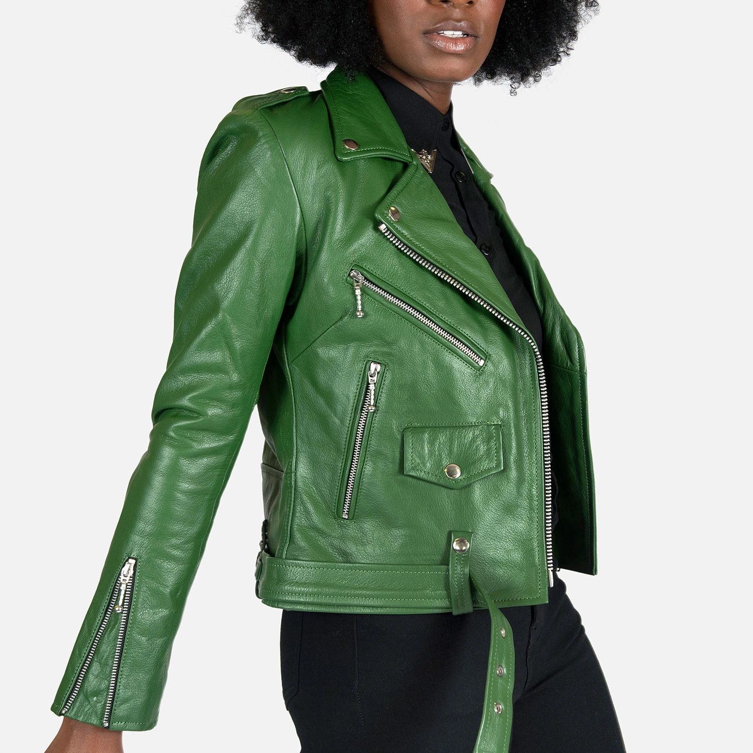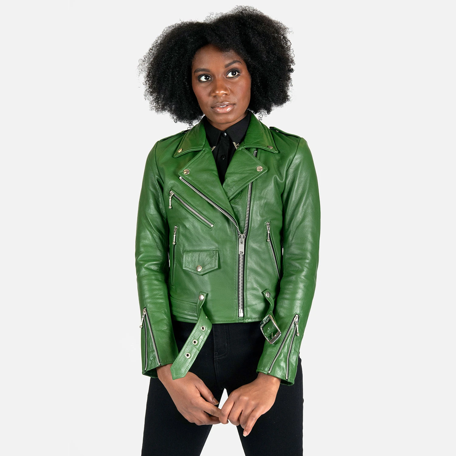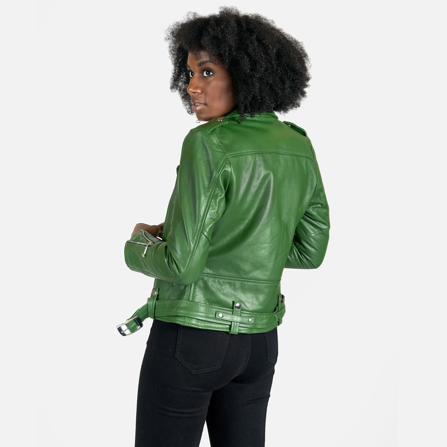 The Commando is our most traditional and recognizable leather jacket, now in cactus green leather with a removable belt and polished nickel ball pull zippers. The body features quilted lining and the sleeves are non-quilted. Fitted, premium leather relaxes and conforms to your shape and breaks in perfectly.
