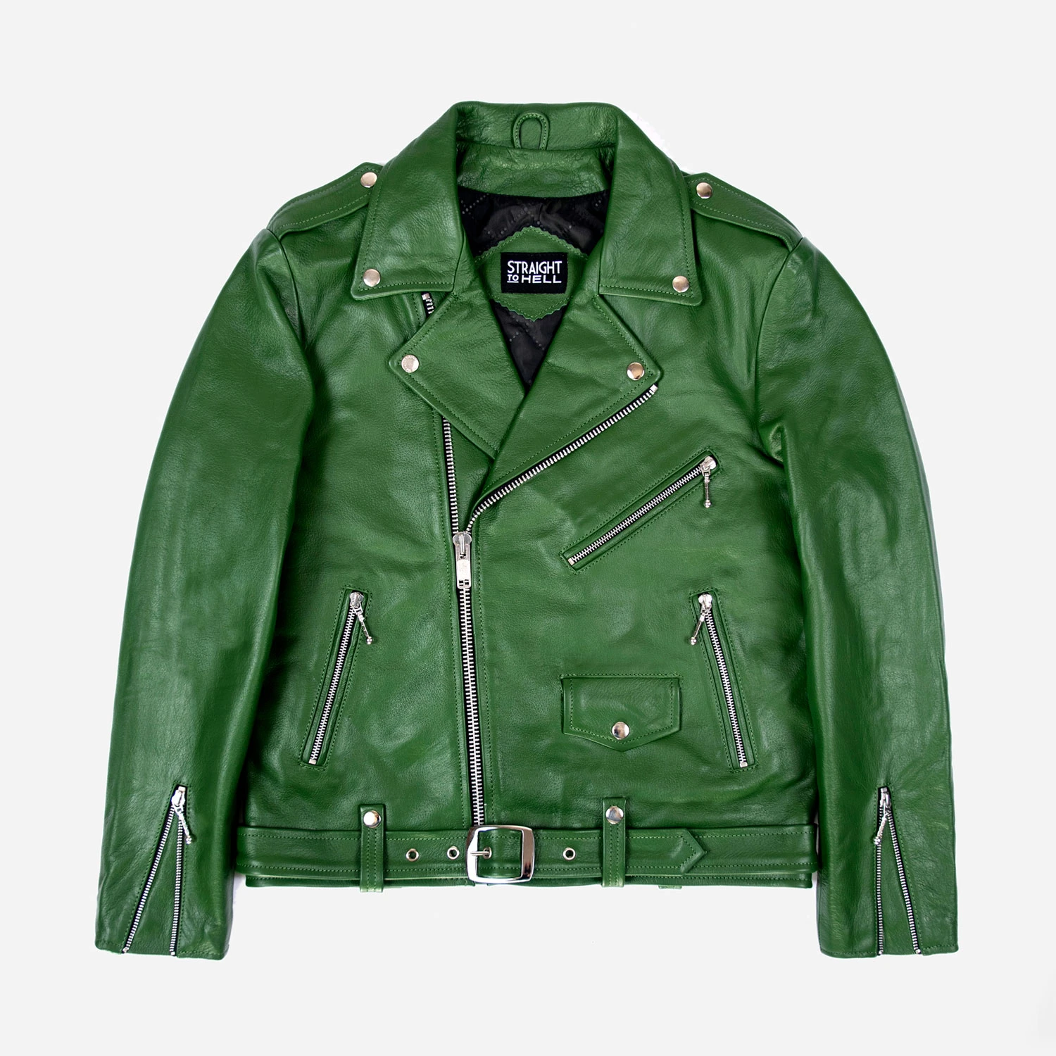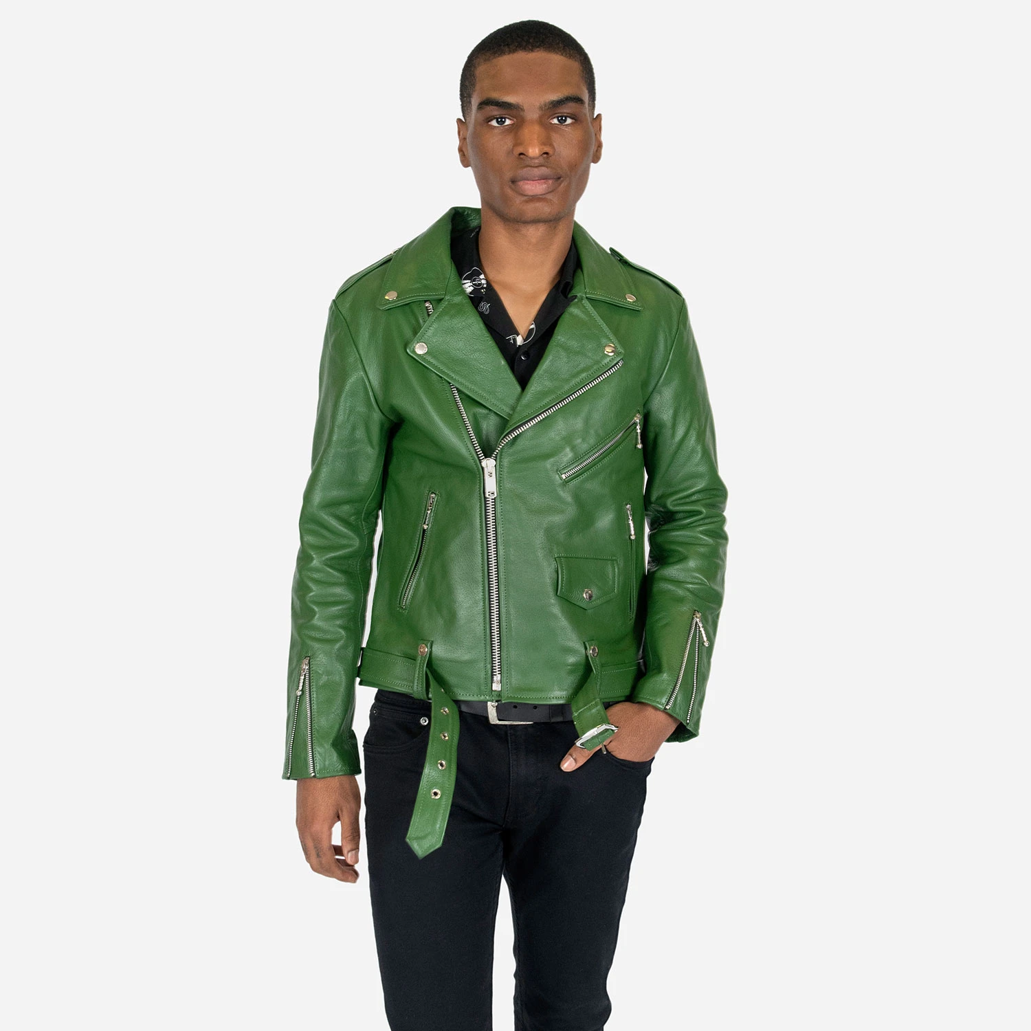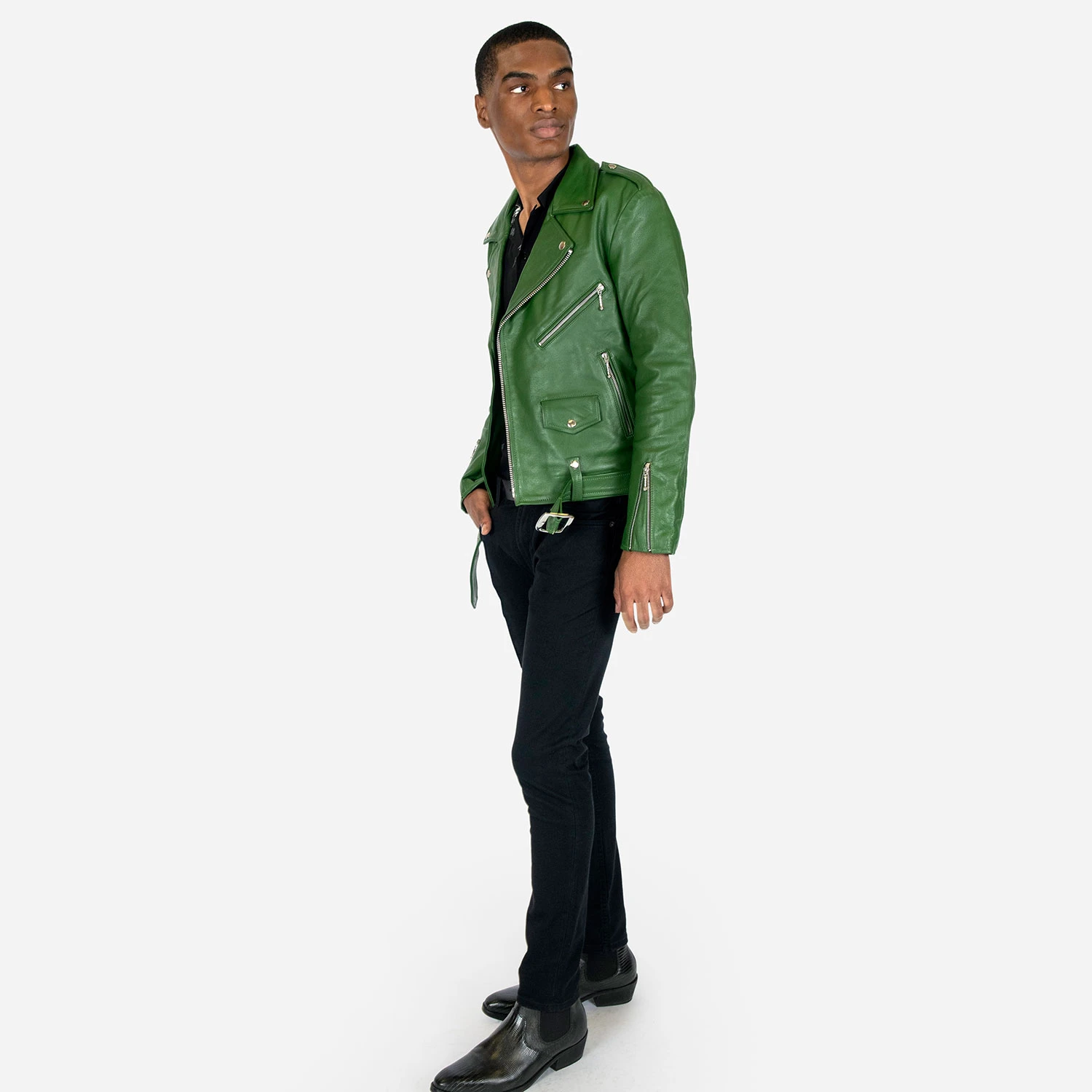 The Commando is our most traditional and recognizable leather jacket, now in cactus green leather with a removable belt and polished nickel ball pull zippers. The body features quilted lining and the sleeves are non-quilted. Fitted, premium leather relaxes and conforms to your shape and breaks in perfectly.