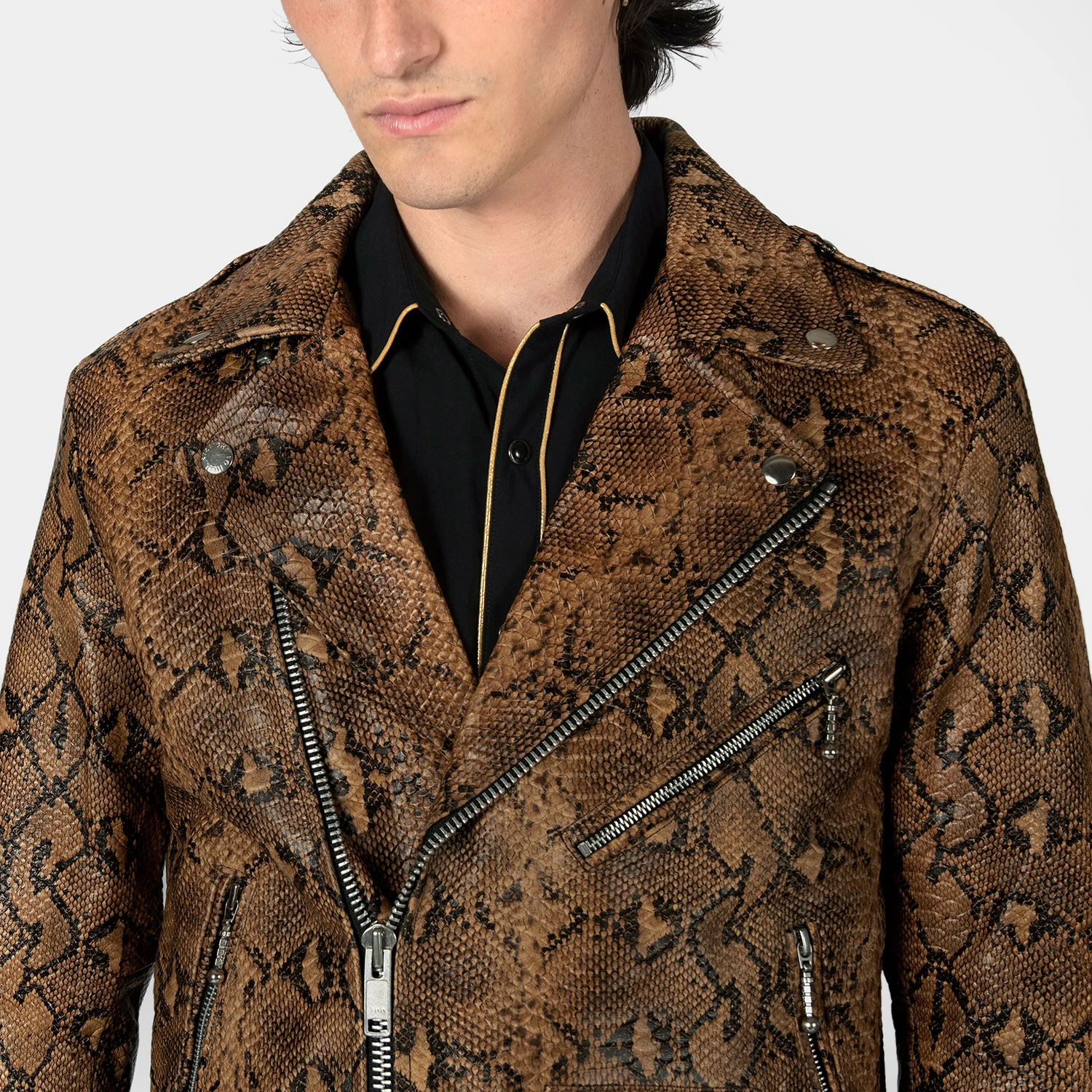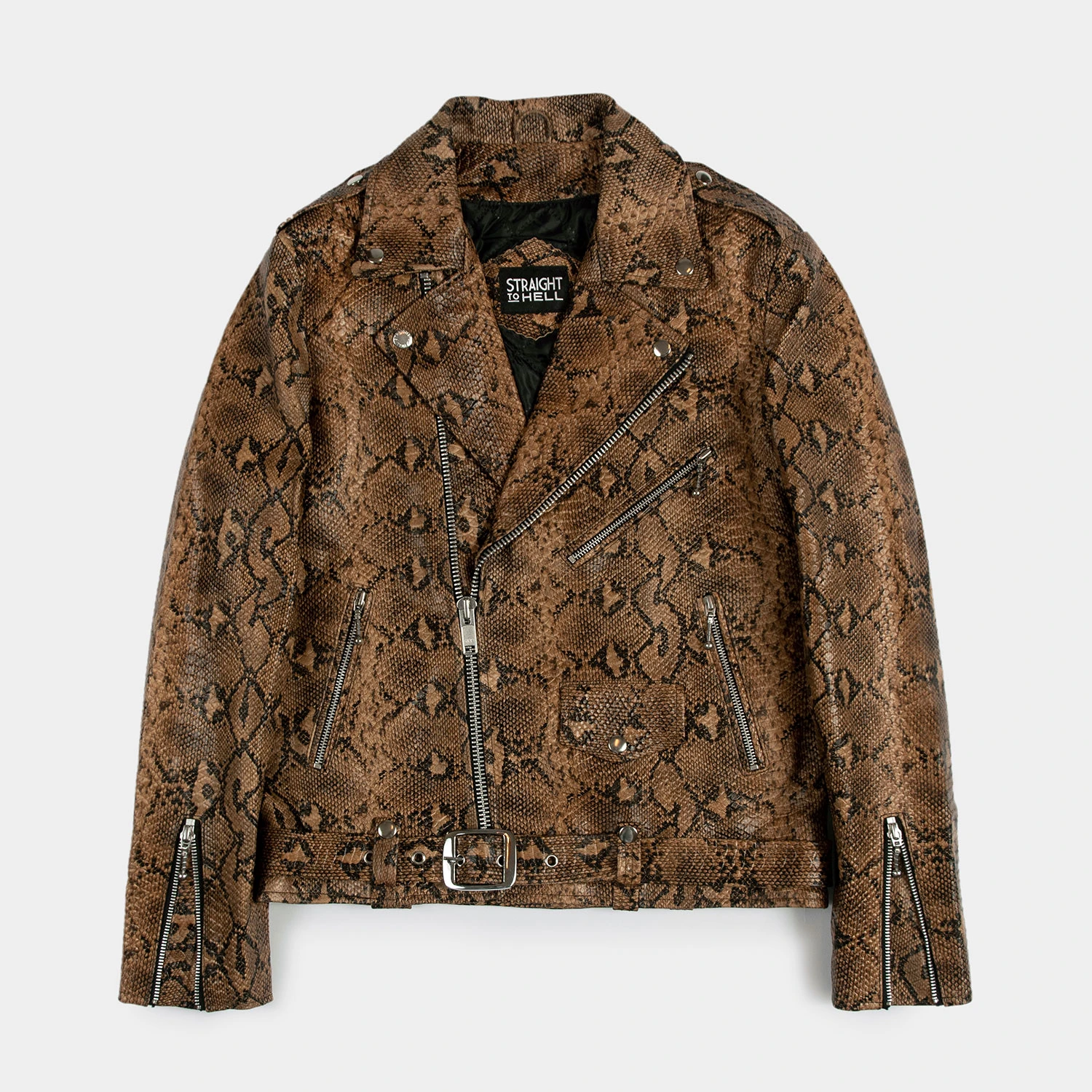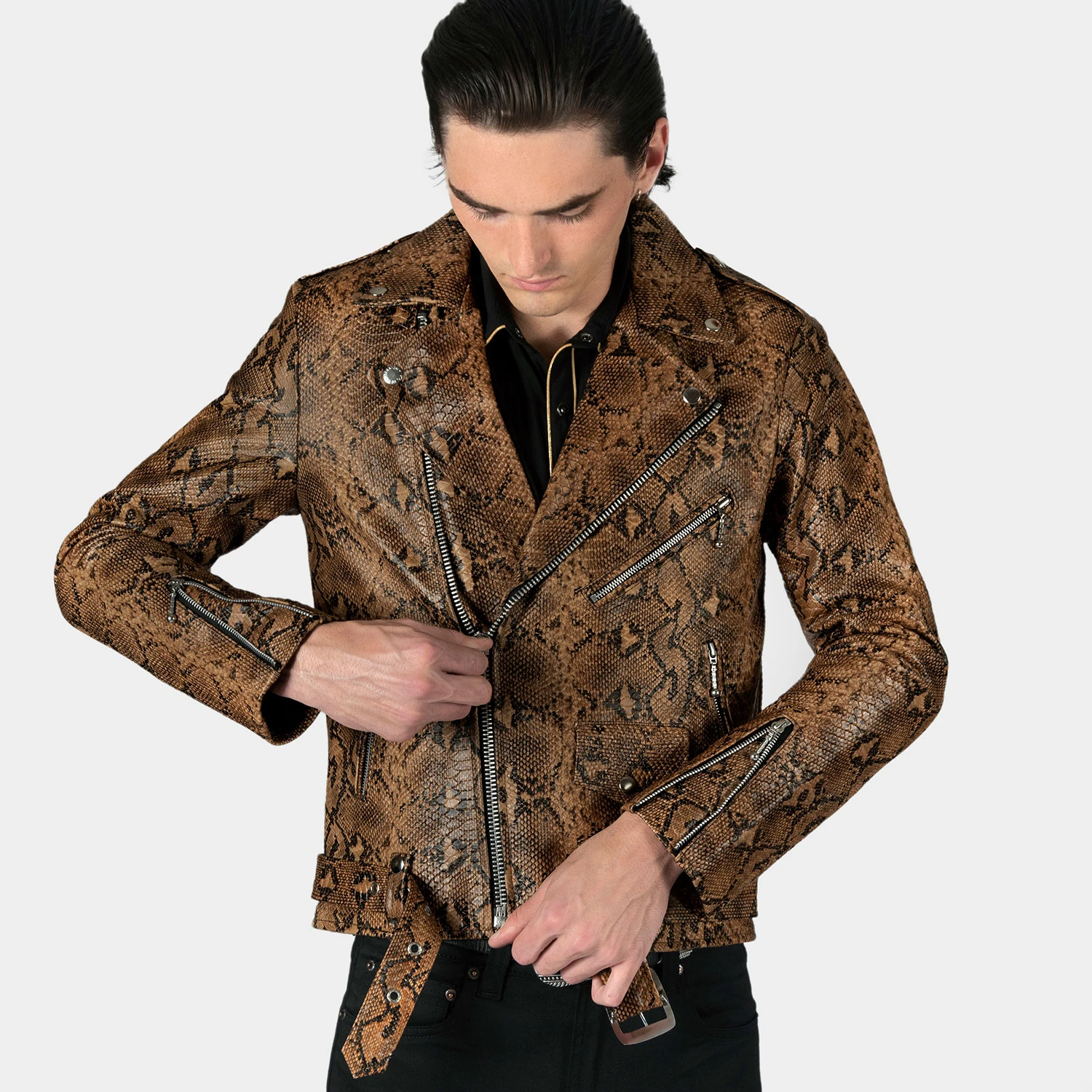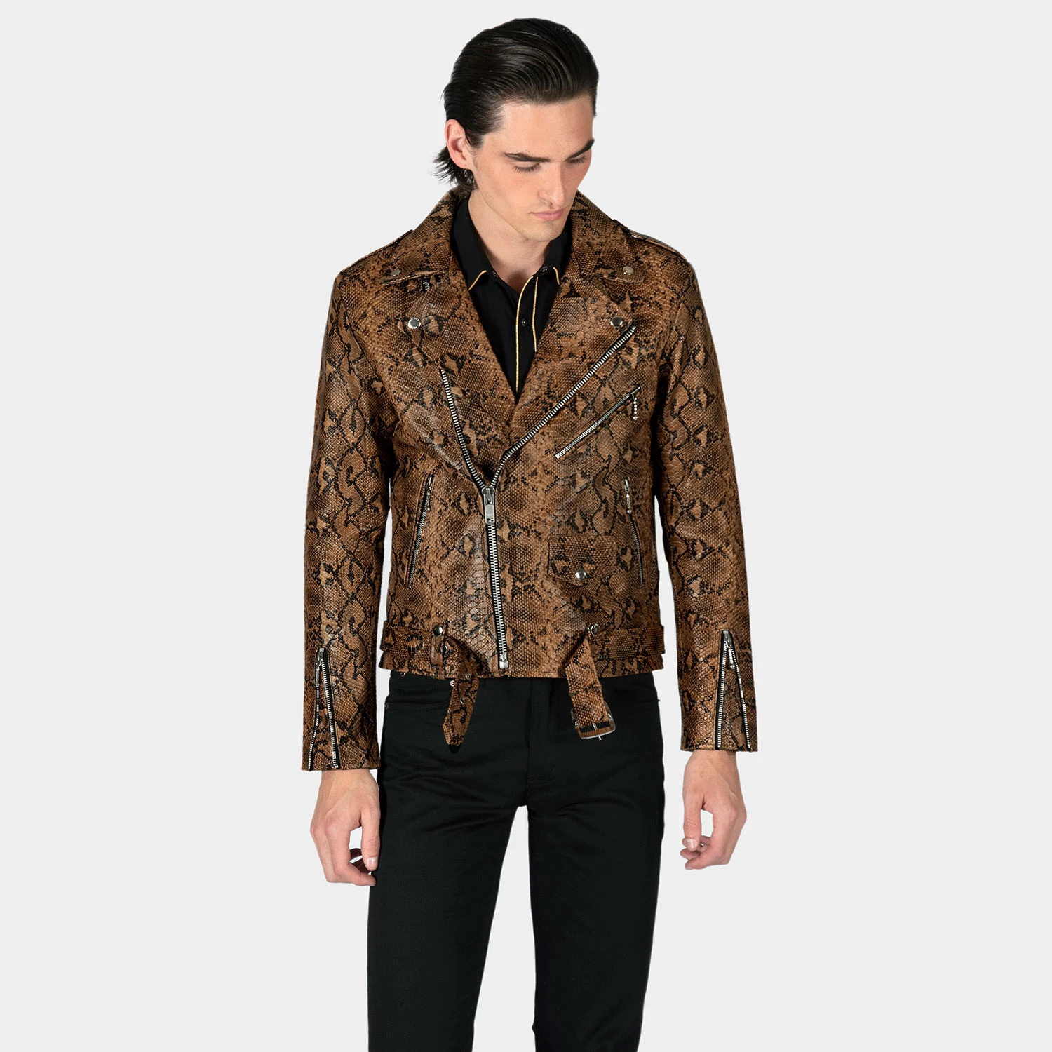 The Commando is our most traditional and recognizable leather jacket, now in snakeskin pattern leather. We worked extremely hard developing this premium leather featuring a standout design and texture. Old school ball pull zippers on pockets and cuffs. The Commando relaxes and conforms to your shape and breaks in perfectly.