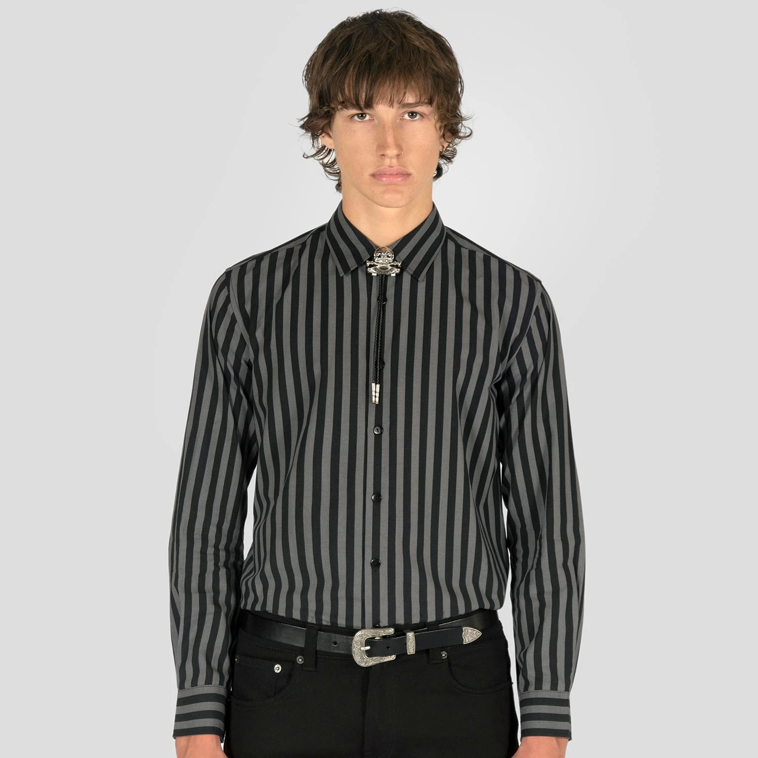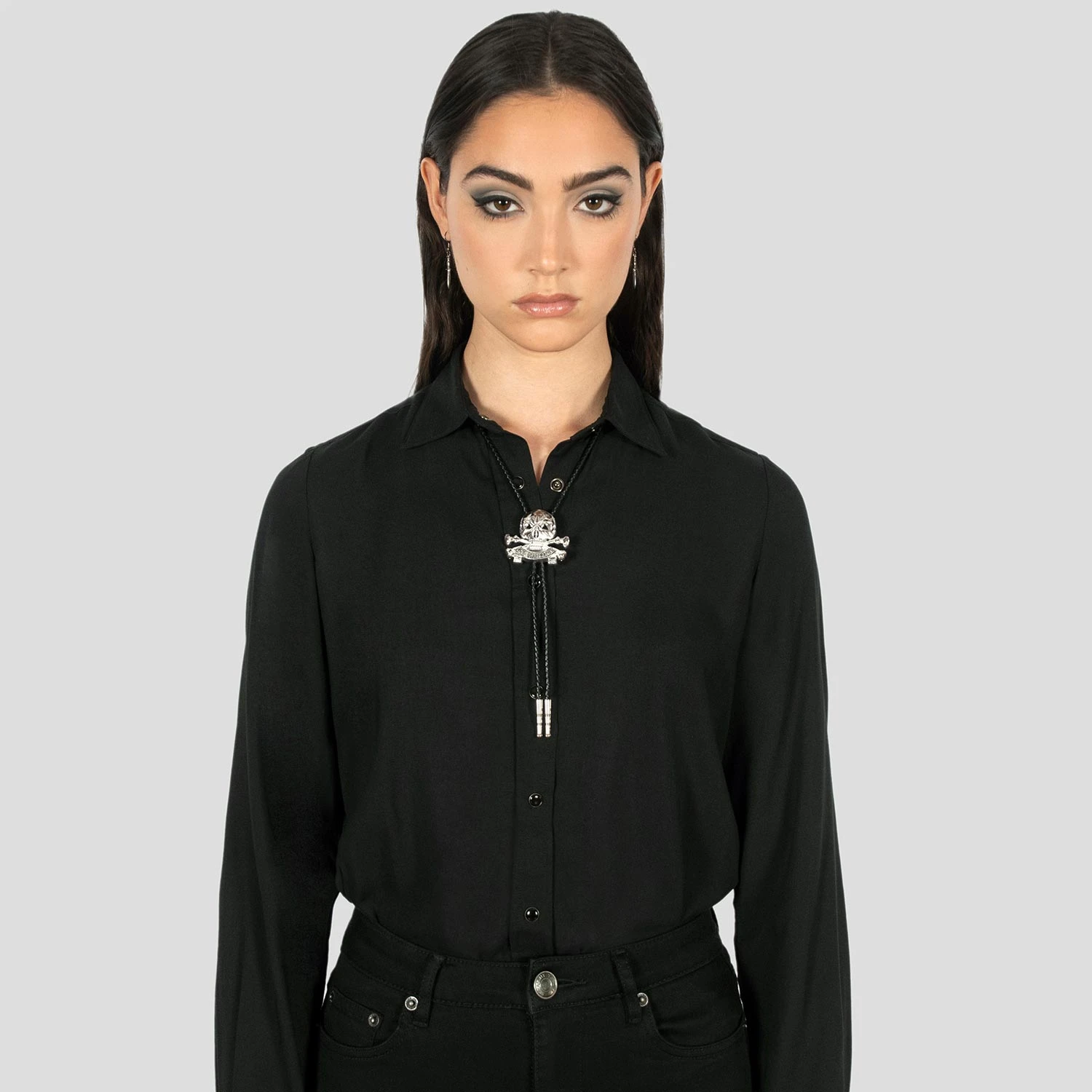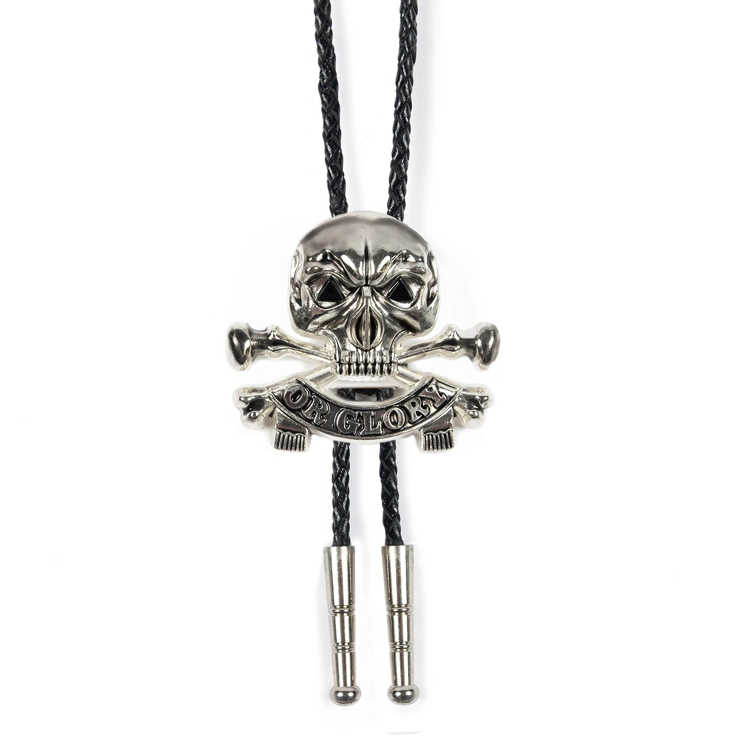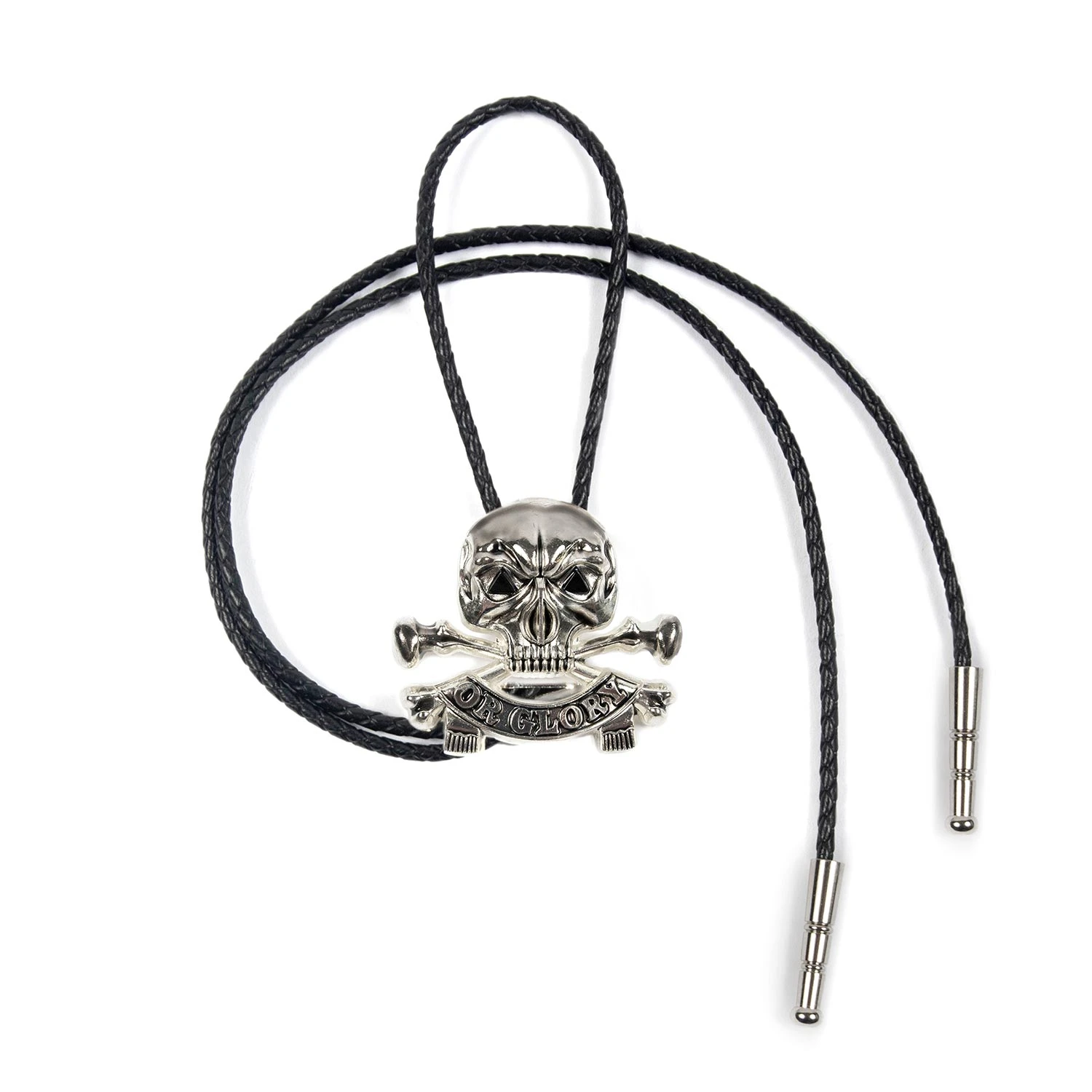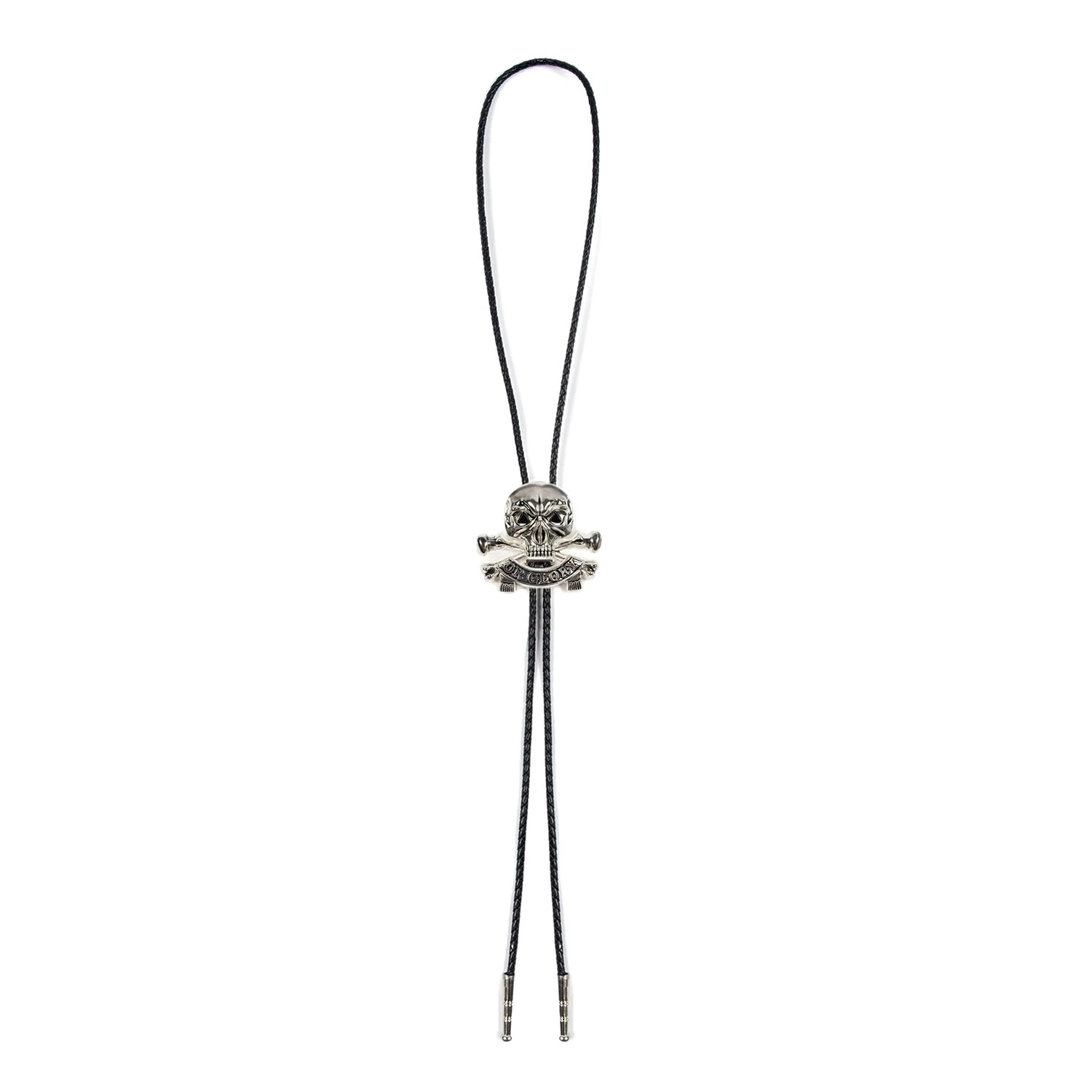 The Death or Glory bolo tie features onyx gemstone triangle eyes on a 2 inch wide, silver-plated skull and bones with black leather rope. The Death or Glory can be worn as a loose or secured tie or as a necklace. Packaged in an STH custom box.