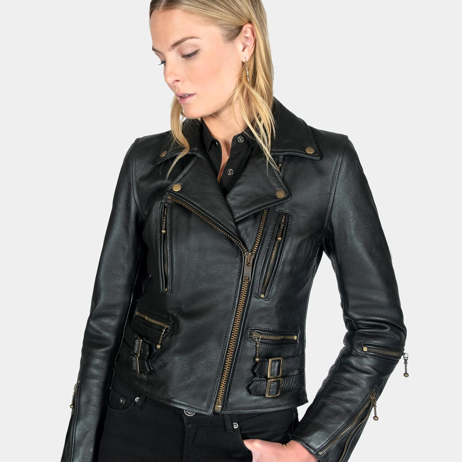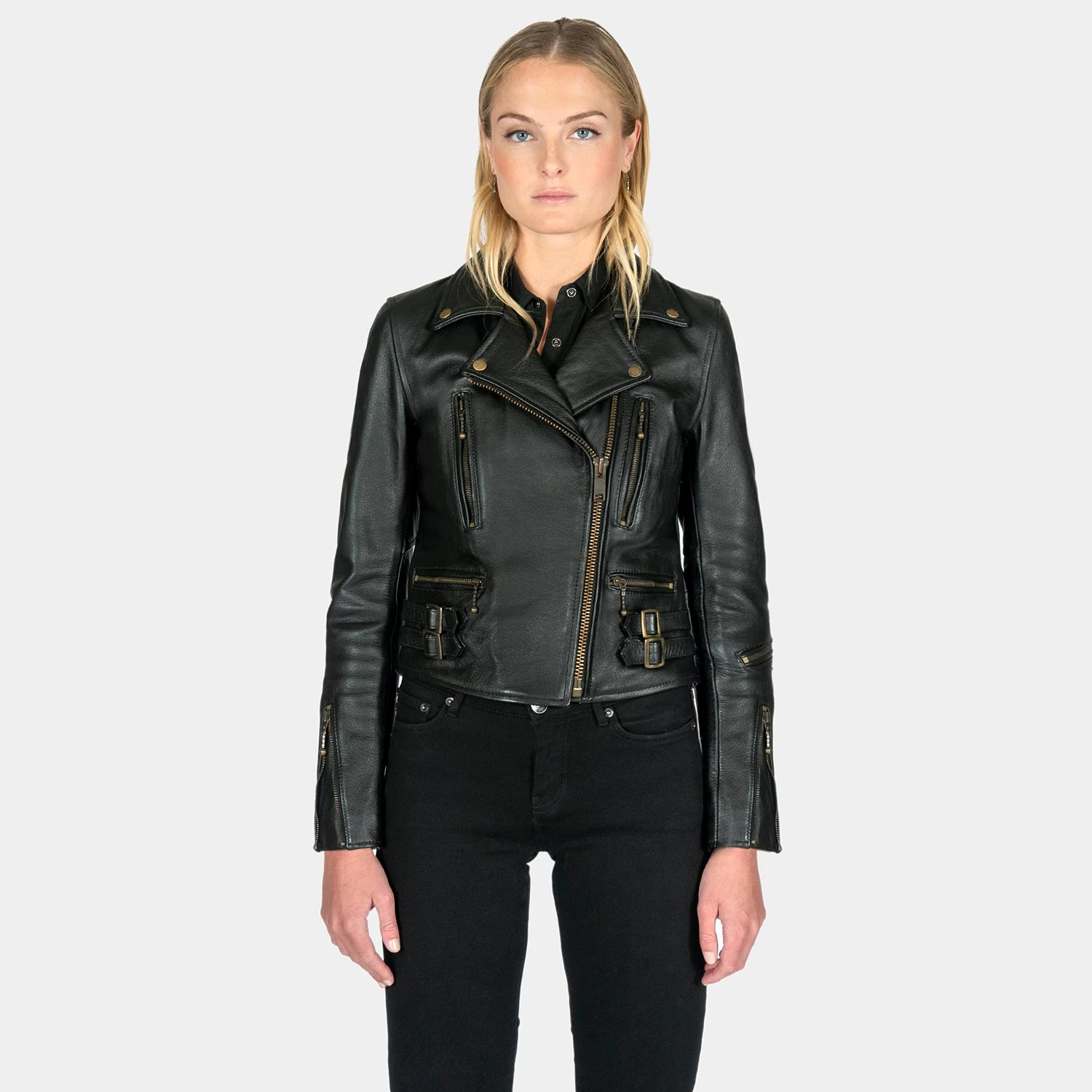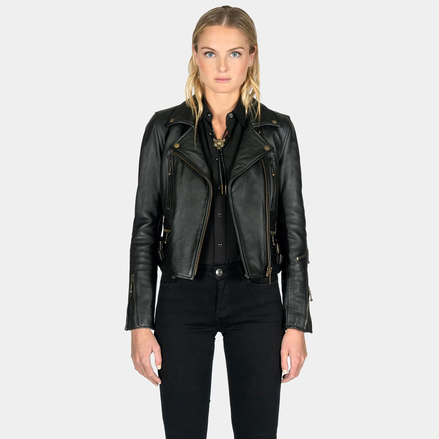 The Defector leather jacket combines old school style with stand-out features, notably a forearm zipper, antique brass ball pull zippers, side straps, and a curved hem. The body features quilted lining and the sleeves are non-quilted. Fitted, premium leather relaxes and conforms to your shape and breaks in perfectly.