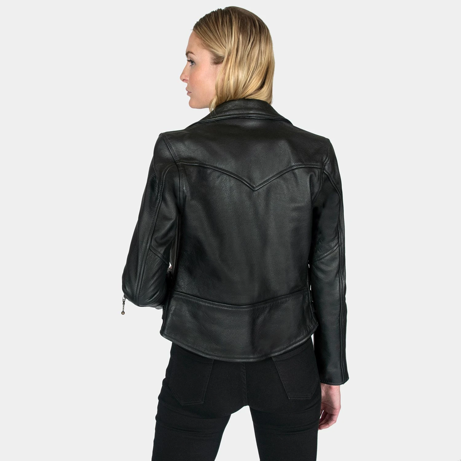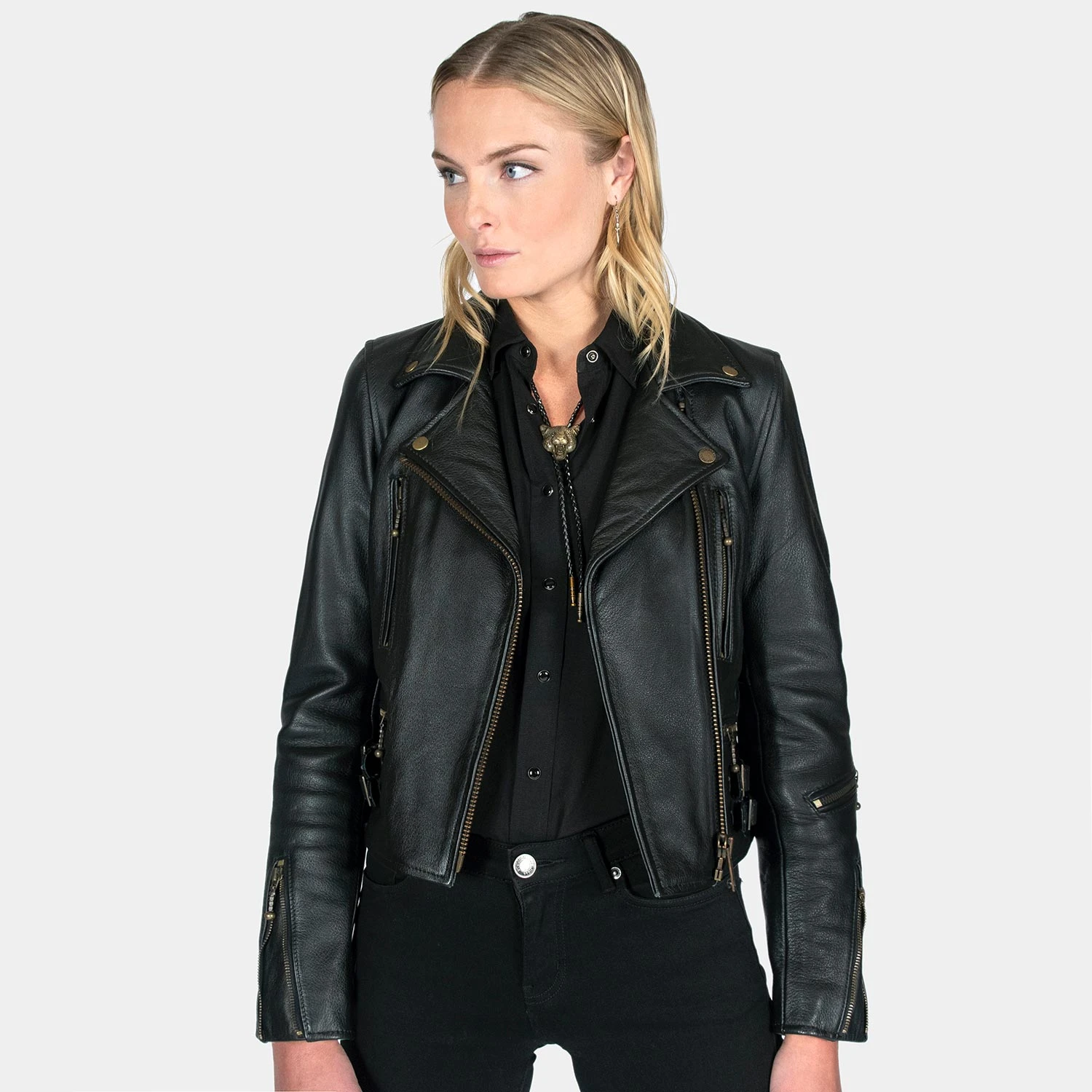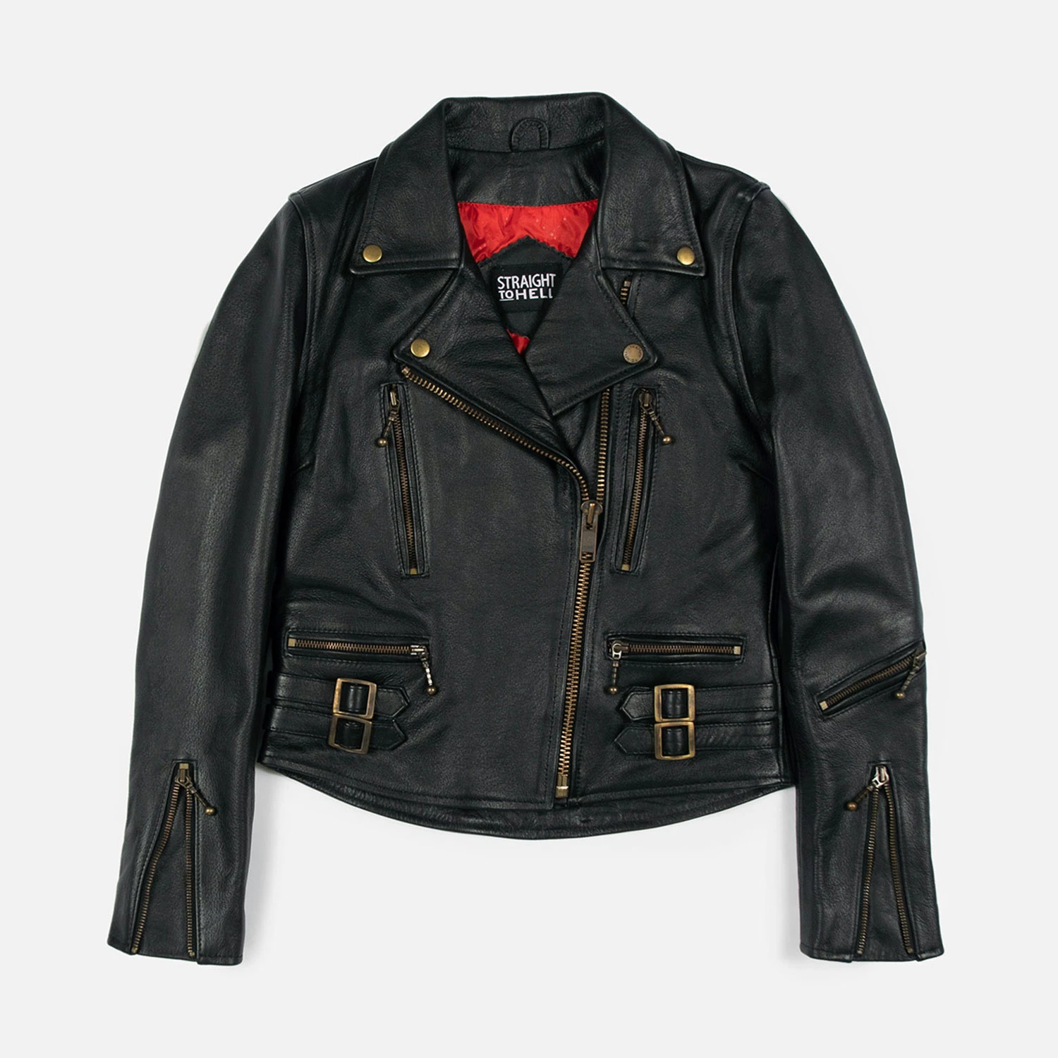 The Defector leather jacket combines old school style with stand-out features, notably a forearm zipper, antique brass ball pull zippers, side straps, and a curved hem. The body features quilted lining and the sleeves are non-quilted. Fitted, premium leather relaxes and conforms to your shape and breaks in perfectly.