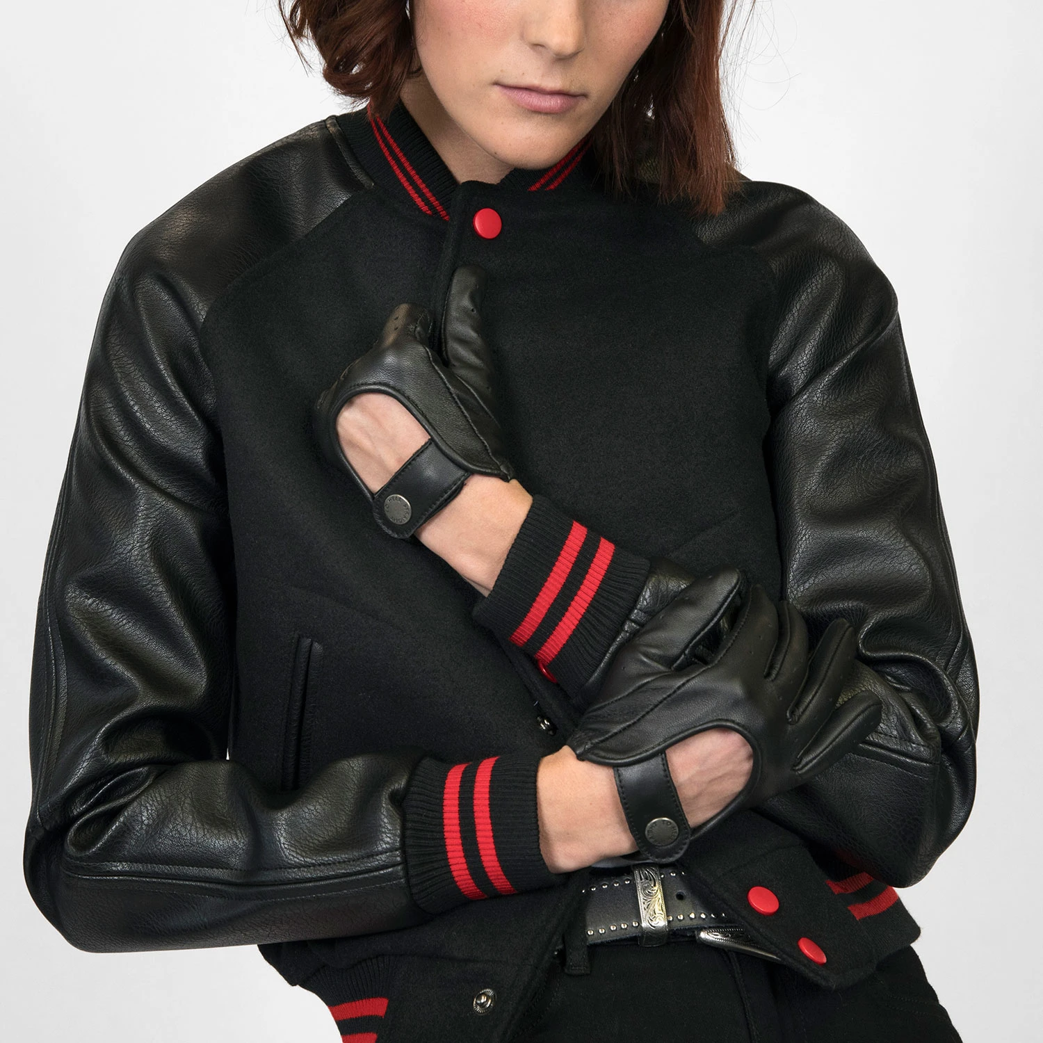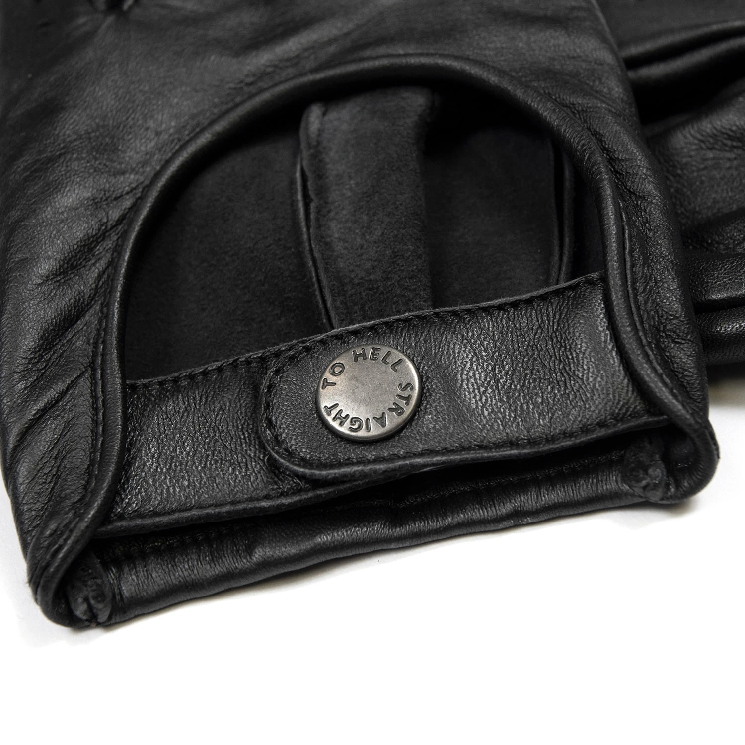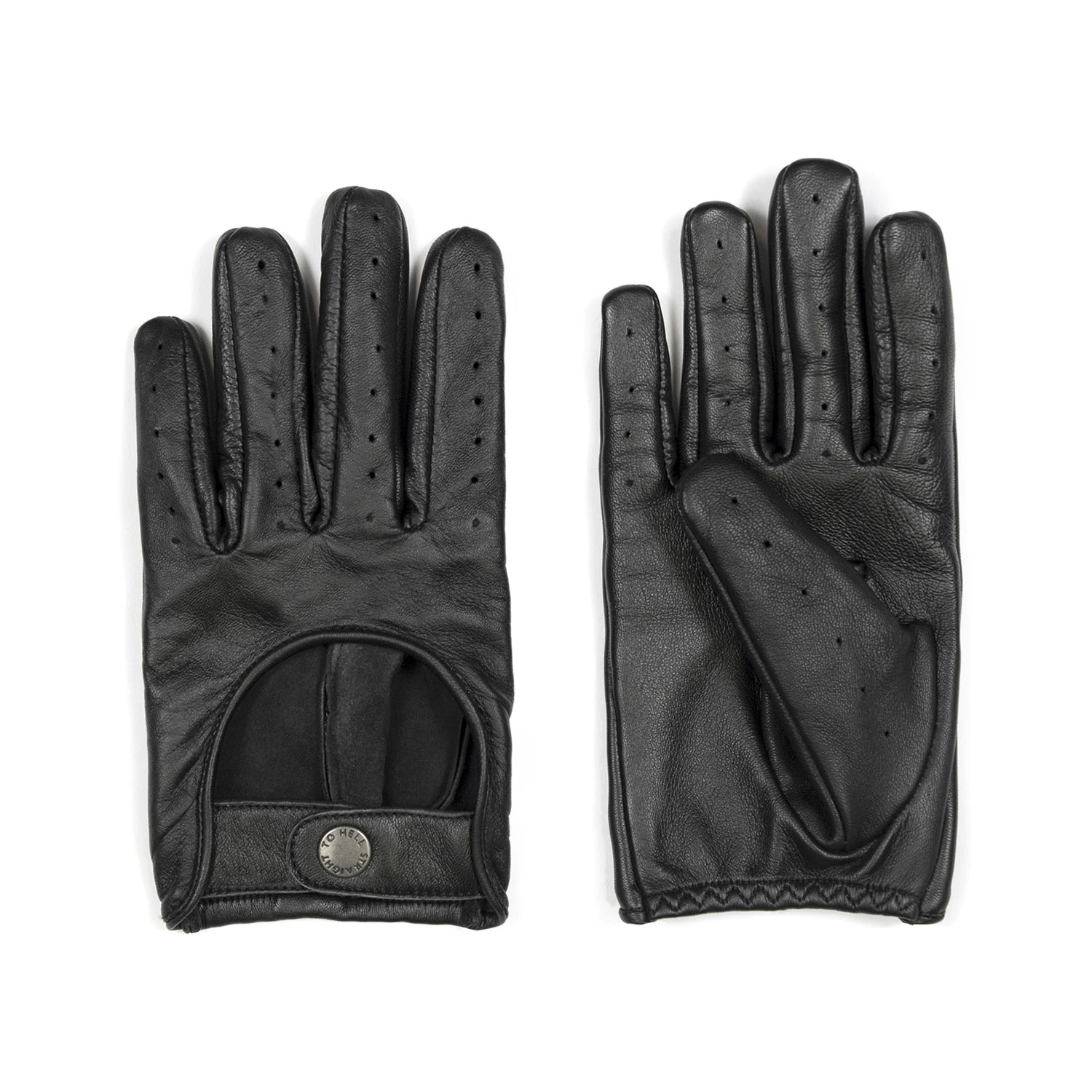 Leather gloves designed for women’s hands. Soft leather quickly conforms to your hand’s shape. Comfortable on the inside and outside for a smooth grip. Straight To Hell engraved gun metal snap closure. Unlined.