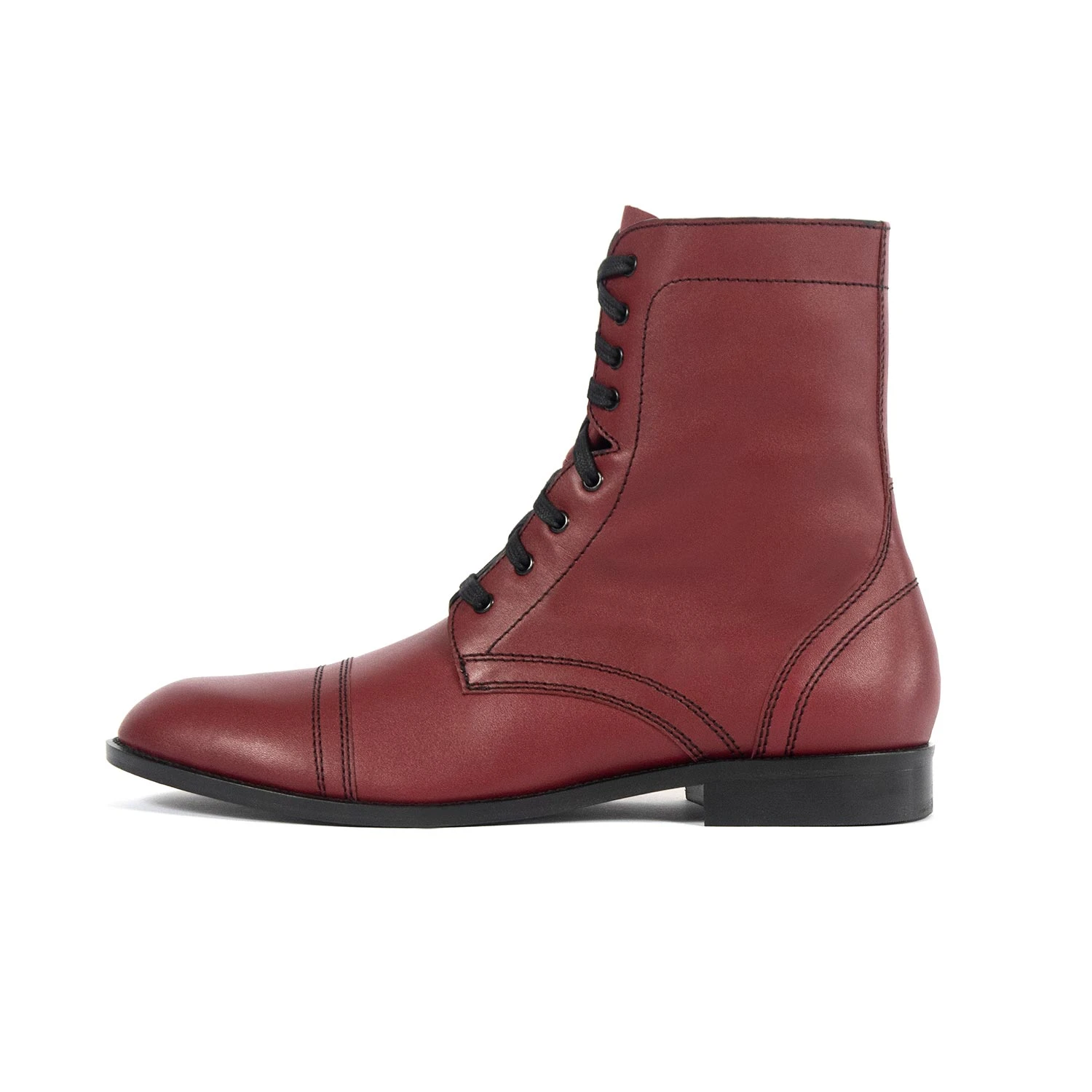 The Division is a men’s burgundy, premium leather combat boot featuring an eight eye lace up front, waxed laces, stacked heel, and side ankle zipper closure. Hand-made, Blake stitched leather sole with STH logo engraving. Blake construction allows for a resoleable boot because the outer sole is stitched directly to the upper. This enables a durable and flexible, high-end boot.
