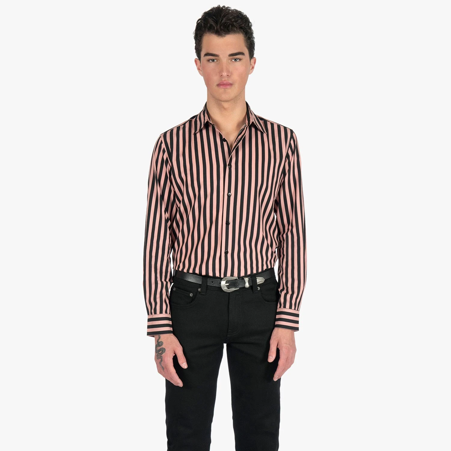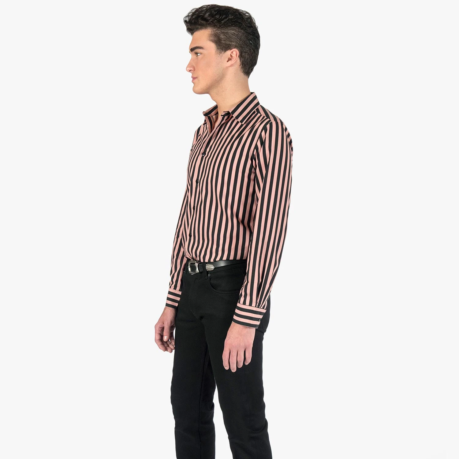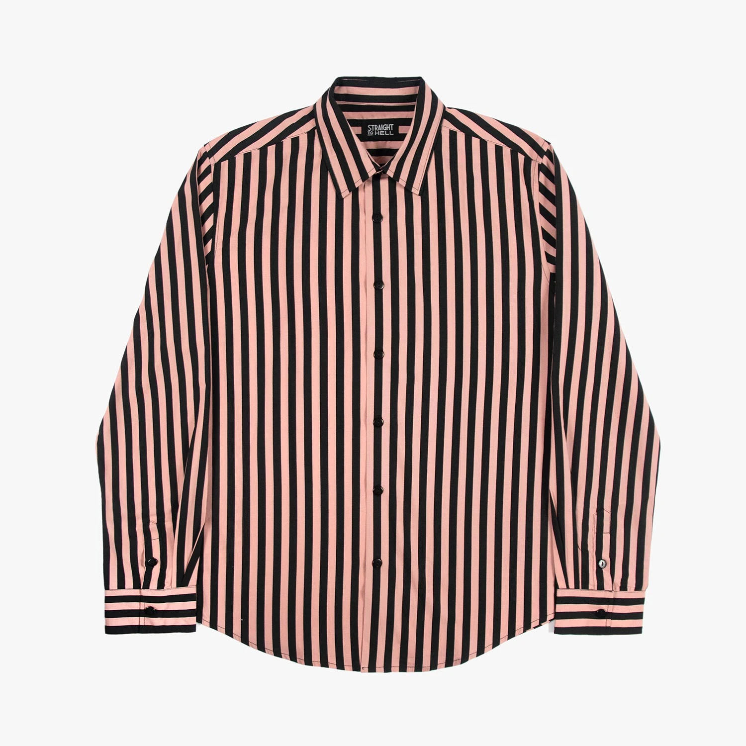 We created new, custom woven, STH Clothier cotton-modal blended fabric. The strong cotton offers durability, and the modal allows for a soft texture that drapes perfectly. Pink and black striped, long sleeve button up shirt. Tailored for a slimmer fit but loose enough for comfort.