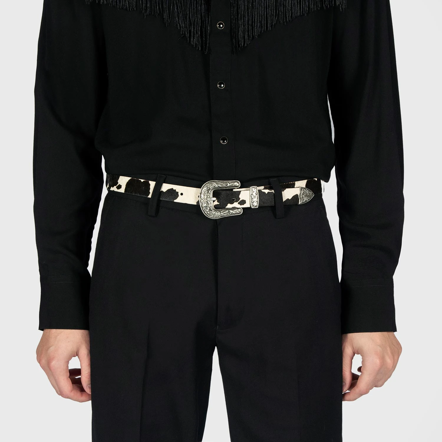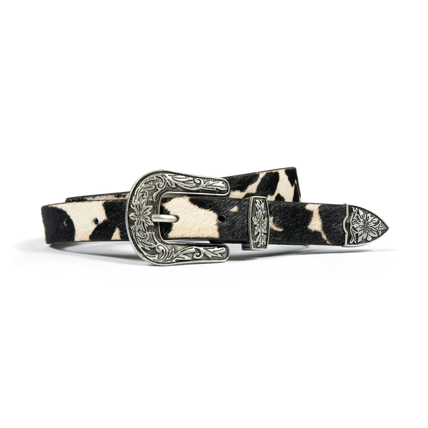 Men’s leather belt with cow pattern, pony hair leather. Western floral detail on buckle.