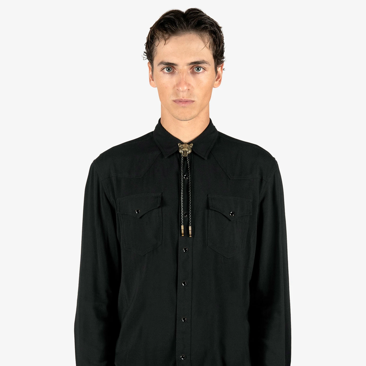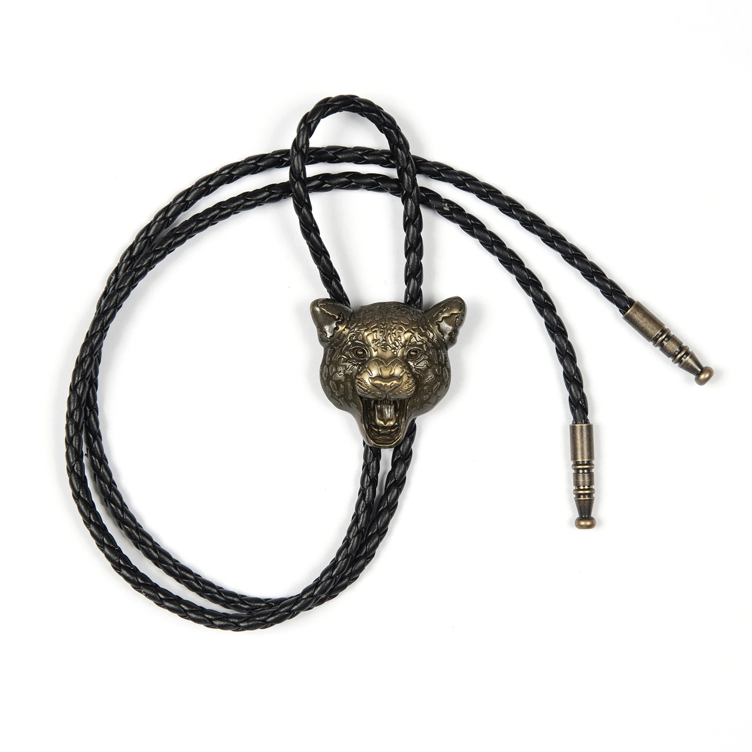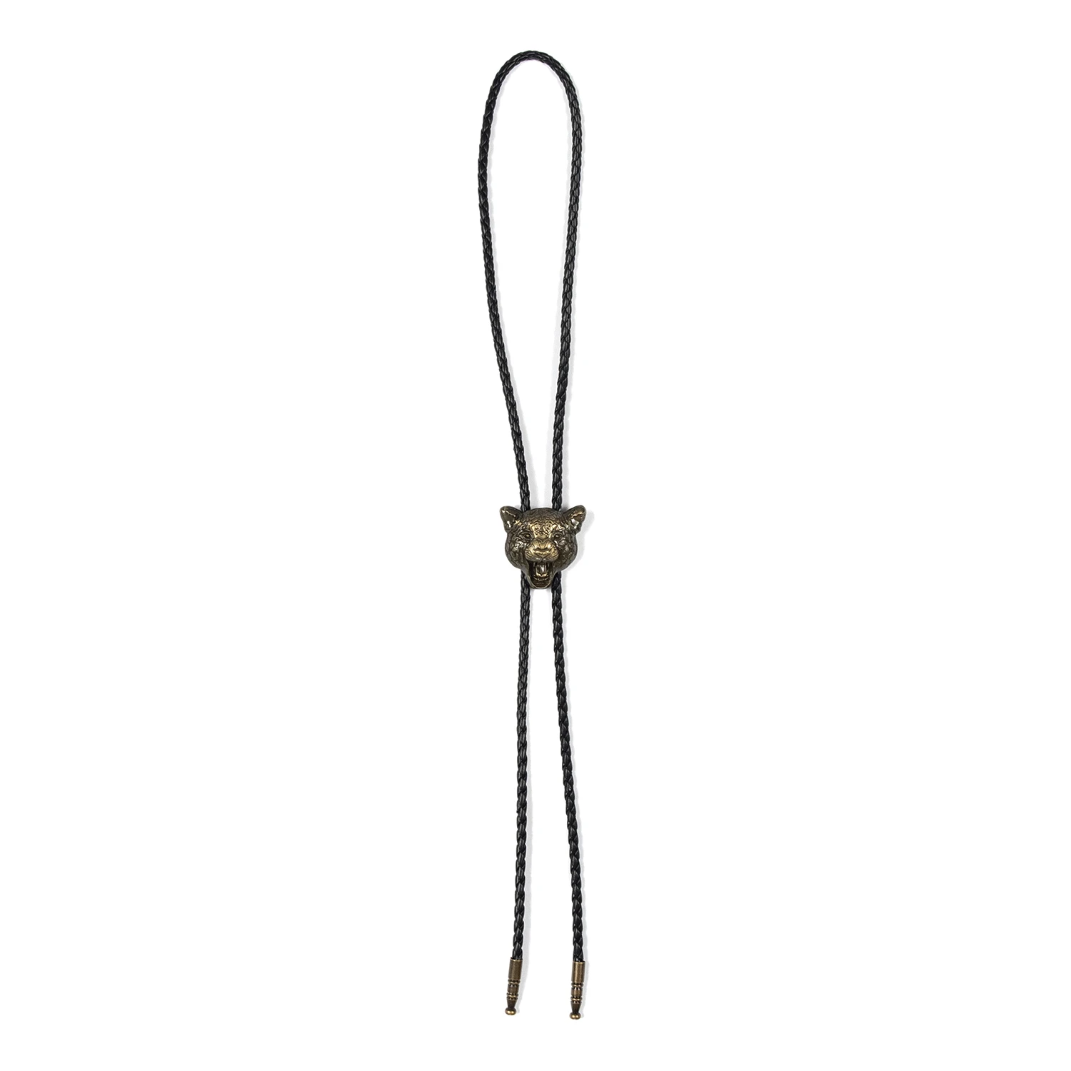 The Gabrielle bolo tie features a 1.5 inch cheetah face and 15.5 inch black leather rope. The Gabrielle can be worn as a loose or traditional tie or as a necklace. Packaged in a STH custom box.