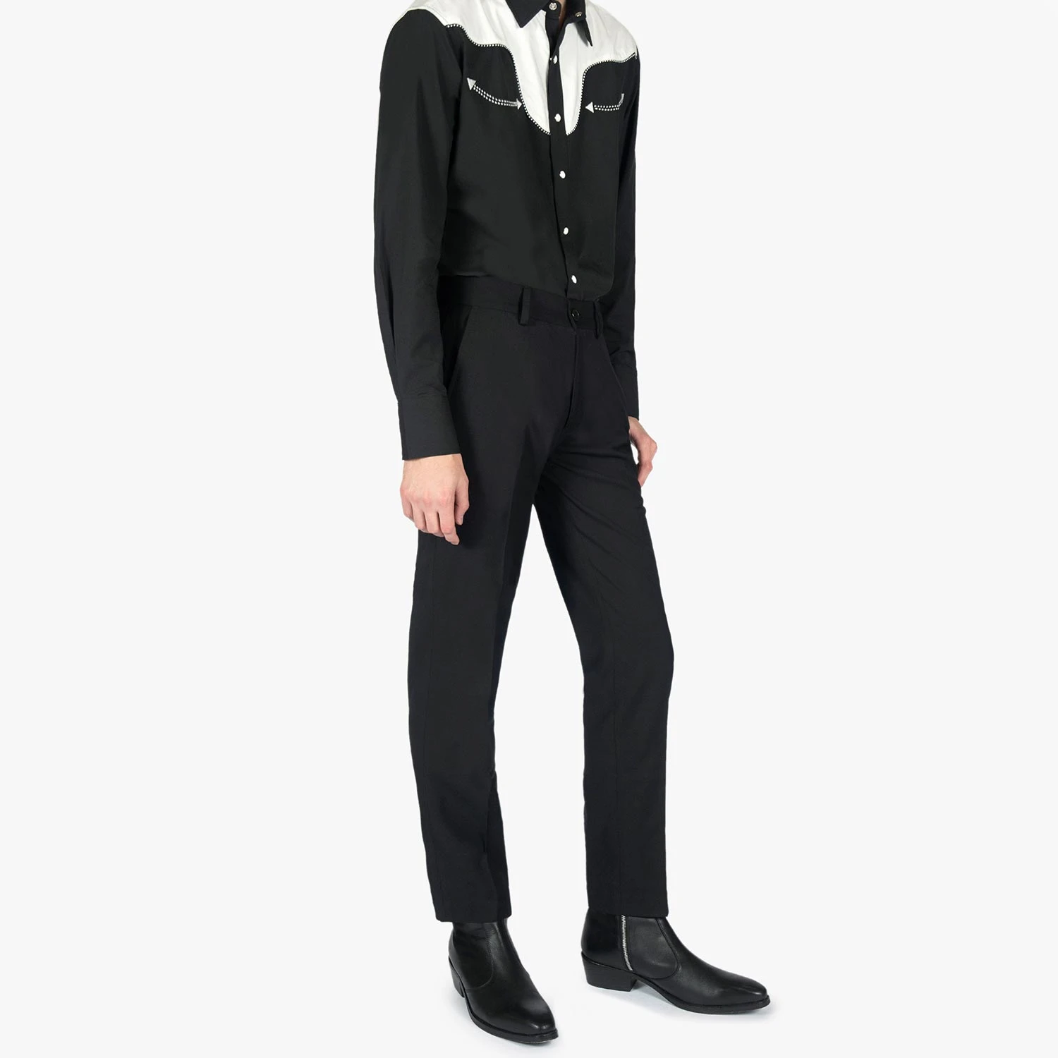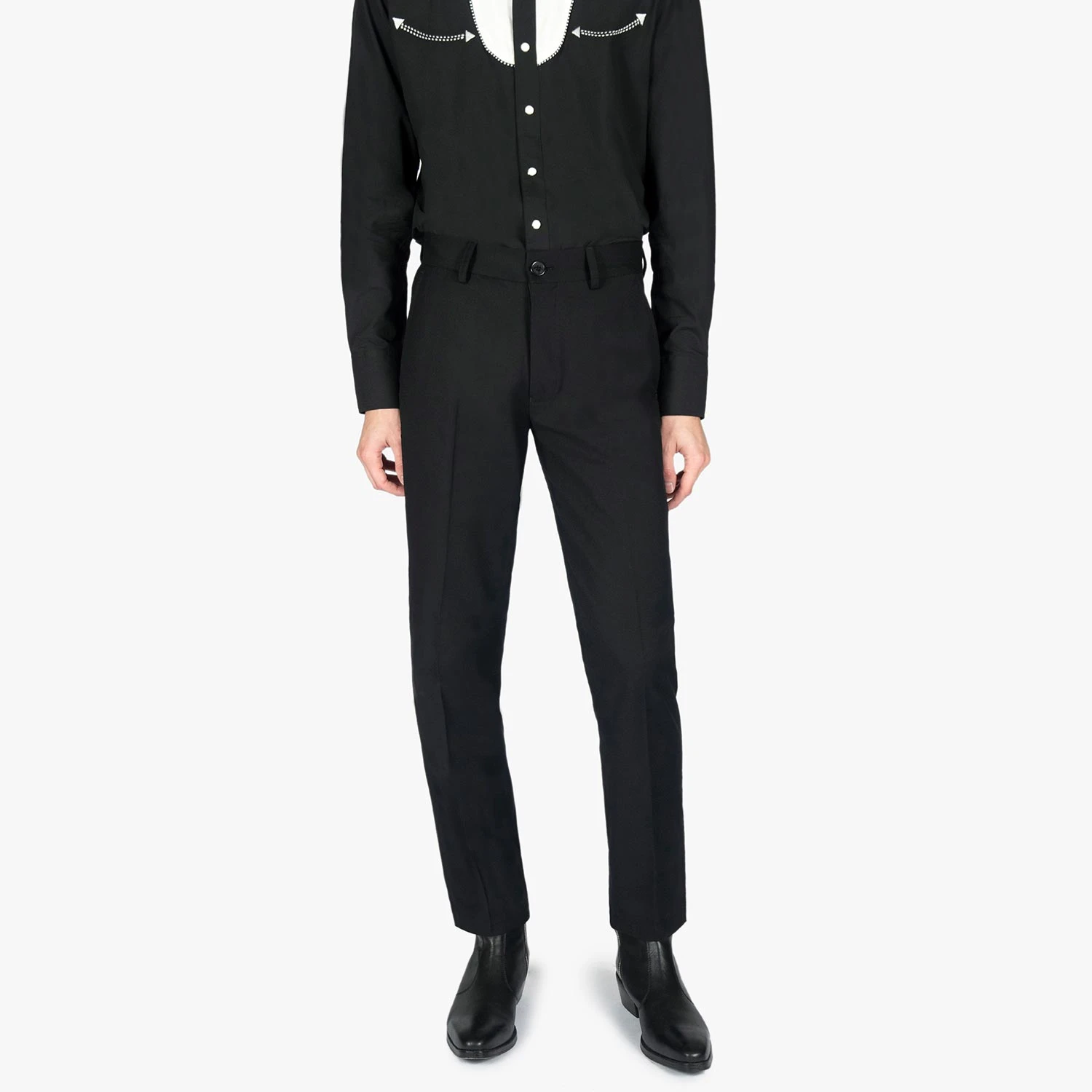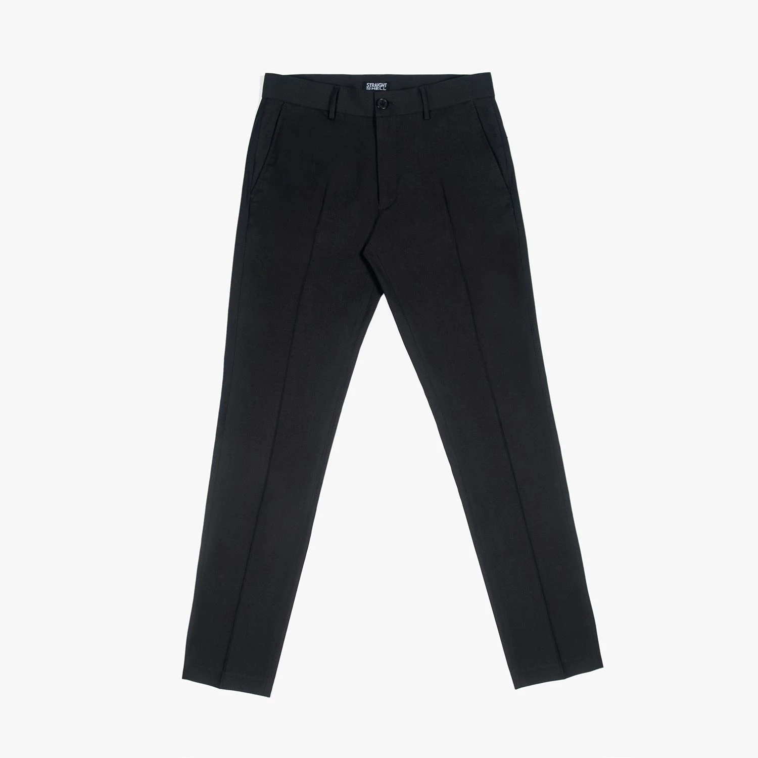 Slim fit black pants. A narrow taper from thigh to hem. Can be worn as casual or dress pants.