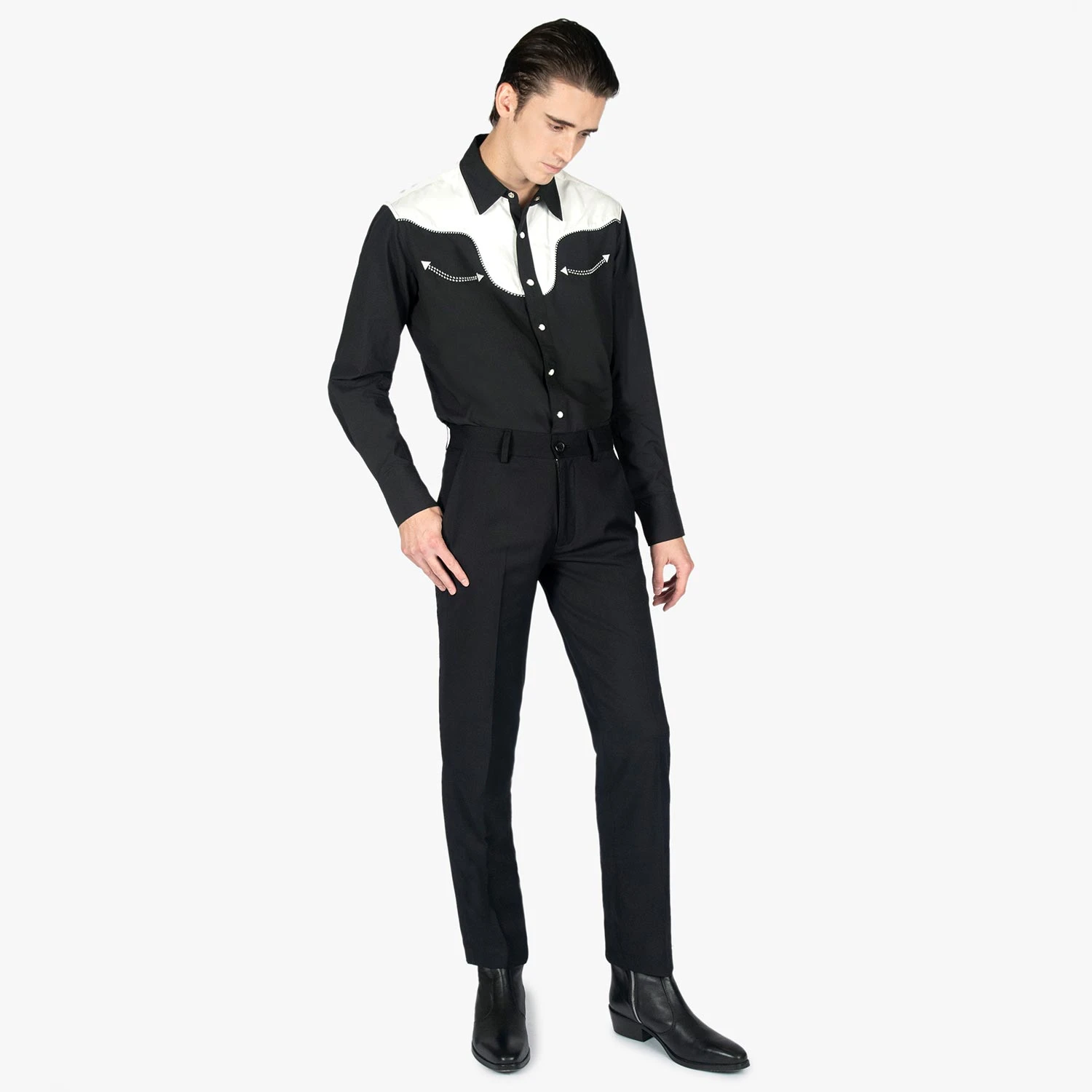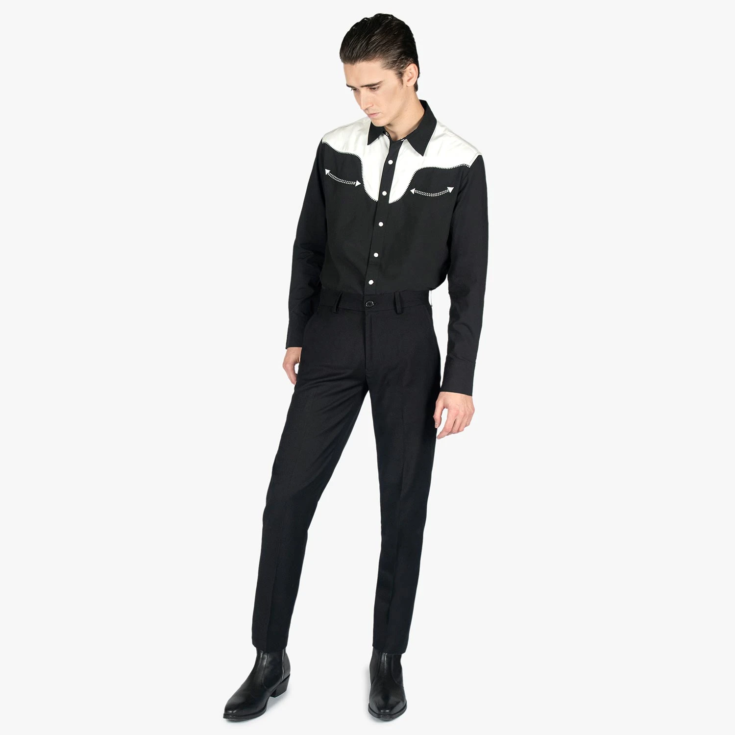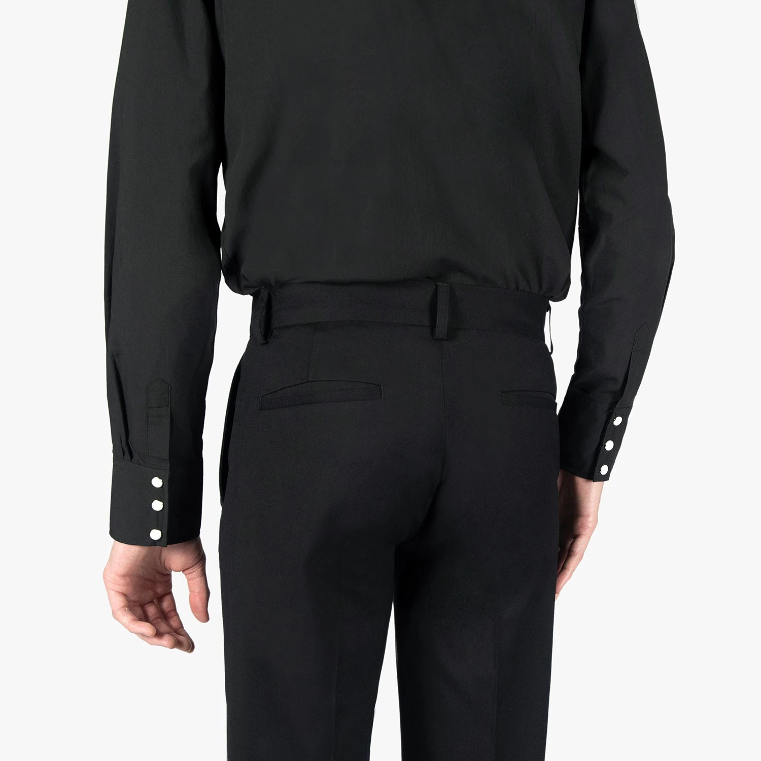 Slim fit black pants. A narrow taper from thigh to hem. Can be worn as casual or dress pants.