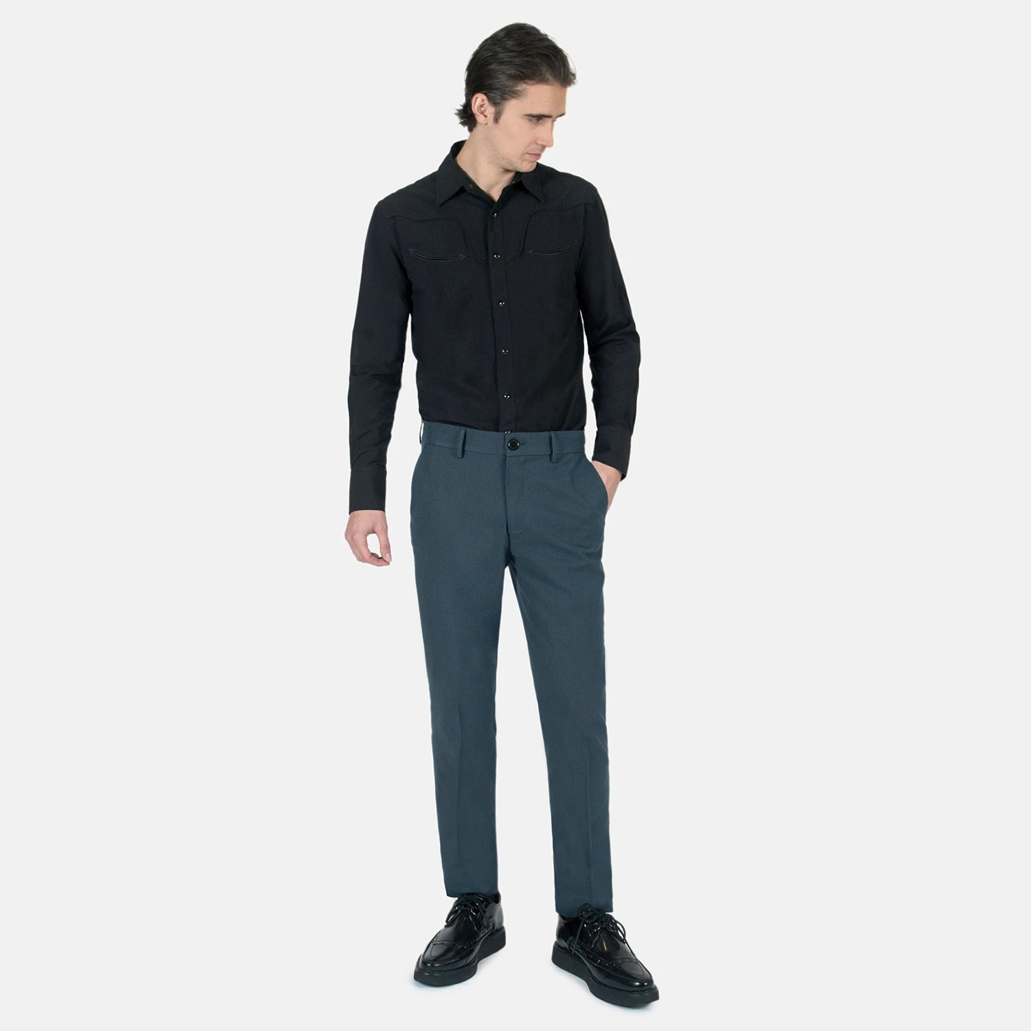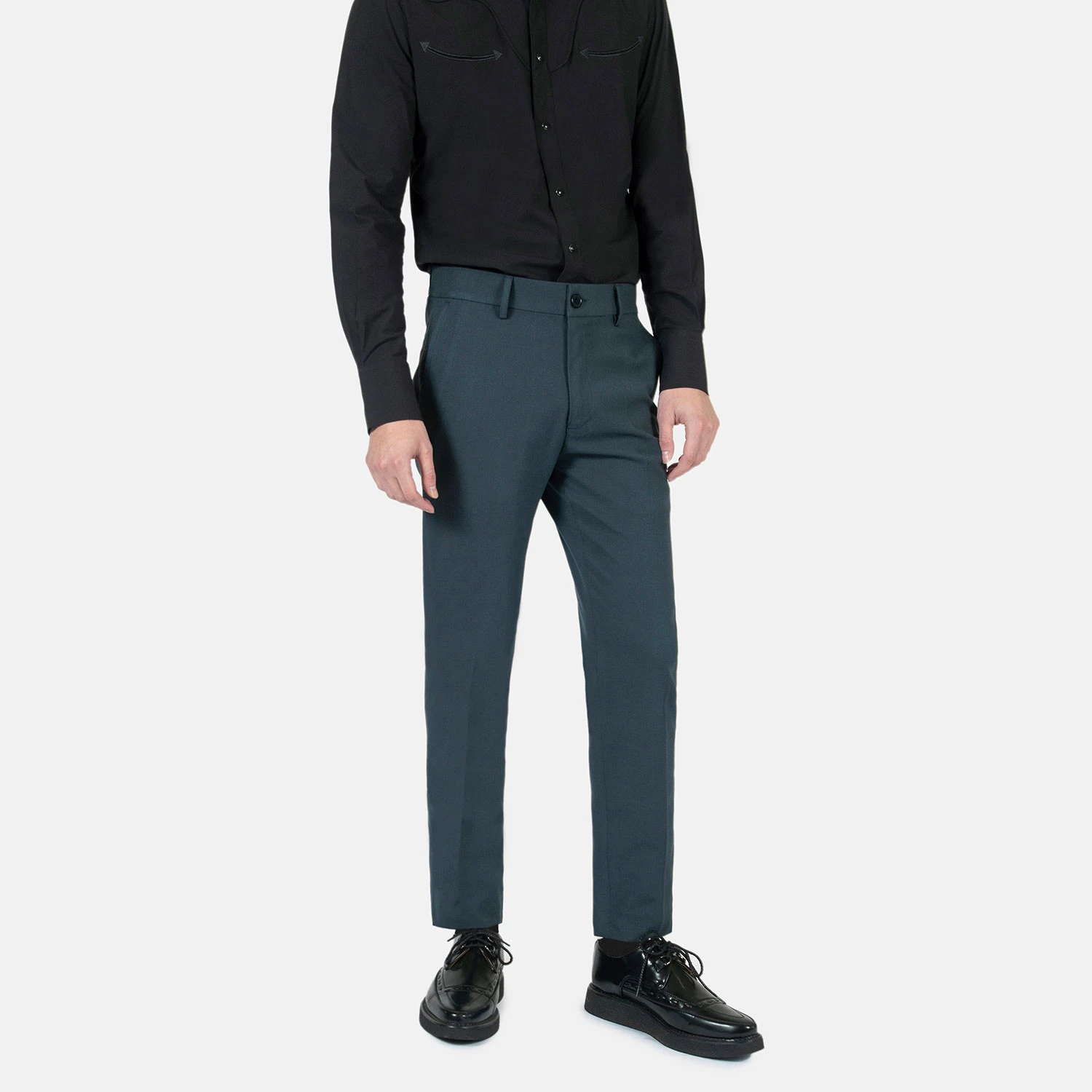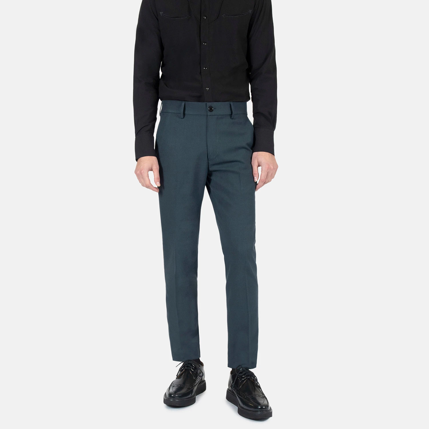 Slim fit blue pants. A narrow taper from thigh to hem. Can be worn as casual or dress pants.