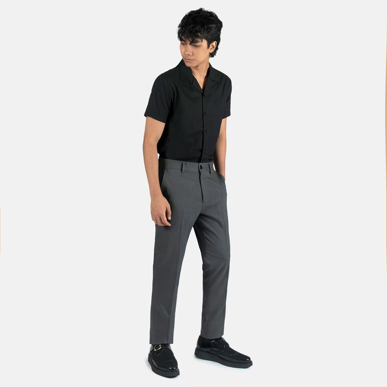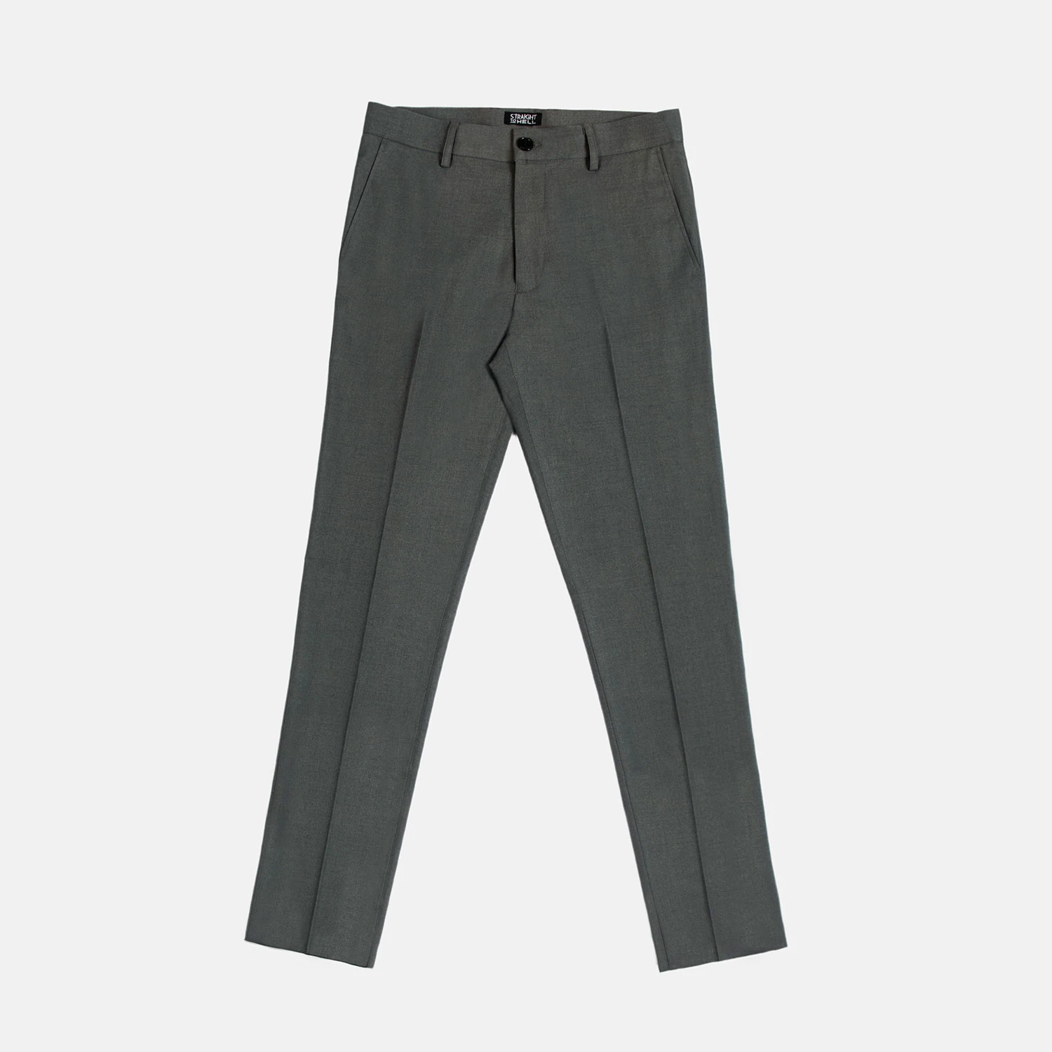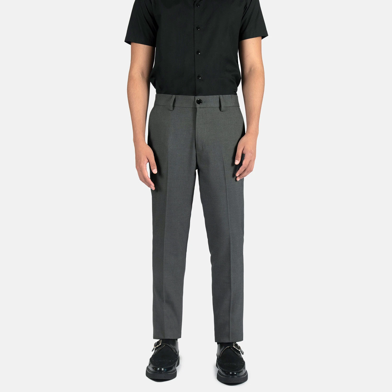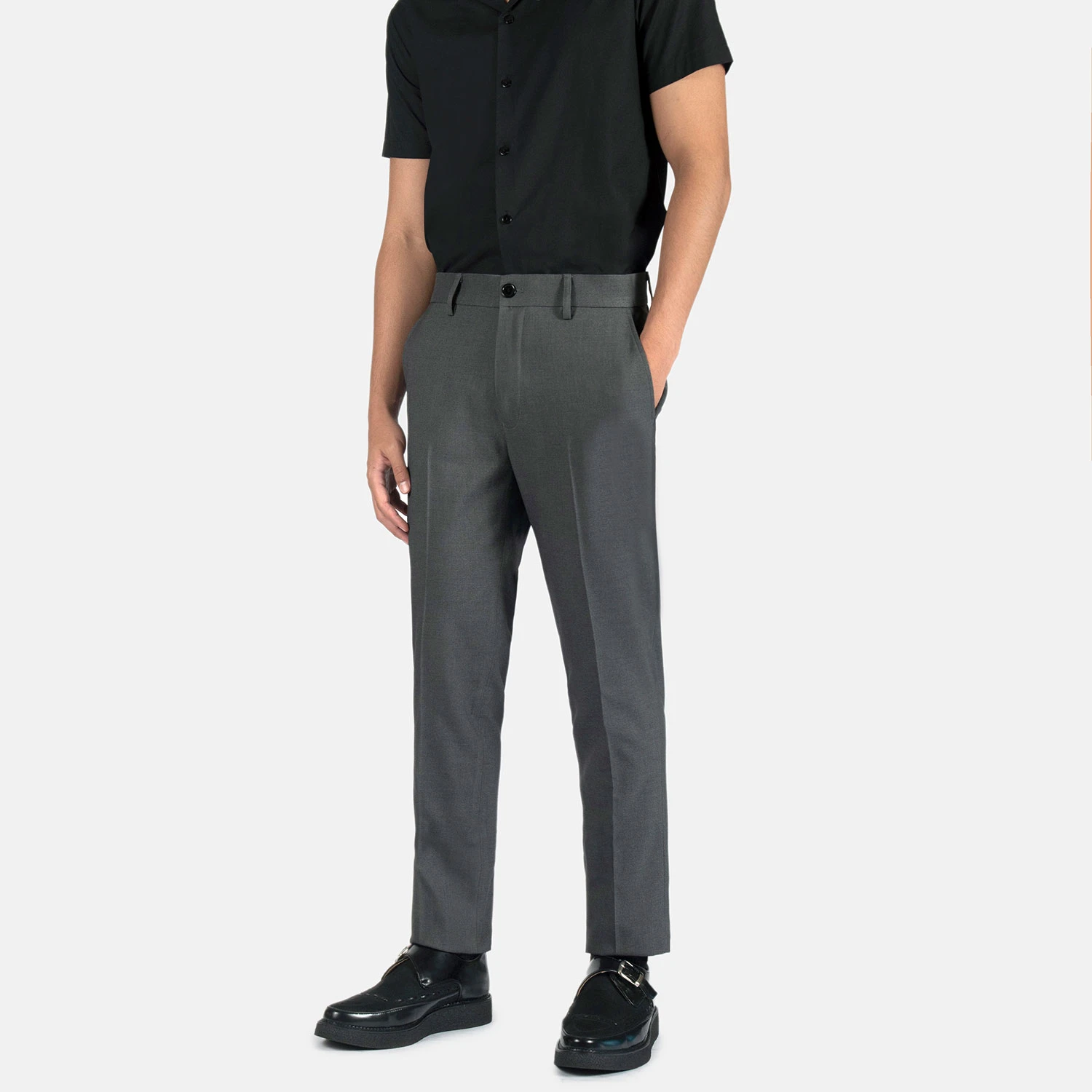 Slim fit grey pants. A narrow taper from thigh to hem. Can be worn as casual or dress pants.