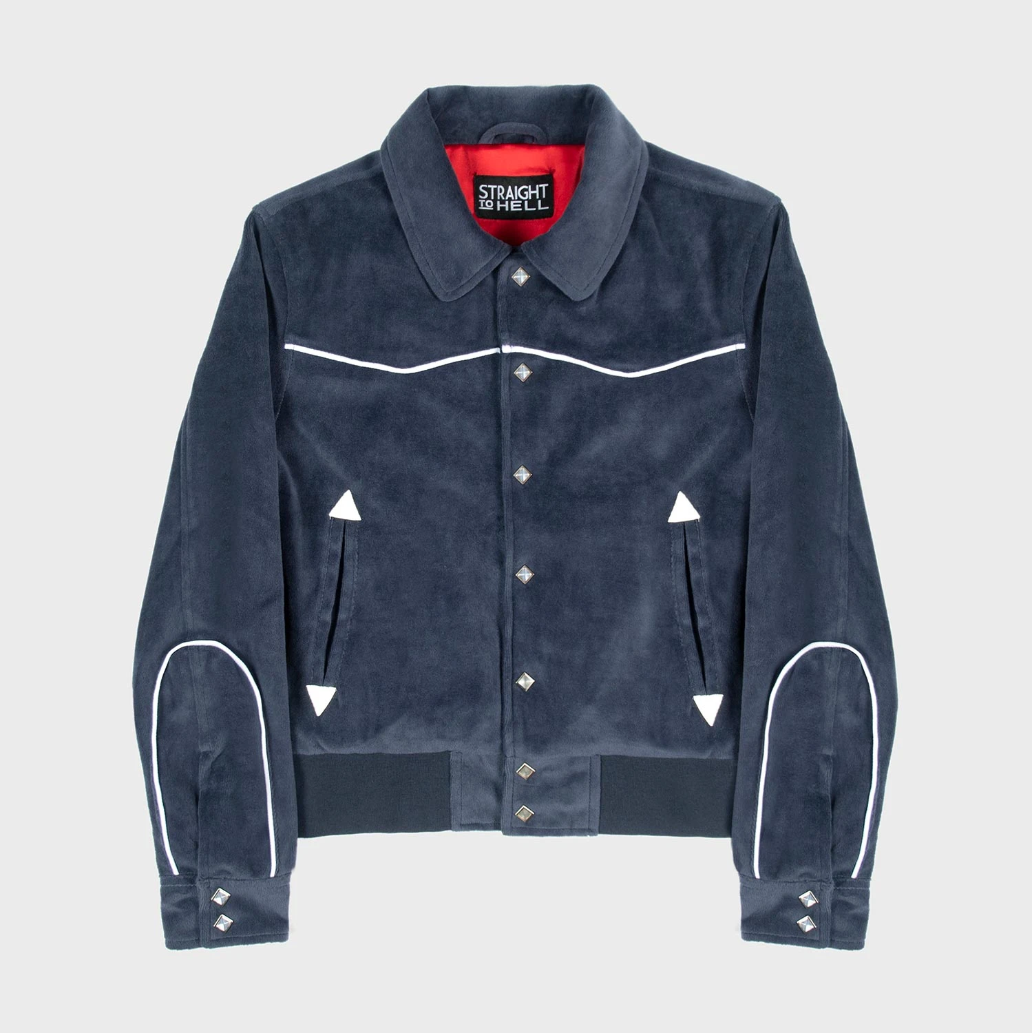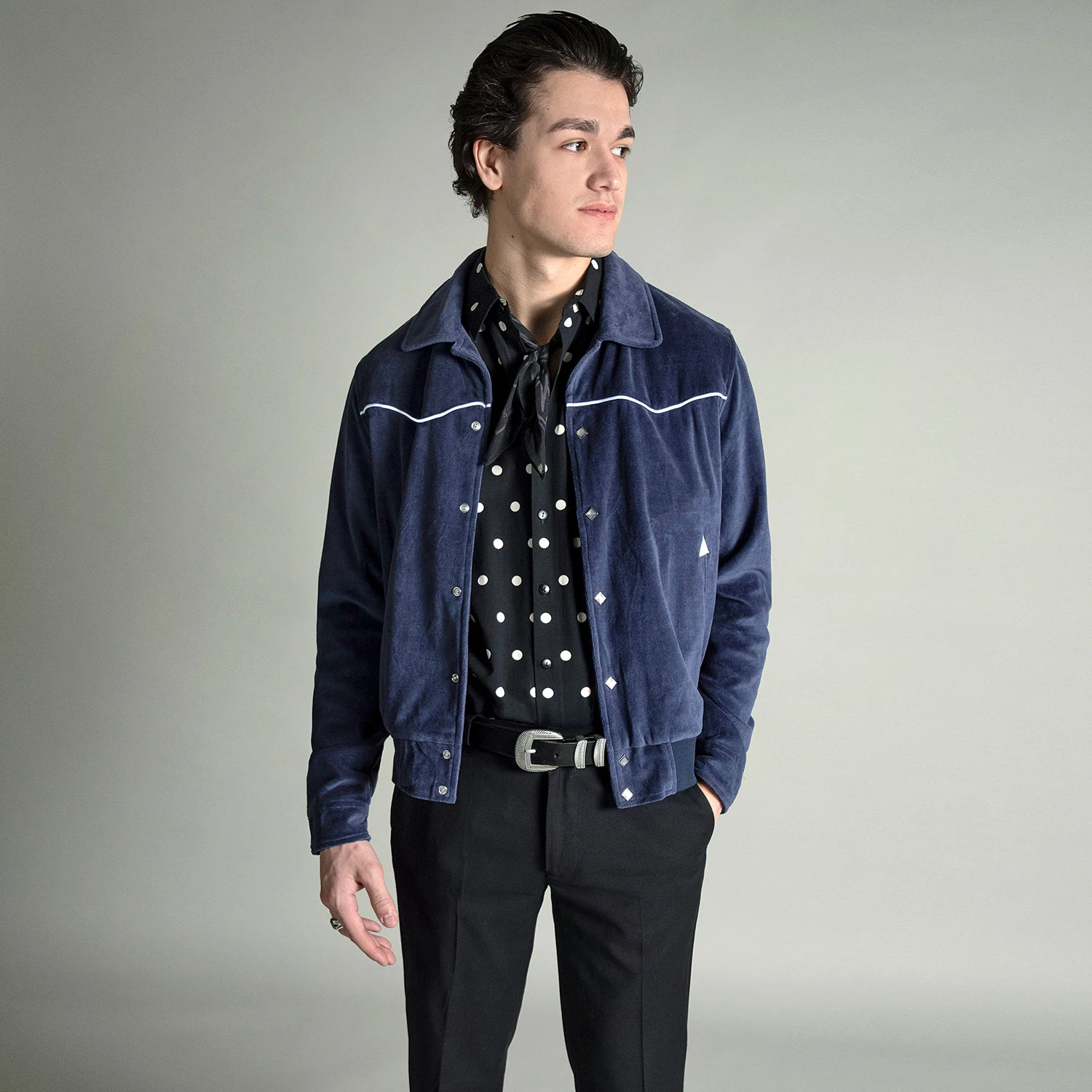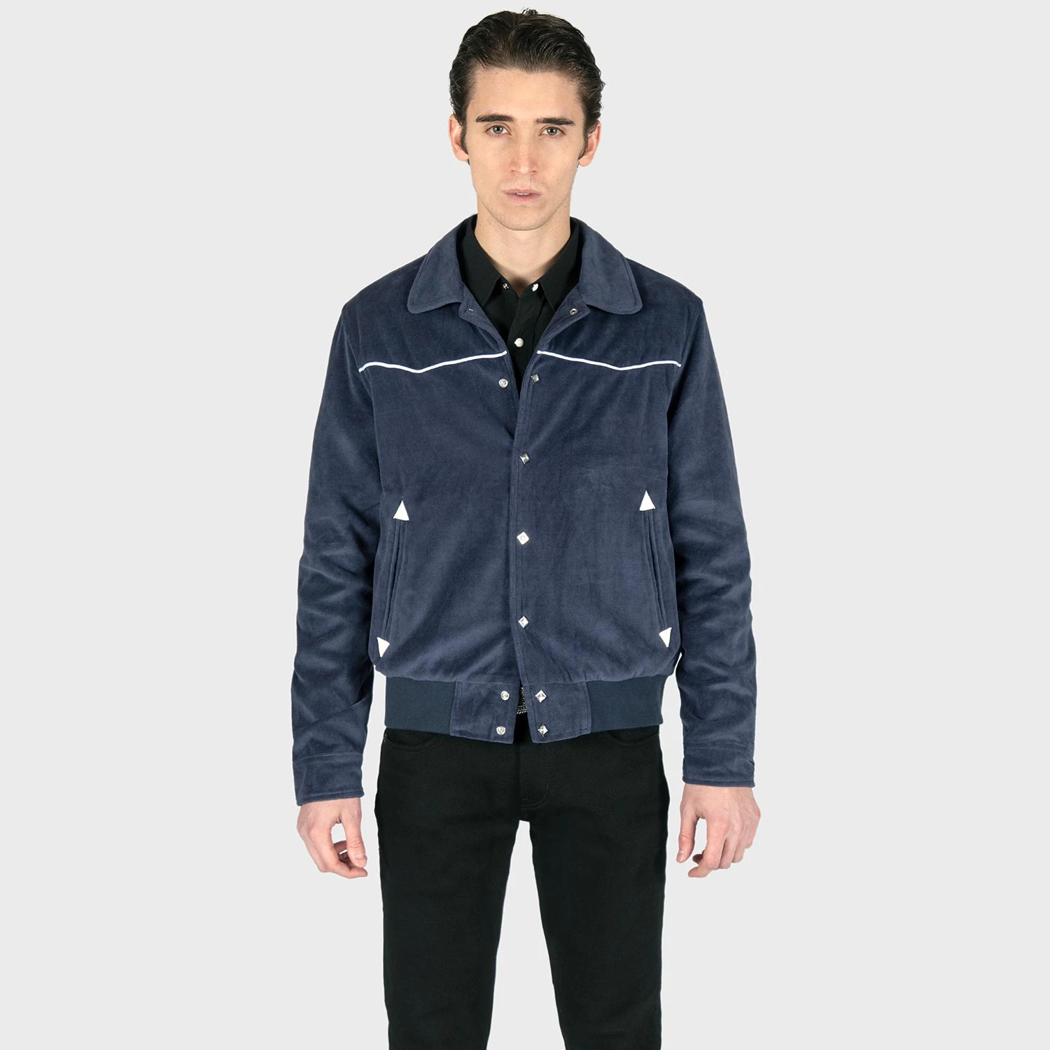 Blue velvet jacket with white piping, diamond snap closure, and red lining. Unisex sizing.