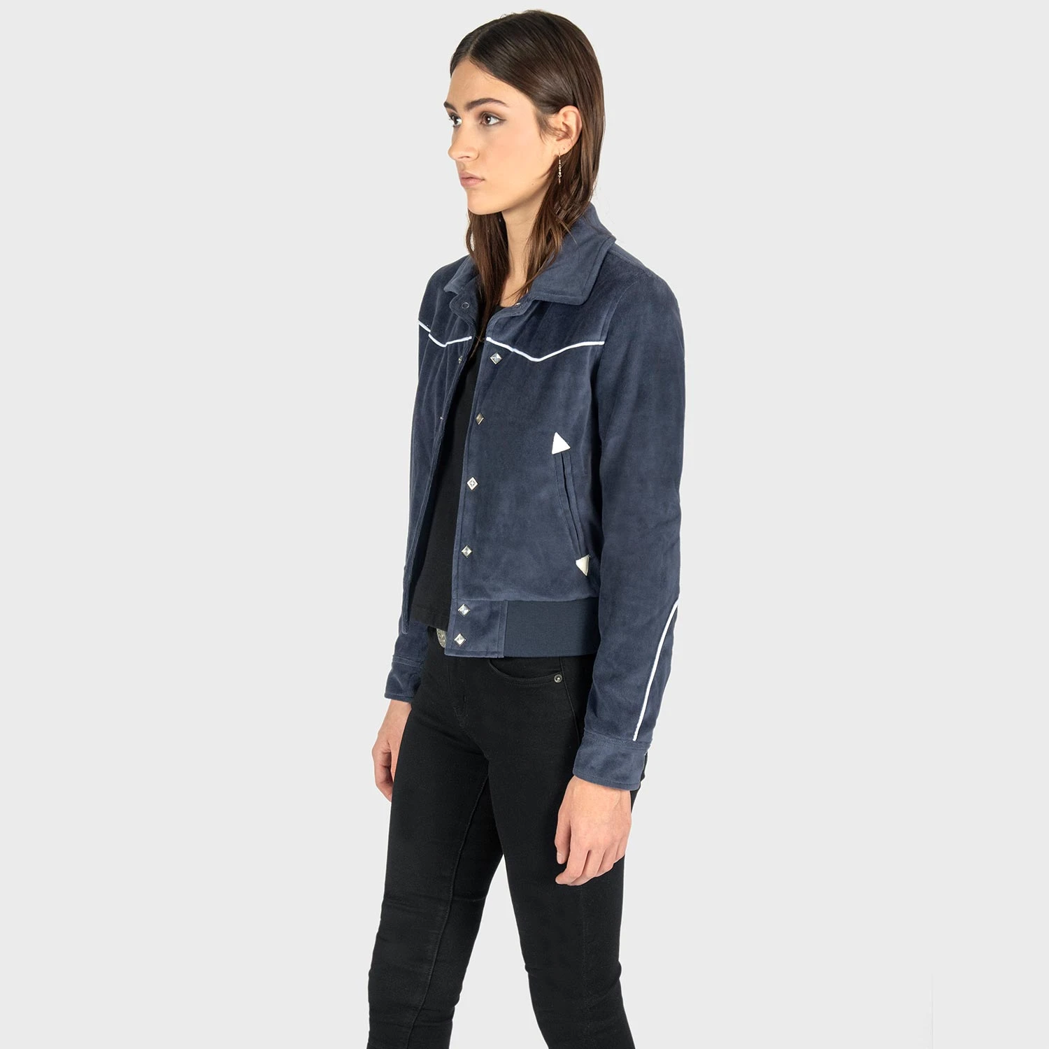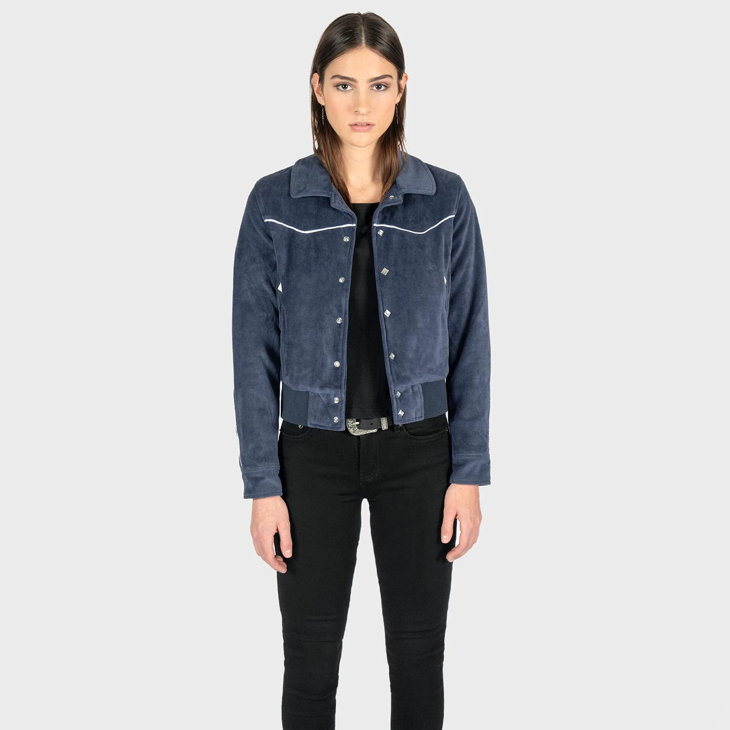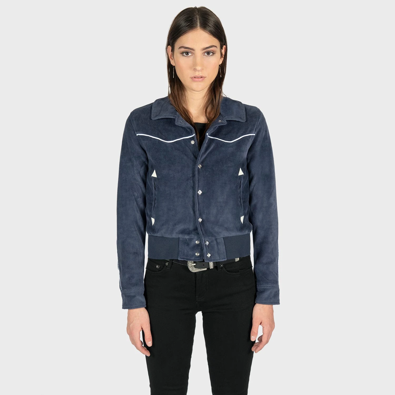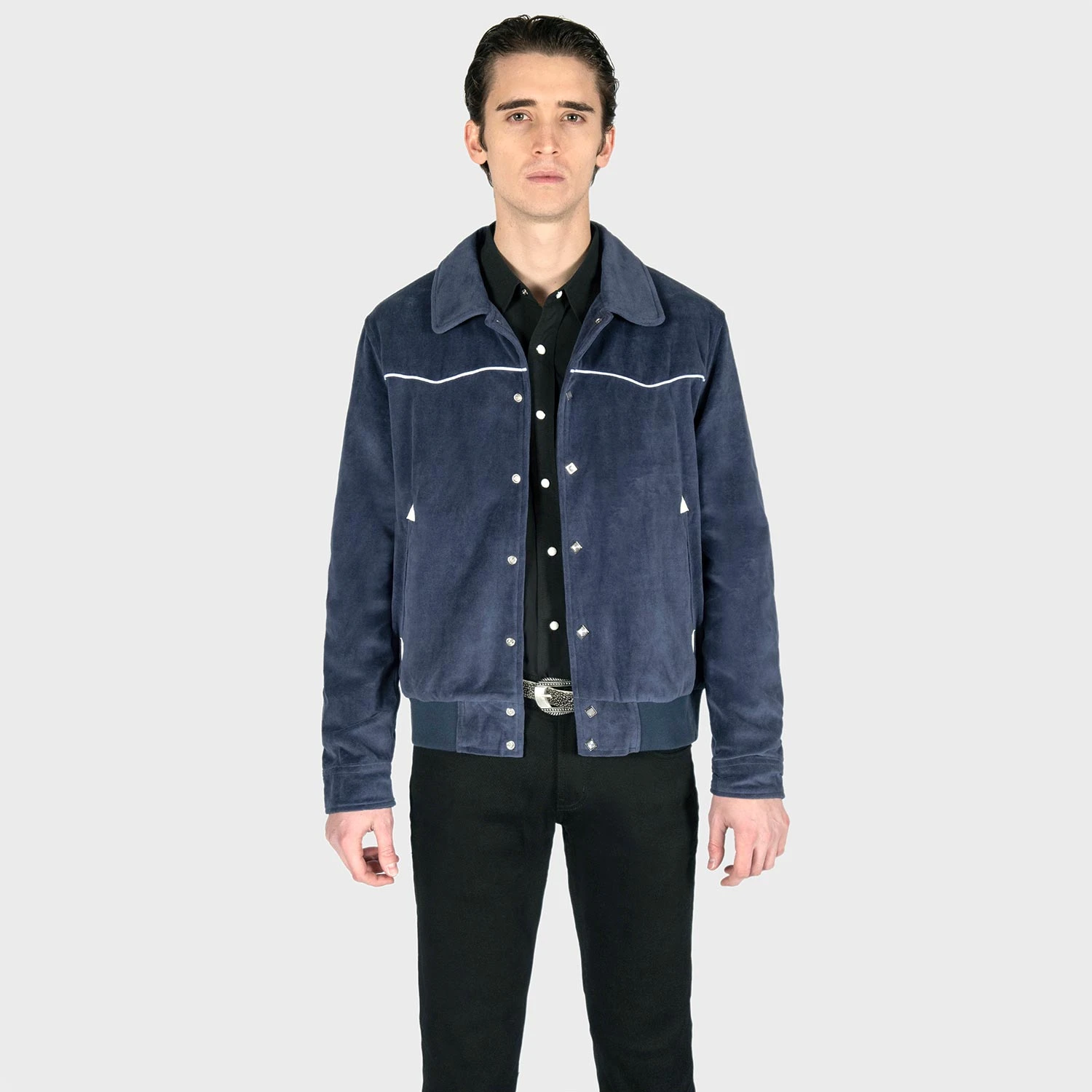 Blue velvet jacket with white piping, diamond snap closure, and red lining. Unisex sizing.