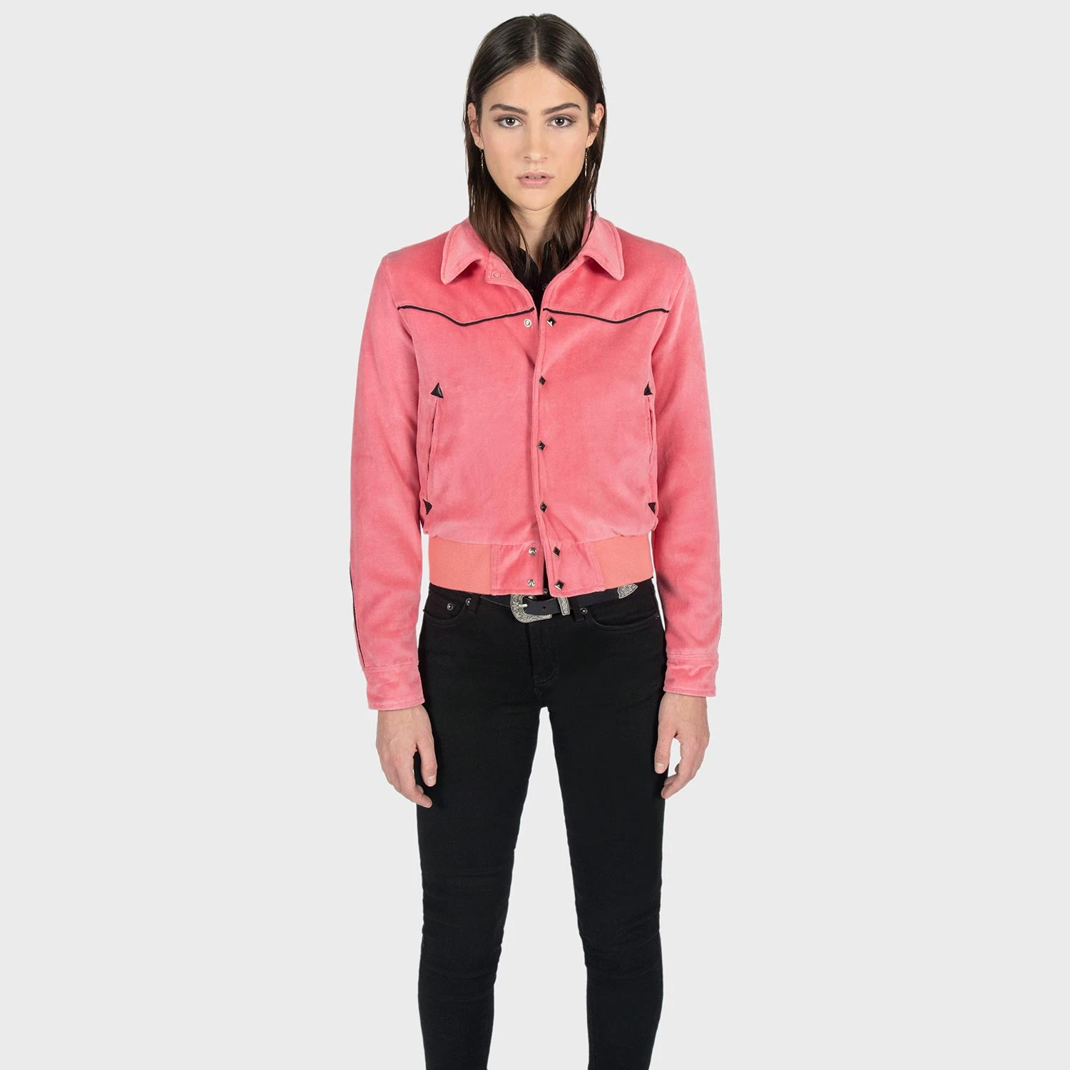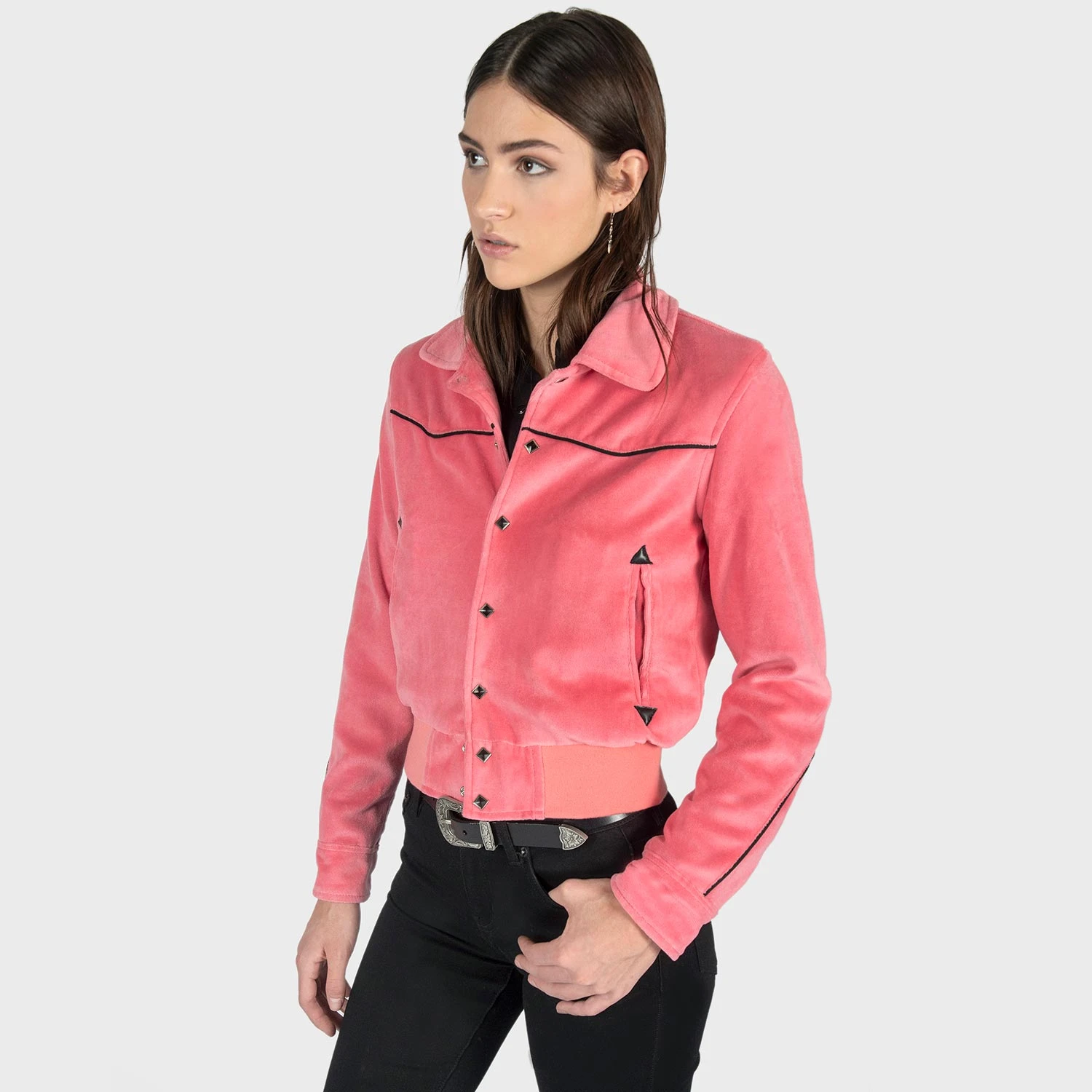 Pink velvet jacket with black piping, diamond snap closure, and black lining. Unisex sizing.