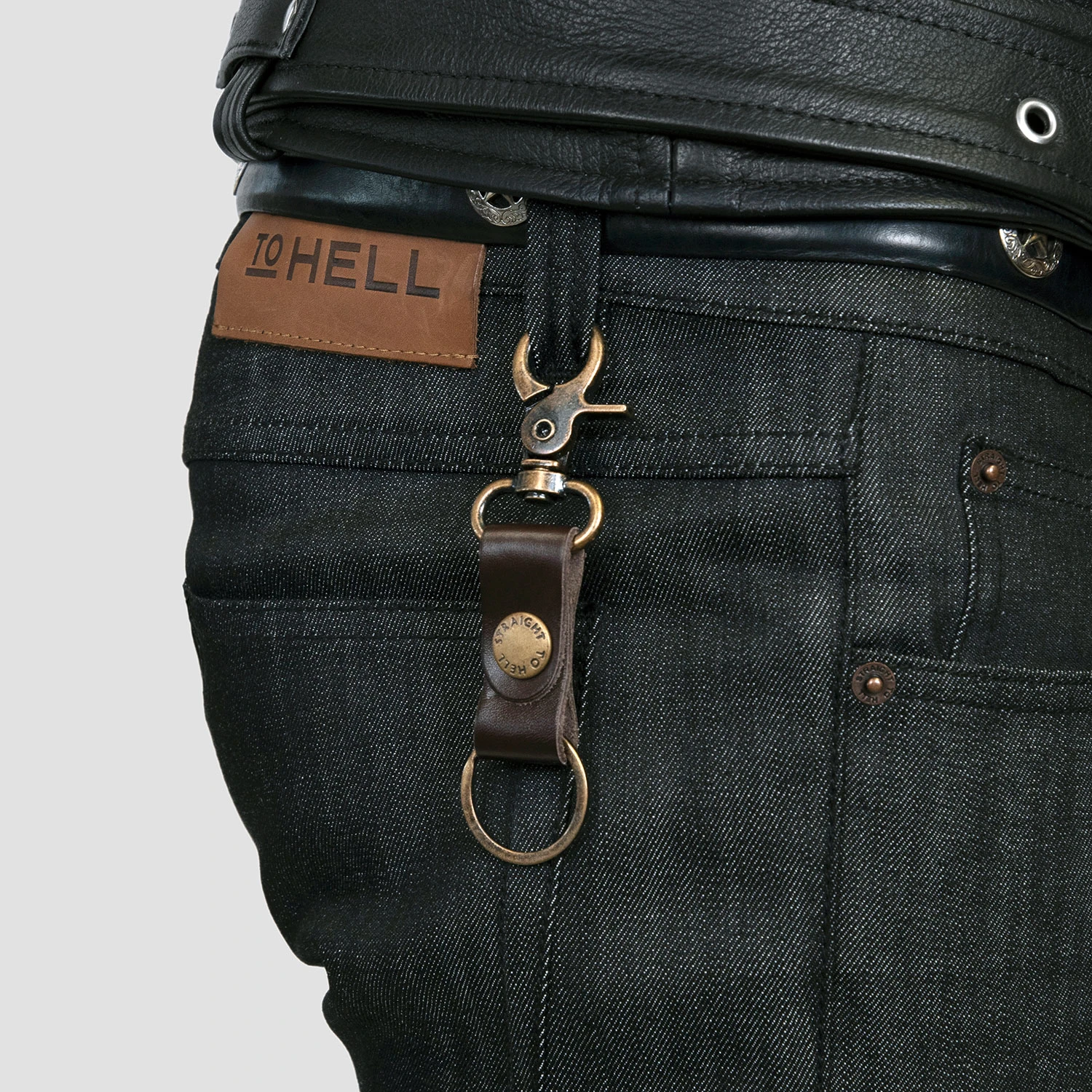 Leather and metal combine for a durable key clip. Straight To Hell engraved brass closure and strong brown leather for lasting use.