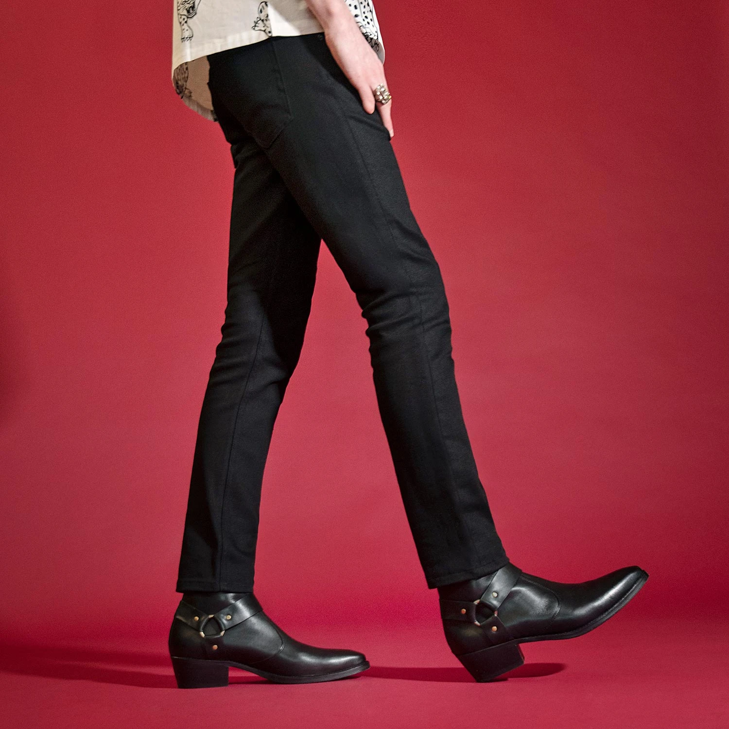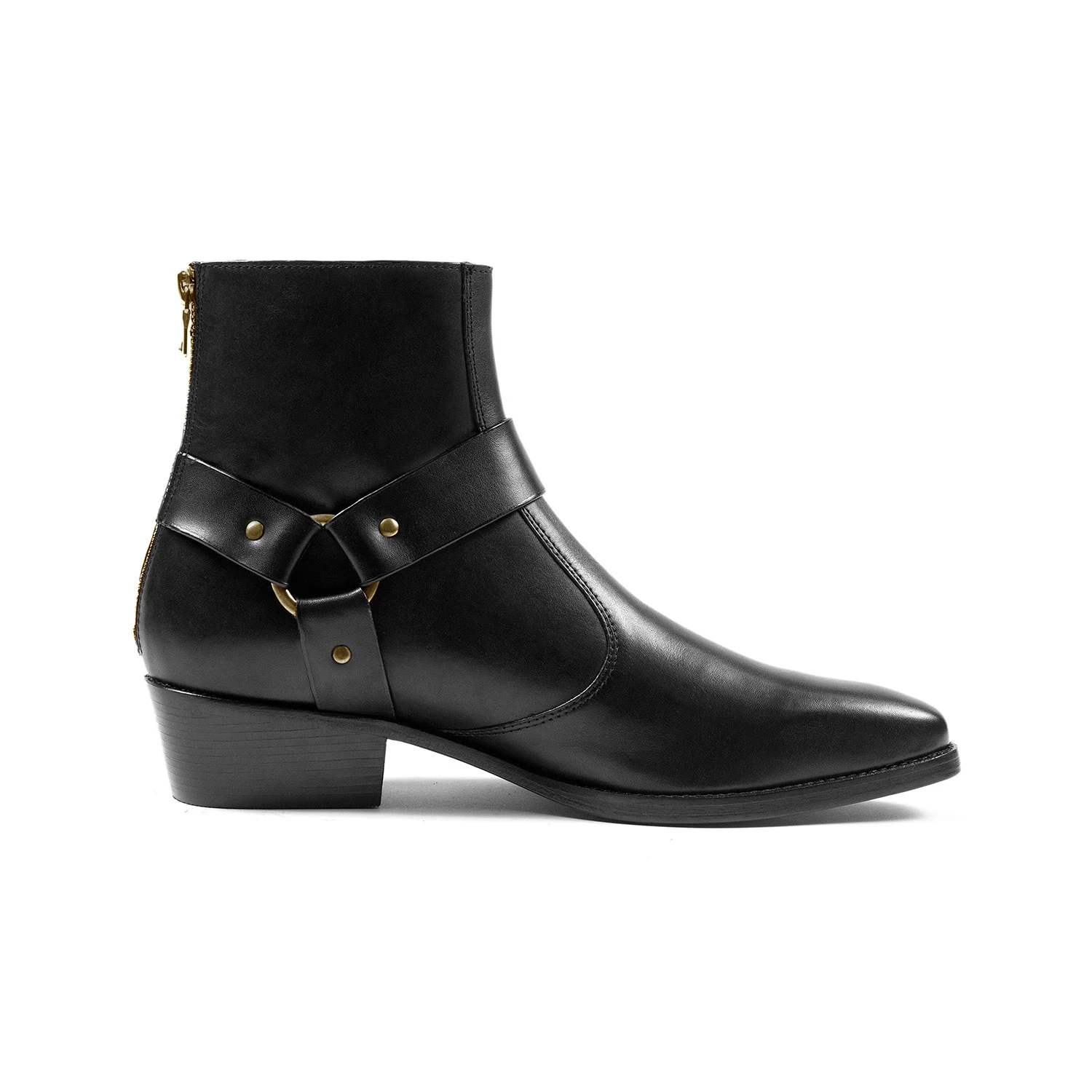 The Libertine is a men’s black, premium leather harness boot with brass hardware. It features a back ankle zipper closure and stacked heel. Hand-made, Blake stitched leather sole with STH logo engraving. Blake construction allows for a resoleable boot because the outer sole is stitched directly to the upper. This enables a durable and flexible, high-end boot.
