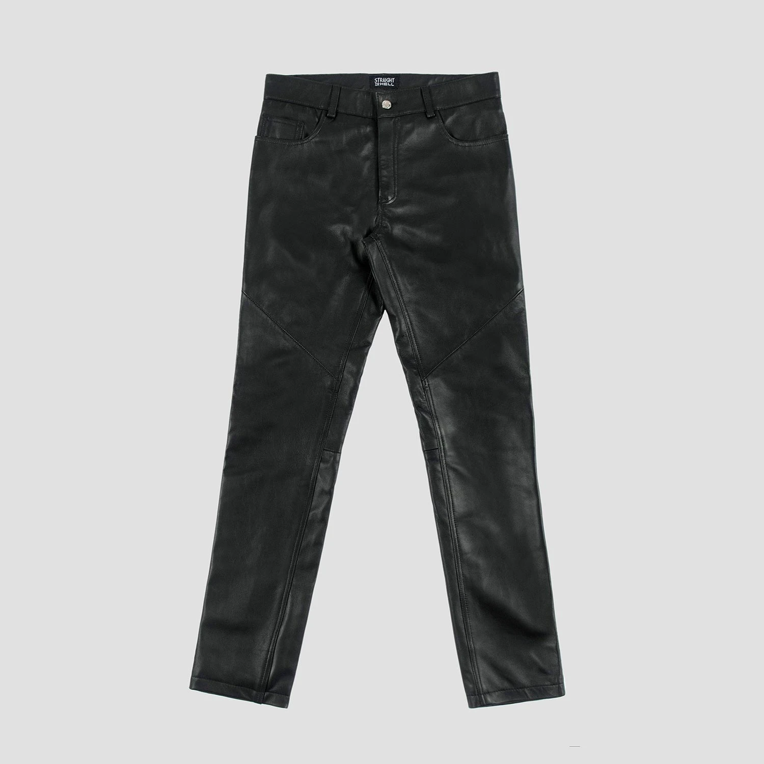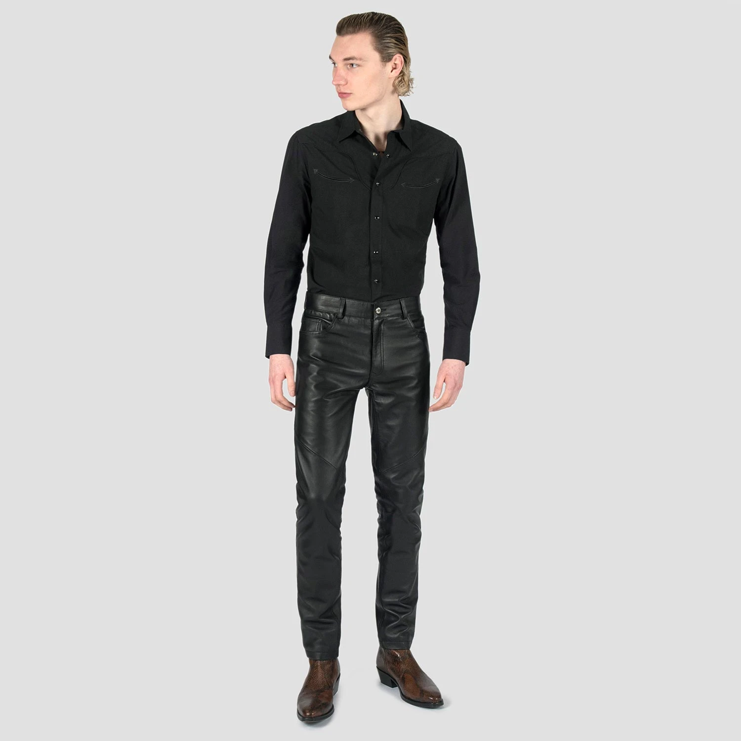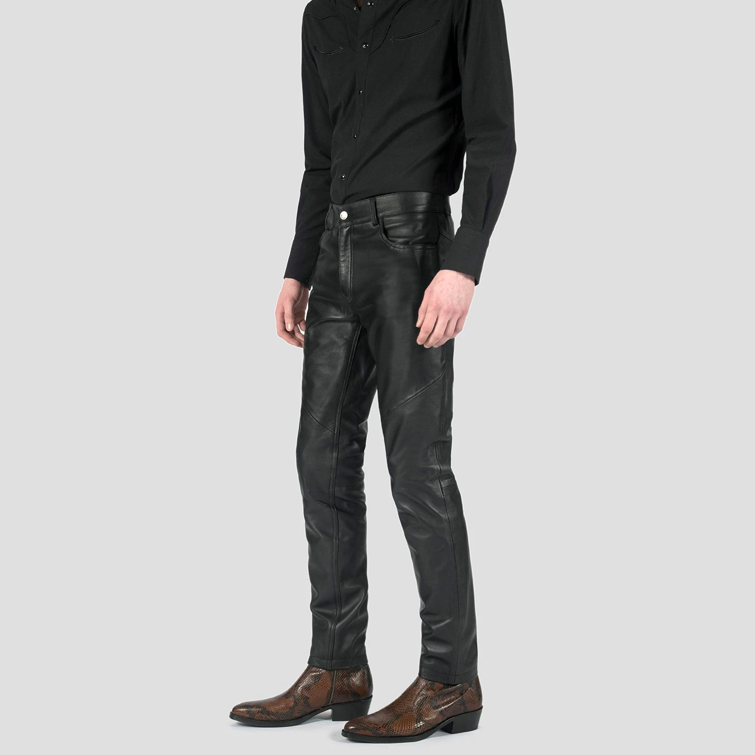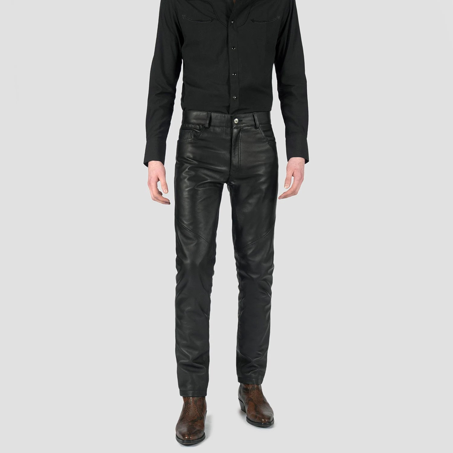 Leather pants in the Narrow Eddie. Skinny fit, but not too tight. Premium leather is supple to the touch and durable when worn. Medium rise, slight stretch, with a tapered ankle.