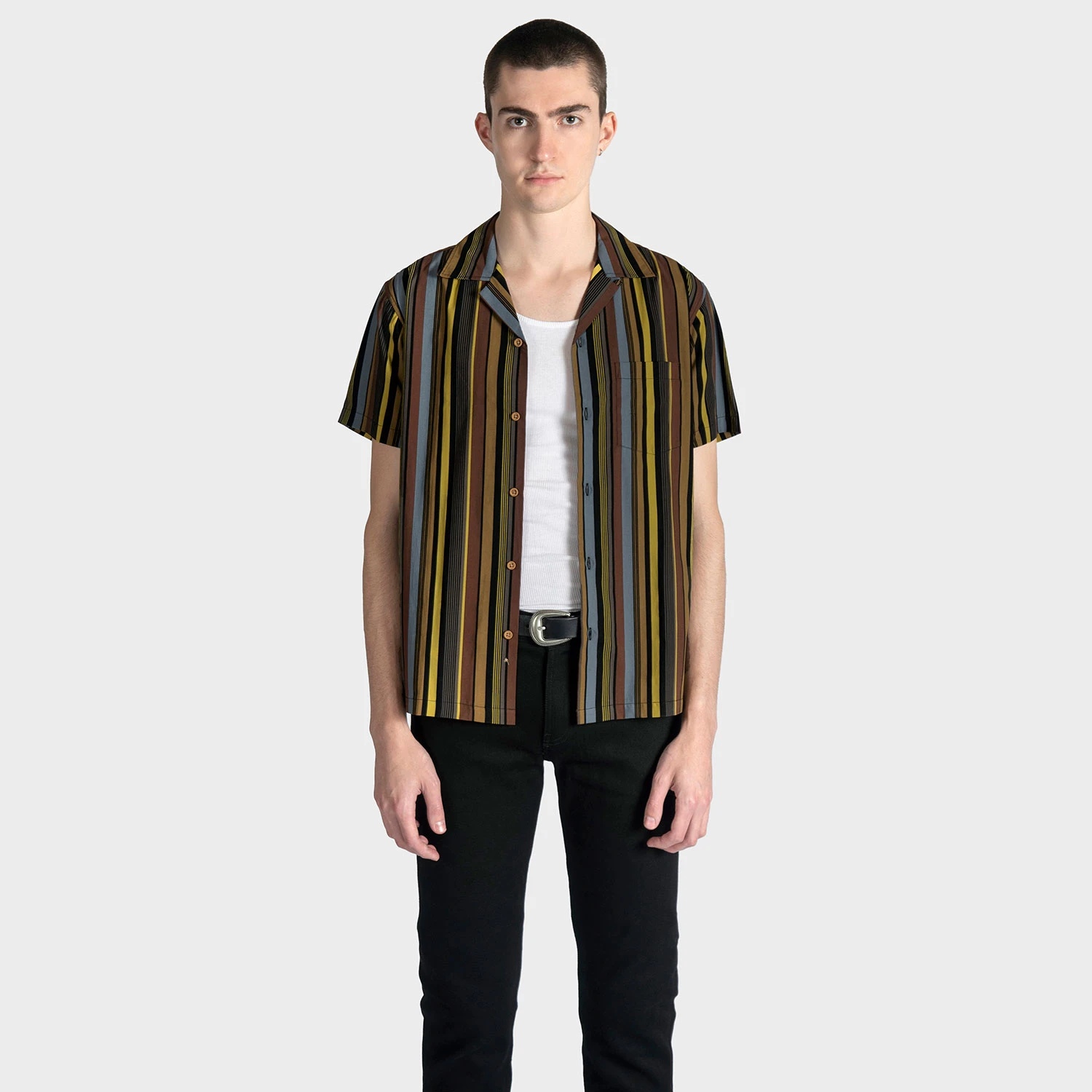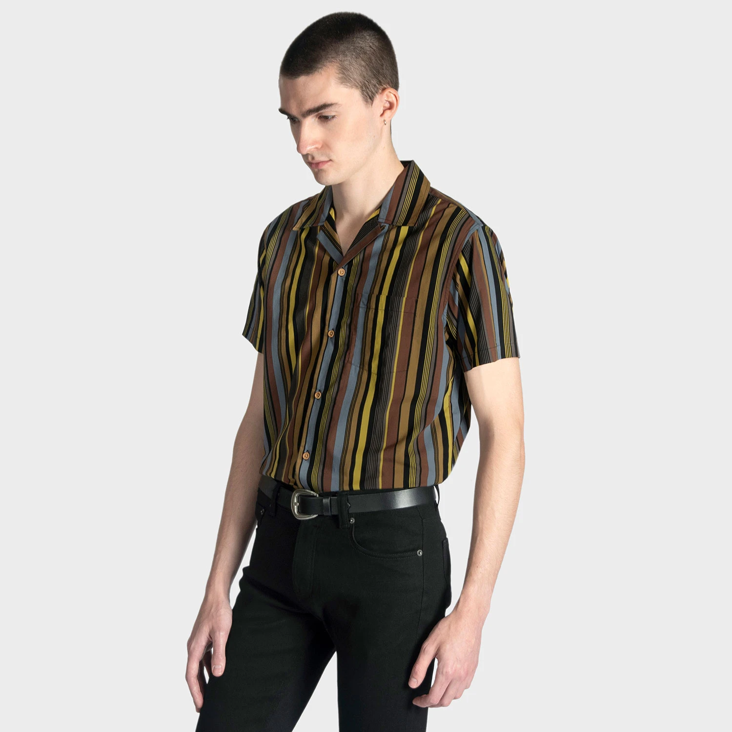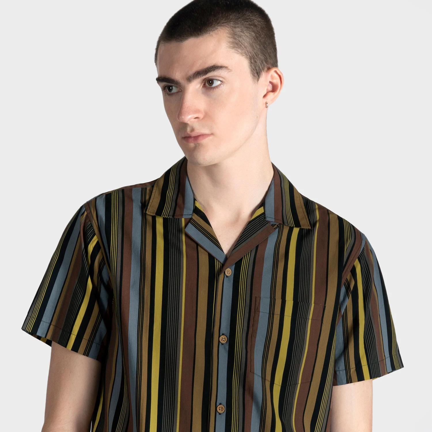 Short sleeve button up camp shirt with striped pattern, vintage-inspired wood buttons, and spread collar. The strong cotton offers durability, and the modal allows for a soft texture that drapes perfectly. Tailored for a slimmer fit but loose enough for comfort.