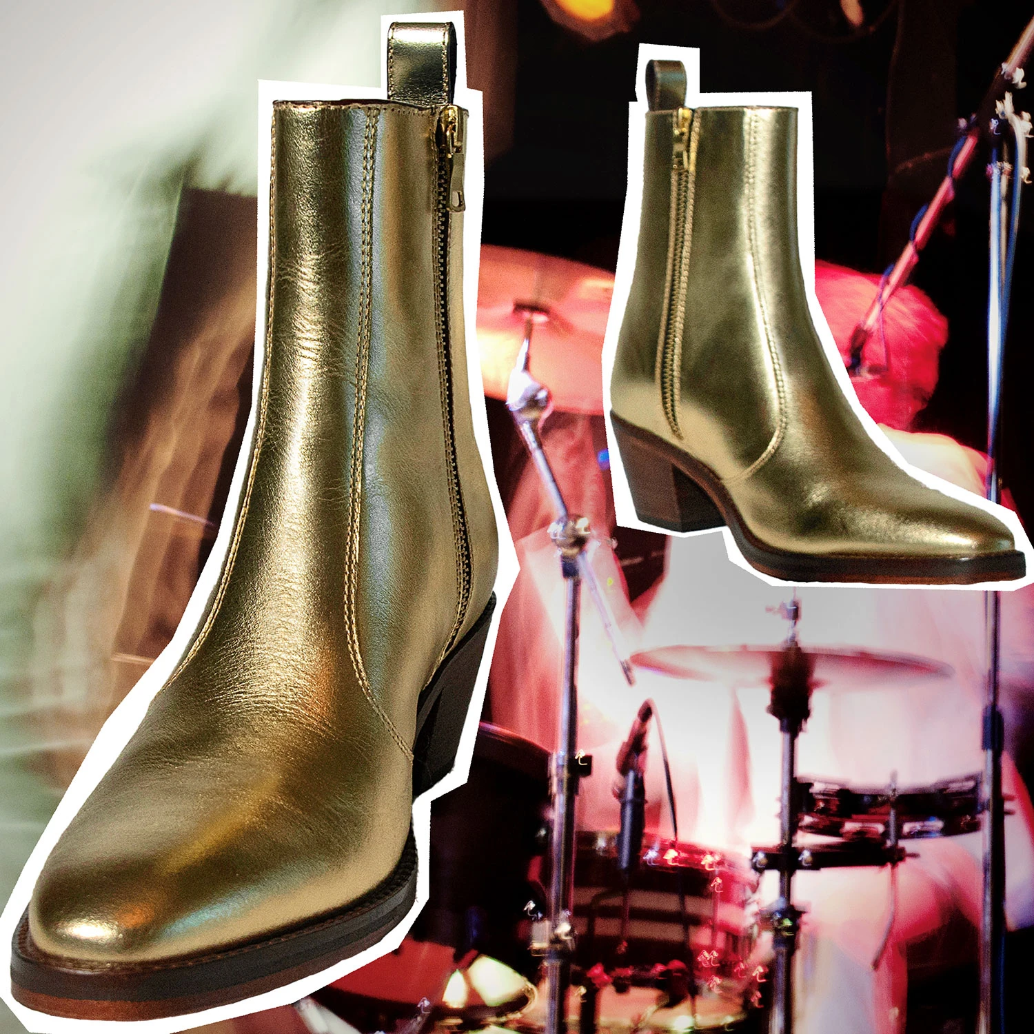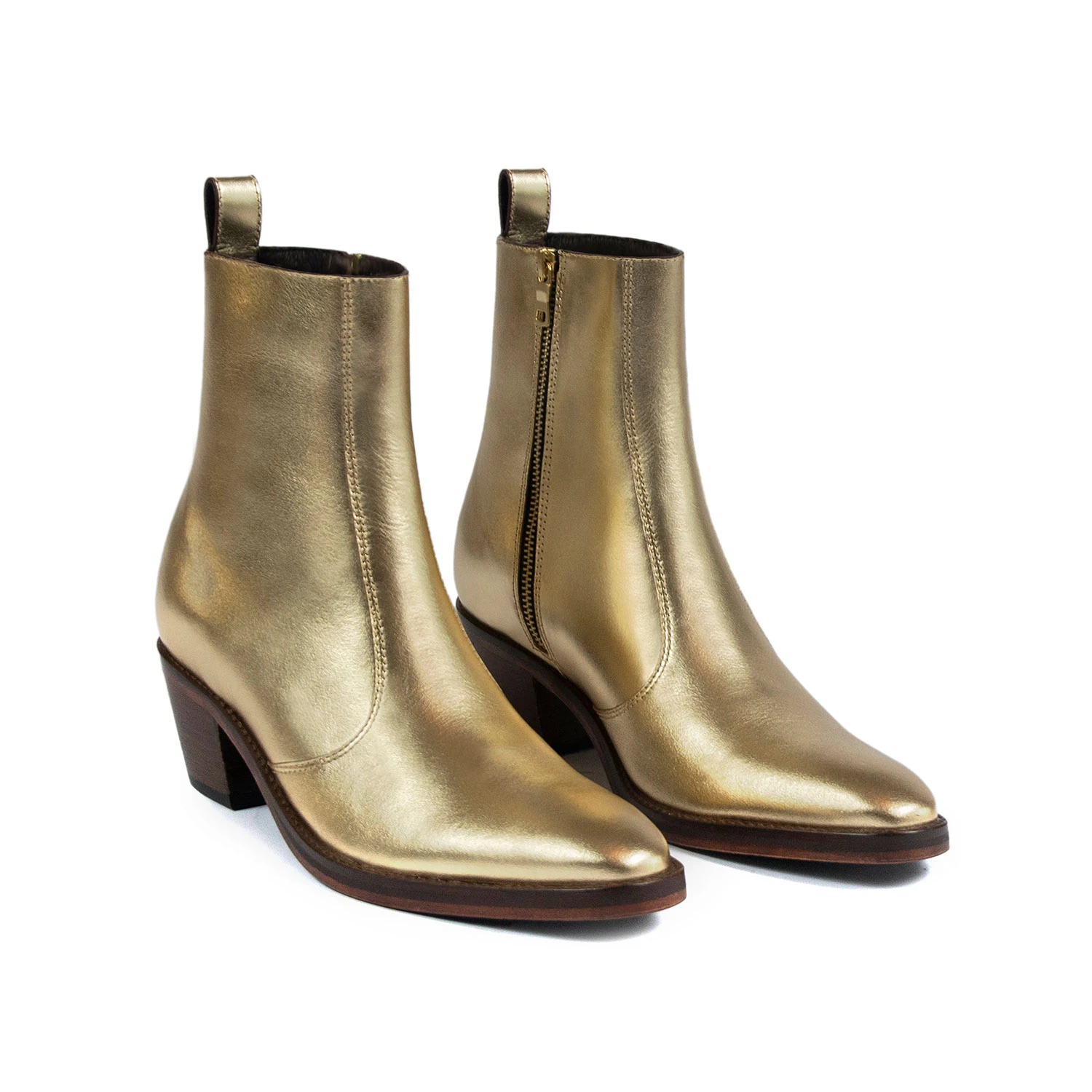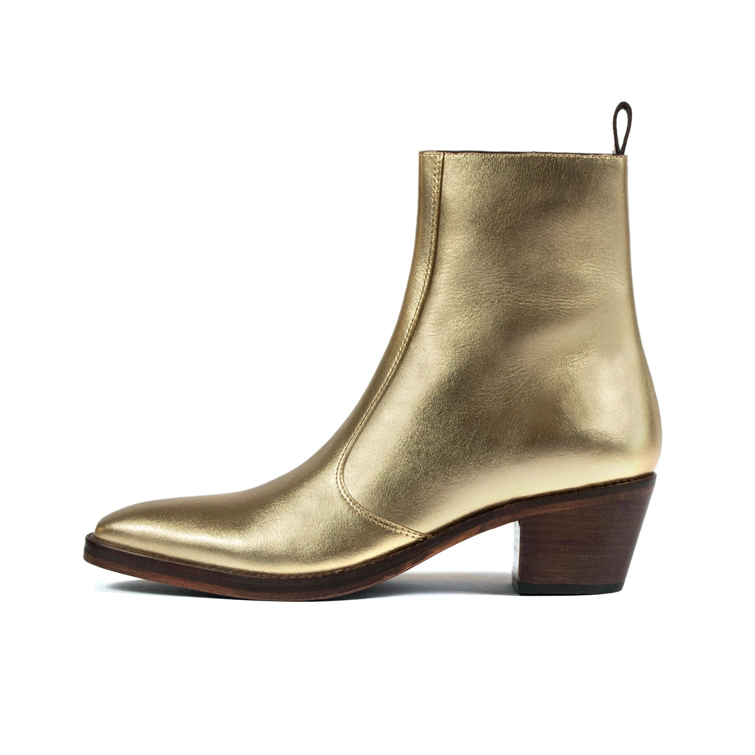 The Richards are women’s metallic gold, premium leather boots featuring a side ankle zipper closure. Now with a taller, stacked heel. Hand-made, leather sole with STH logo engraving. Updated and classic fit.