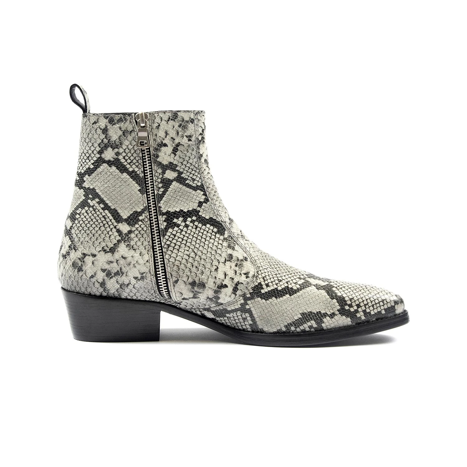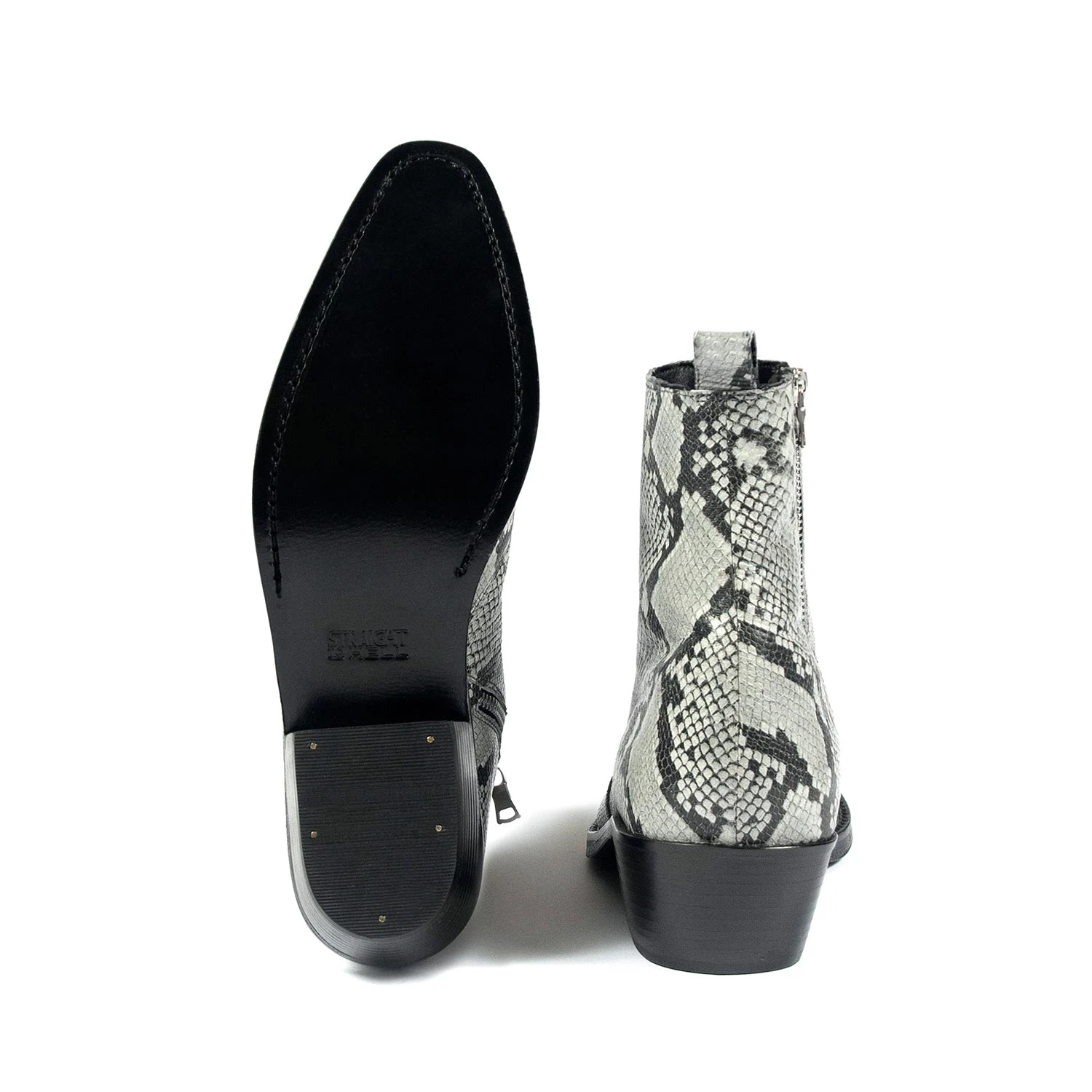 The Richards is a men’s grey snakeskin pattern, premium leather boot featuring a side ankle zipper closure and stacked heel. Hand-made, Blake stitched leather sole with STH logo engraving. Blake construction allows for a resoleable boot because the outer sole is stitched directly to the upper. This enables a durable and flexible, high-end boot.