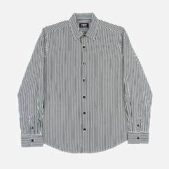 We created new, custom woven, STH Clothier cotton-modal blended fabric. The strong cotton offers durability, and the modal allows for a soft texture that drapes perfectly. Black and white striped, long sleeve button up shirt. Tailored for a slimmer fit but loose enough for comfort.