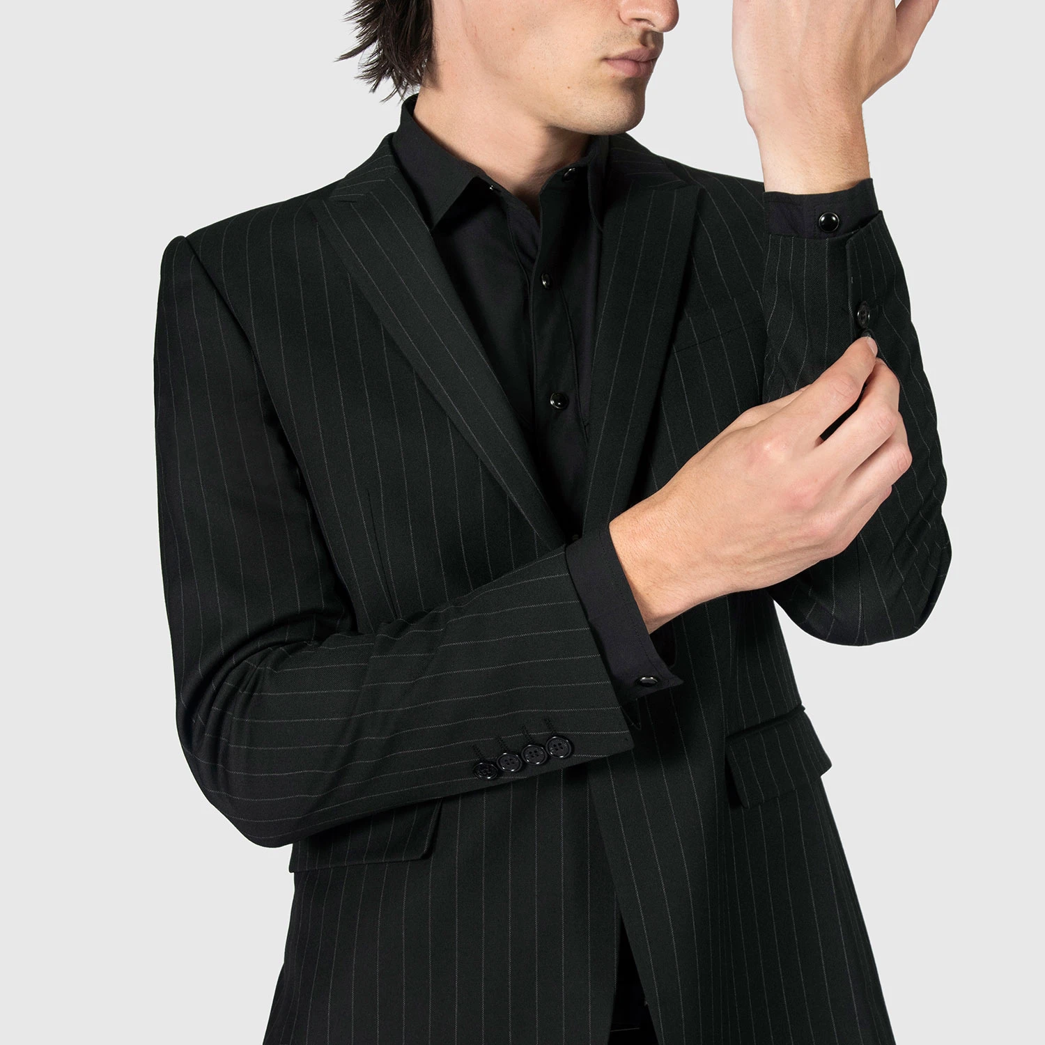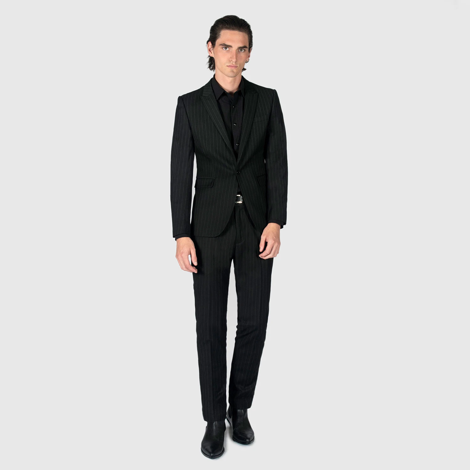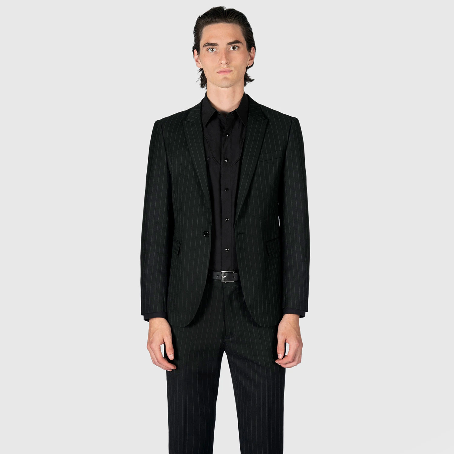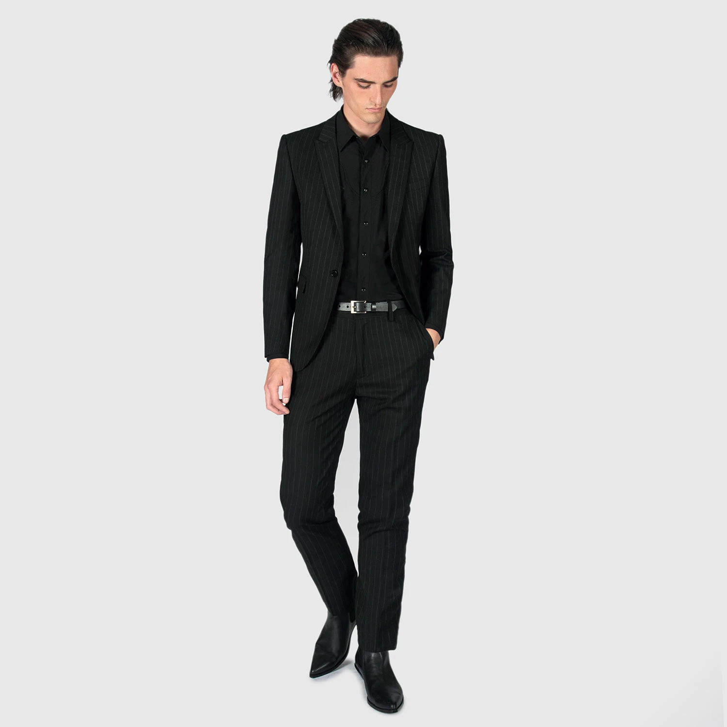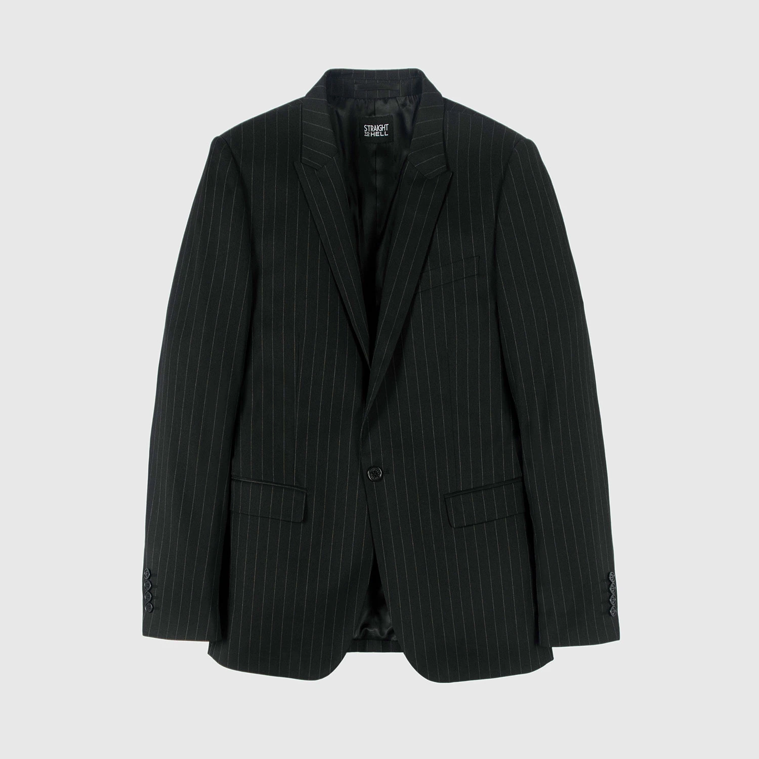 The black and white pinstriped Riviera blazer features peaked lapels and single button closure. Can be worn casually with black denim or as a suit with the matching Hitmaker pants. Tailored for a slim fit.