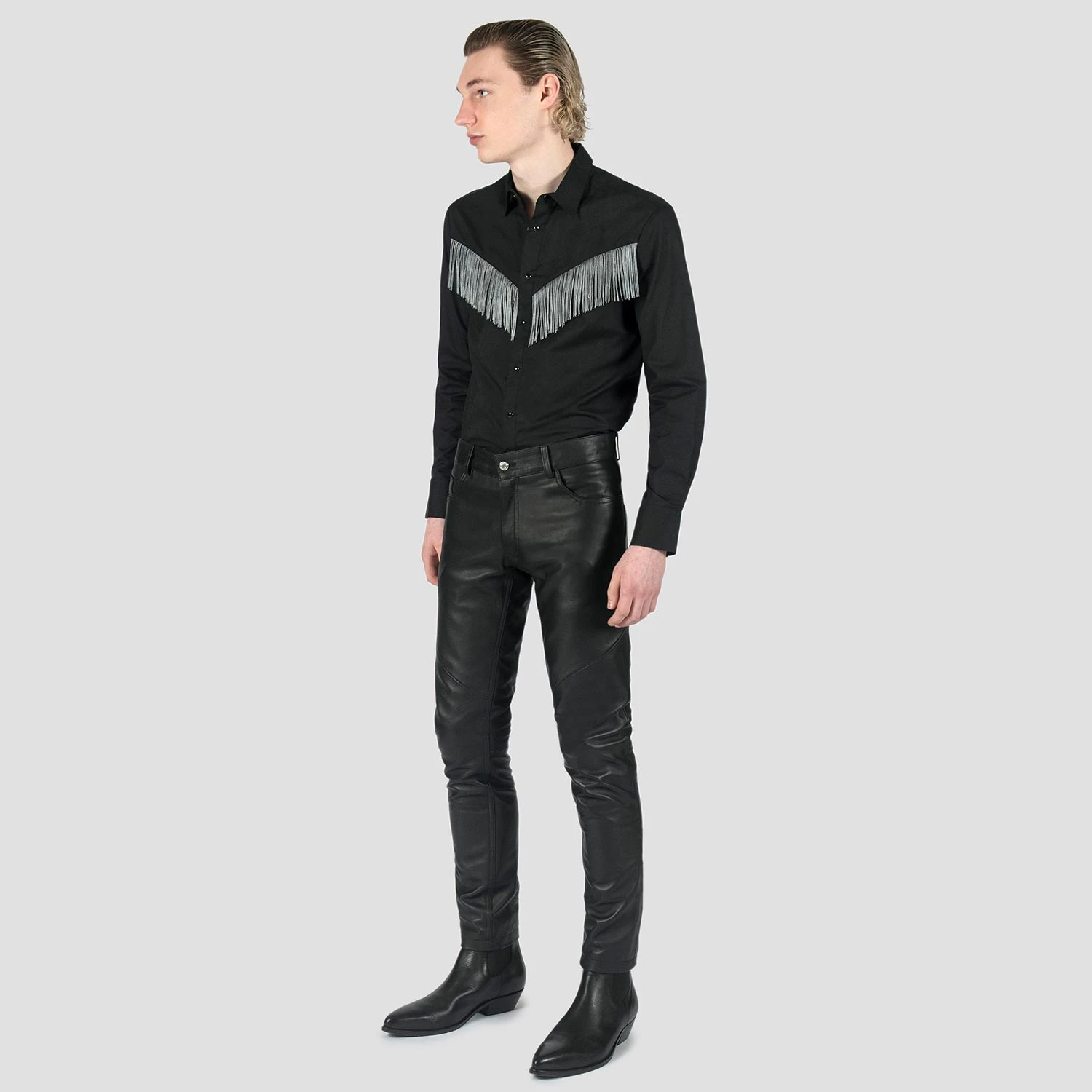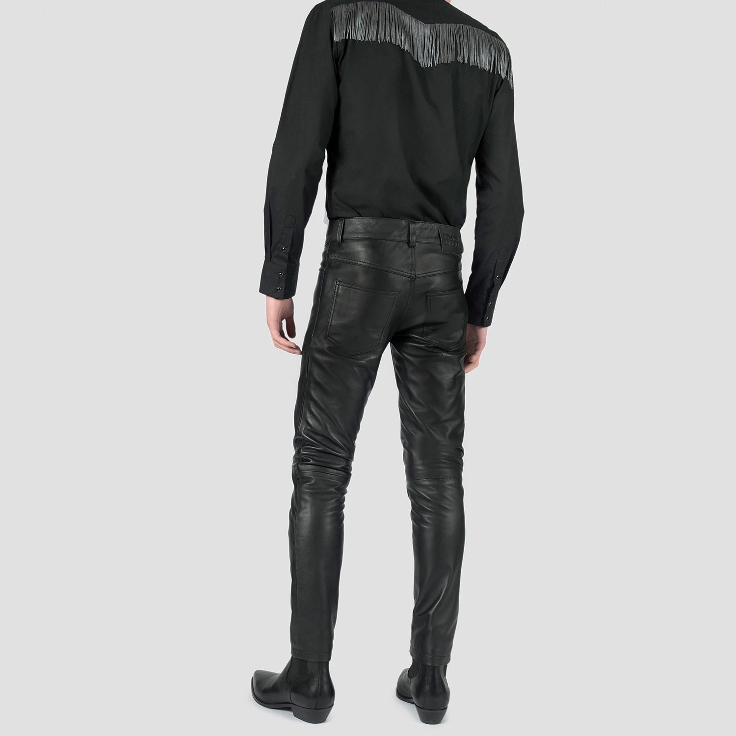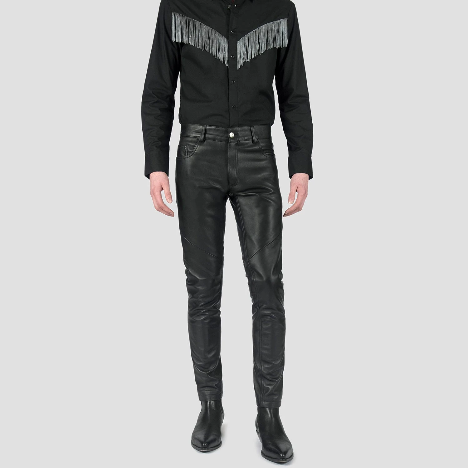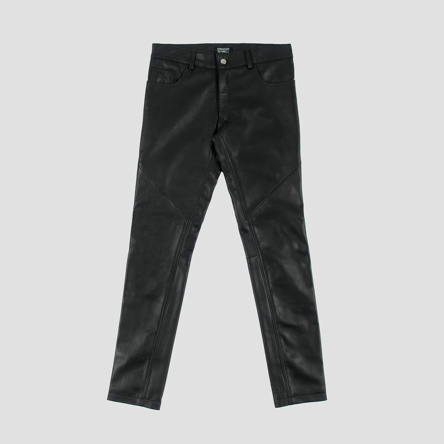 Leather pants in the Skinny James. Skinny and our tightest fit. Premium leather is supple to the touch and durable when worn. Medium rise, slight stretch, with a tapered ankle.