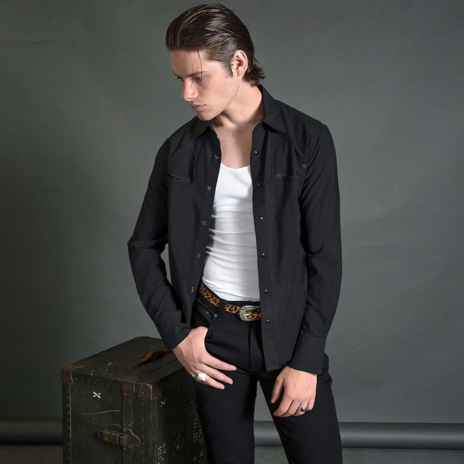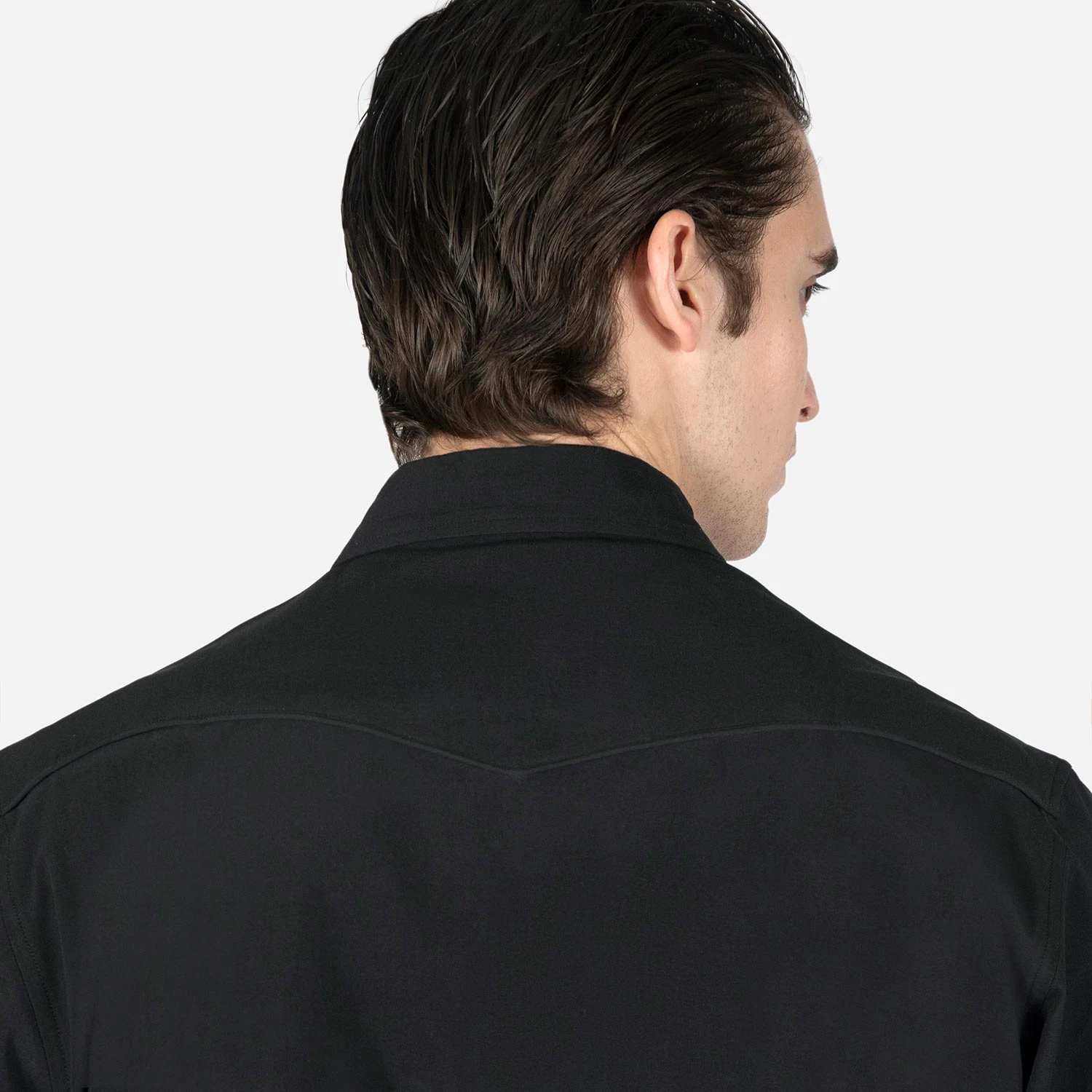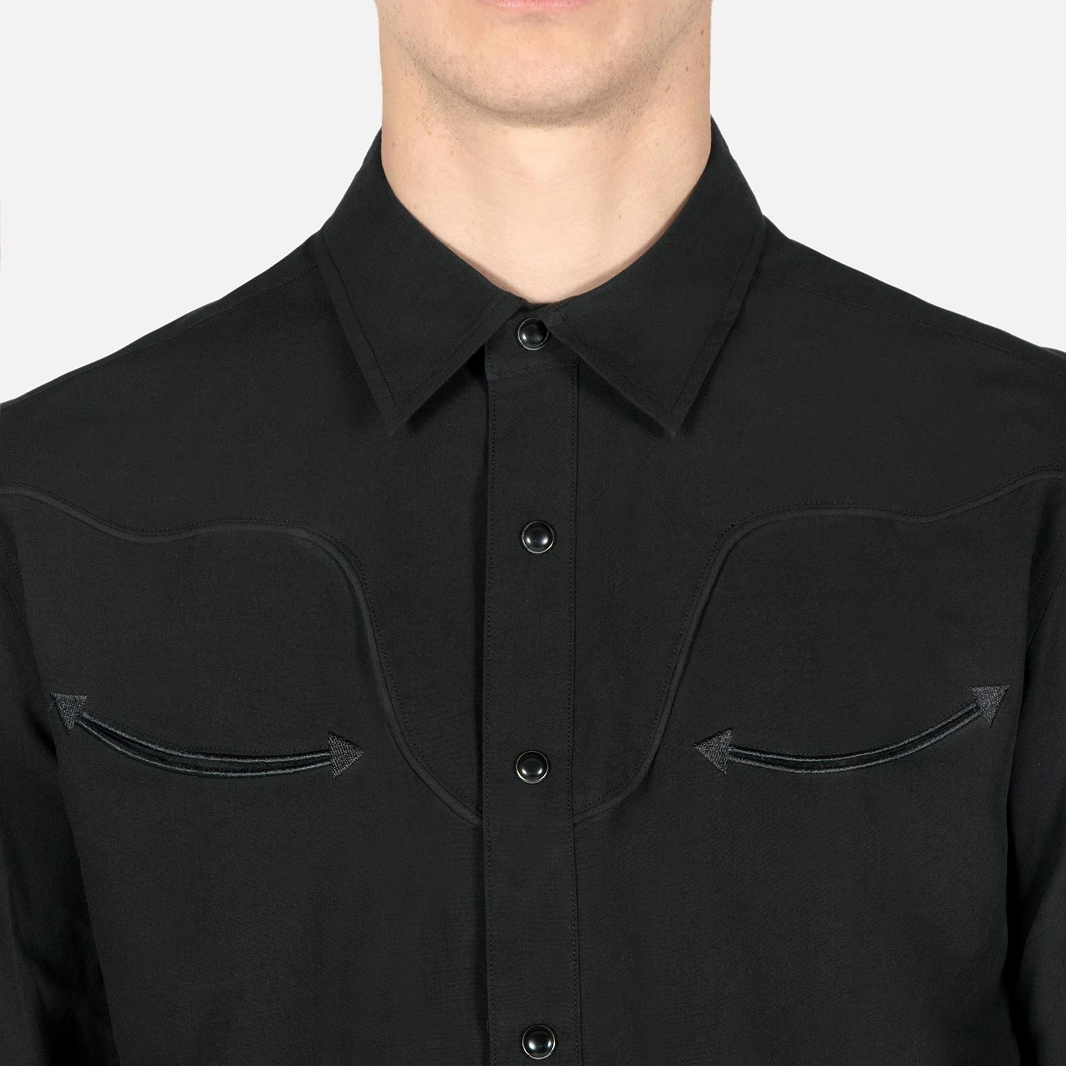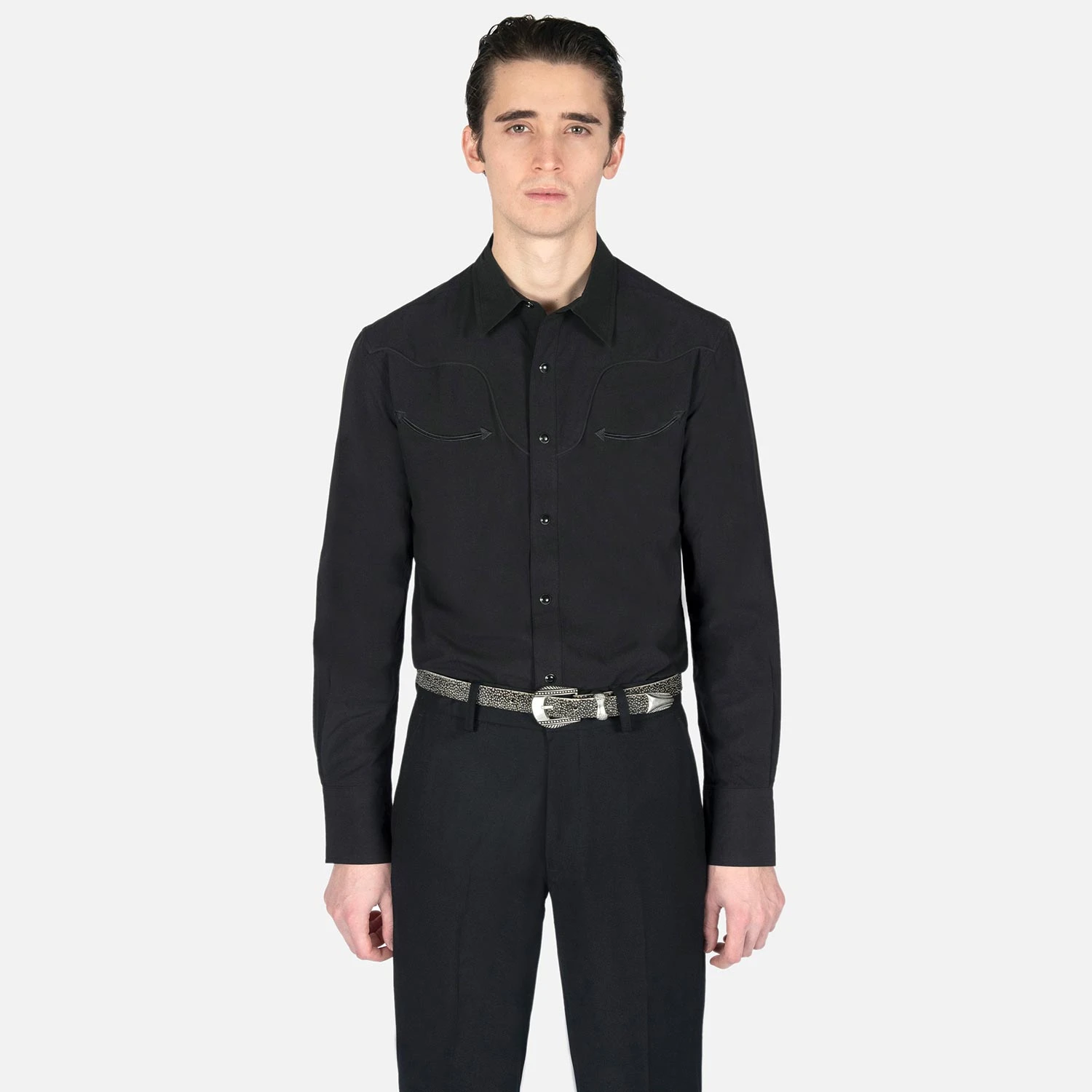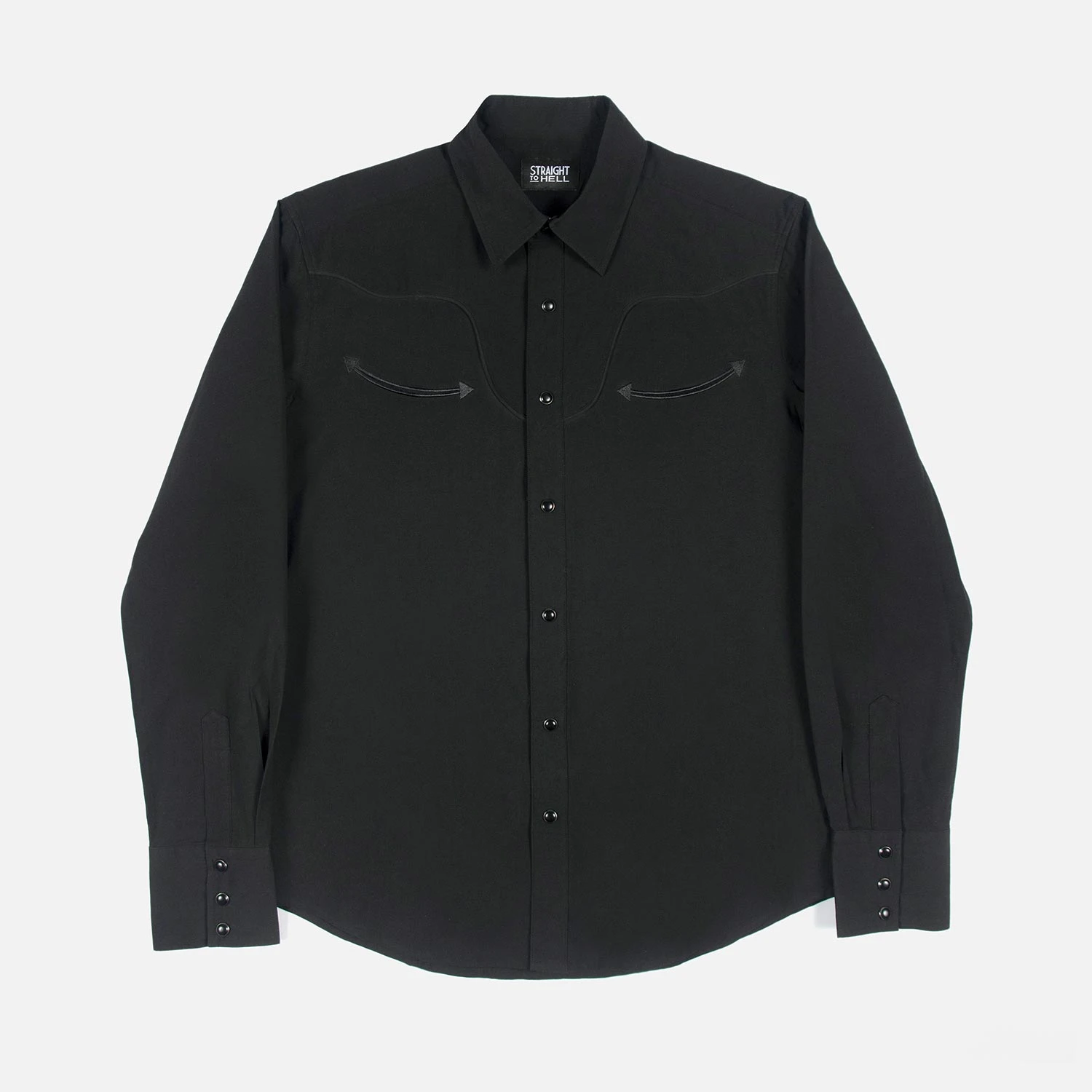 We created new, custom woven, STH Clothier cotton-modal blended fabric. The strong cotton offers durability, and the modal allows for a soft texture that drapes perfectly. Long sleeve button up western shirt with black fabric, black twist piping, black chest pocket embroidery, and black snap closure. Black on black on black on black. Tailored for a slimmer fit but loose enough for comfort.