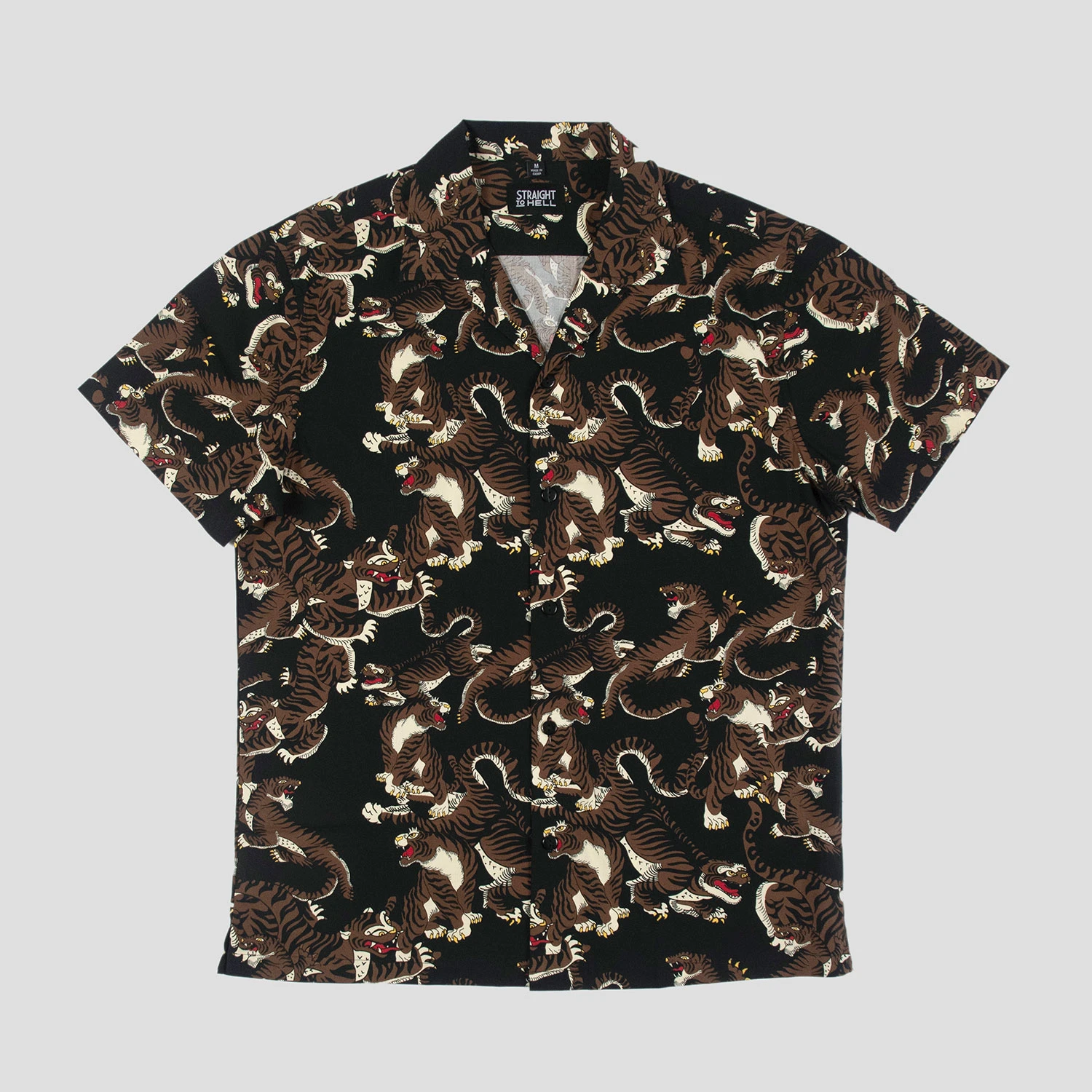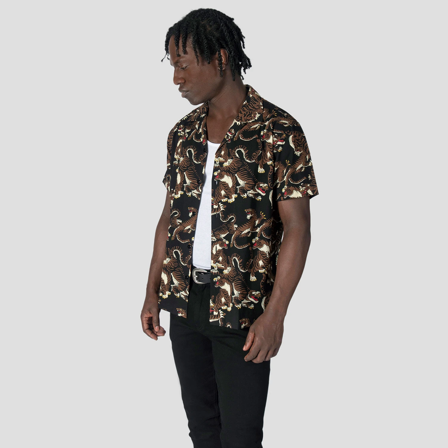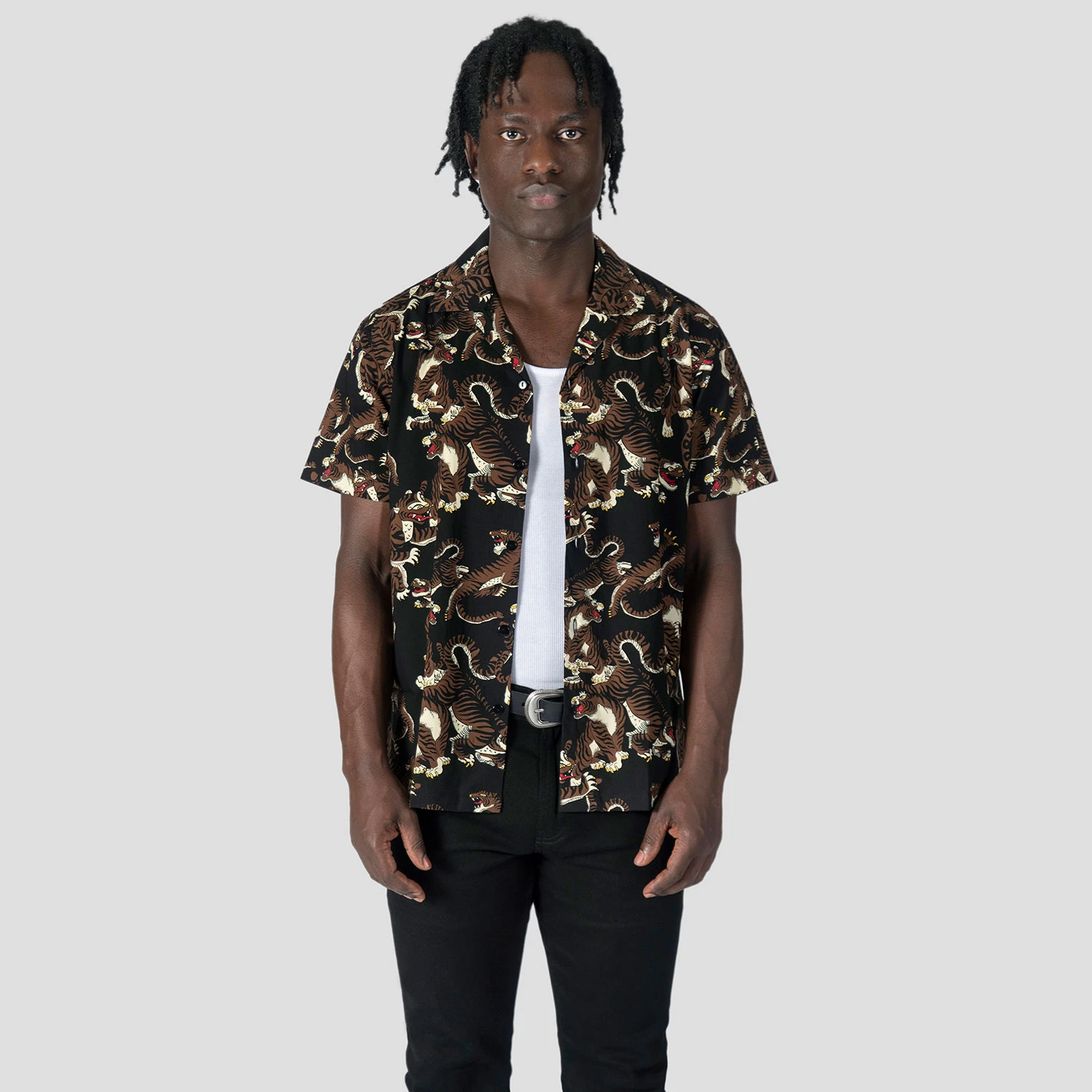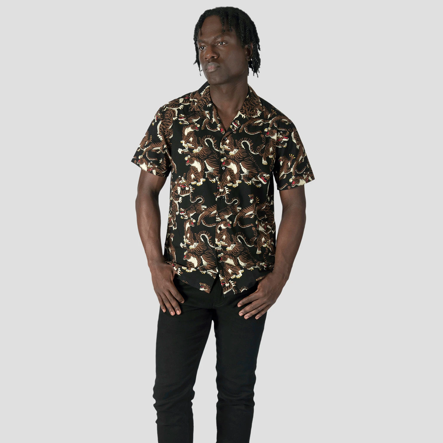 The Tame My Tiger is back, and made from our custom woven, STH Clothier cotton-modal blended fabric. Short sleeve button up camp shirt with our tiger motif artwork and spread collar. The strong cotton offers durability, and the modal allows for a soft texture that drapes perfectly. Tailored for a slimmer fit but loose enough for comfort.