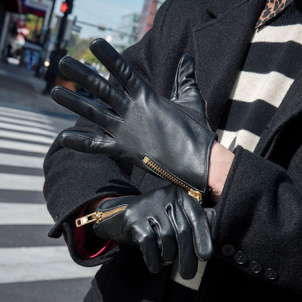 Leather gloves designed for men’s hands. Soft black leather quickly conforms to your hand’s shape. Comfortable on the inside and outside for a smooth grip. Sturdy gold color zipper closure tightens glove.