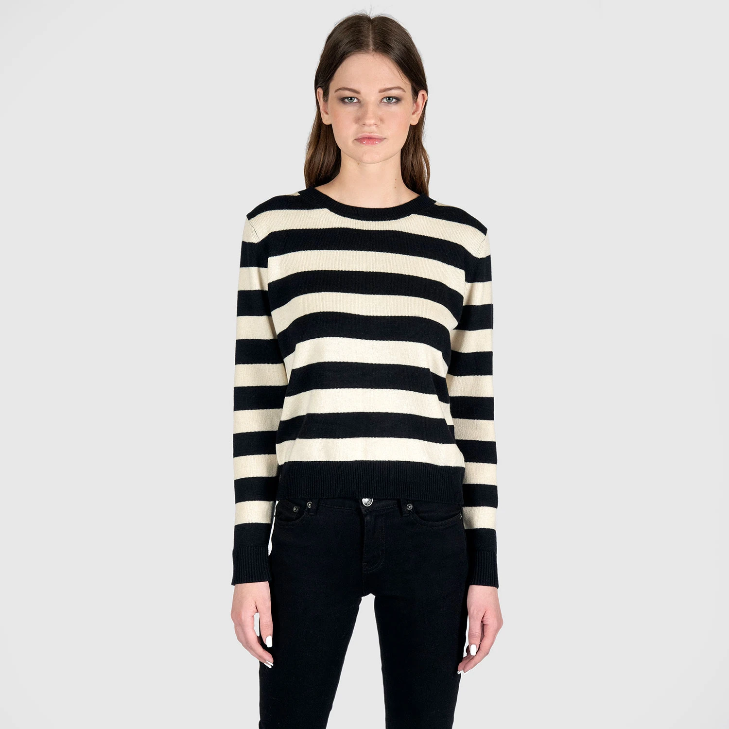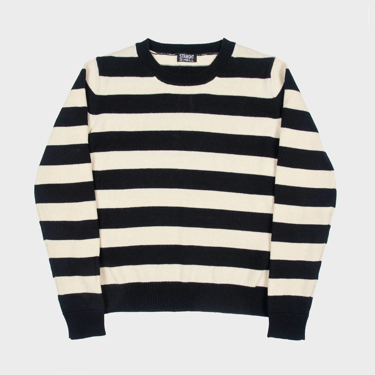 Black and light cream striped sweater. Open neck, wool and cotton blend, with a classic fit for style and comfort.