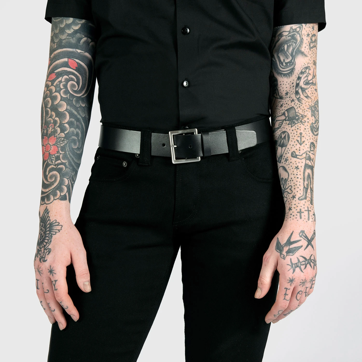 Men’s artificial leather belt. A strong and durable leather substitute. A wide, hard-working, classic buckle.