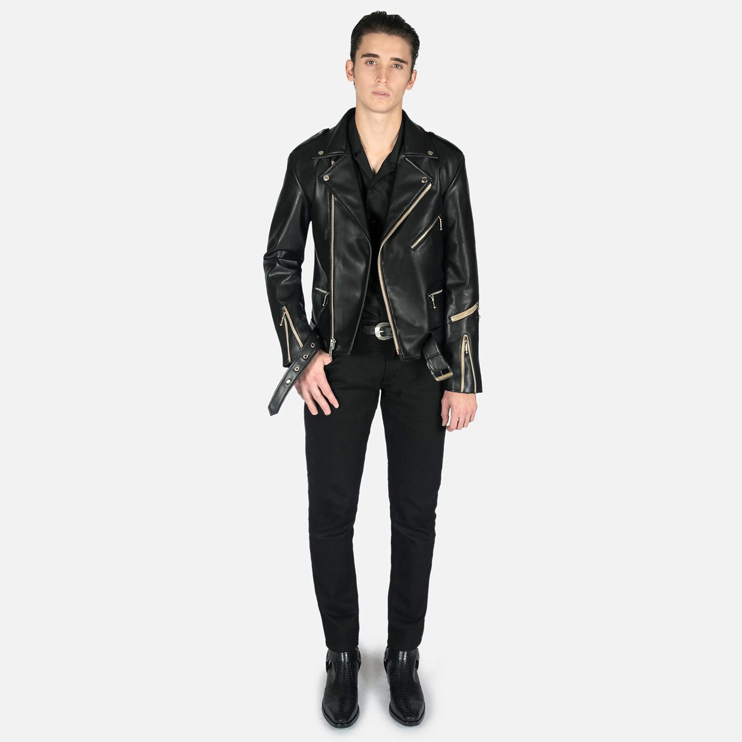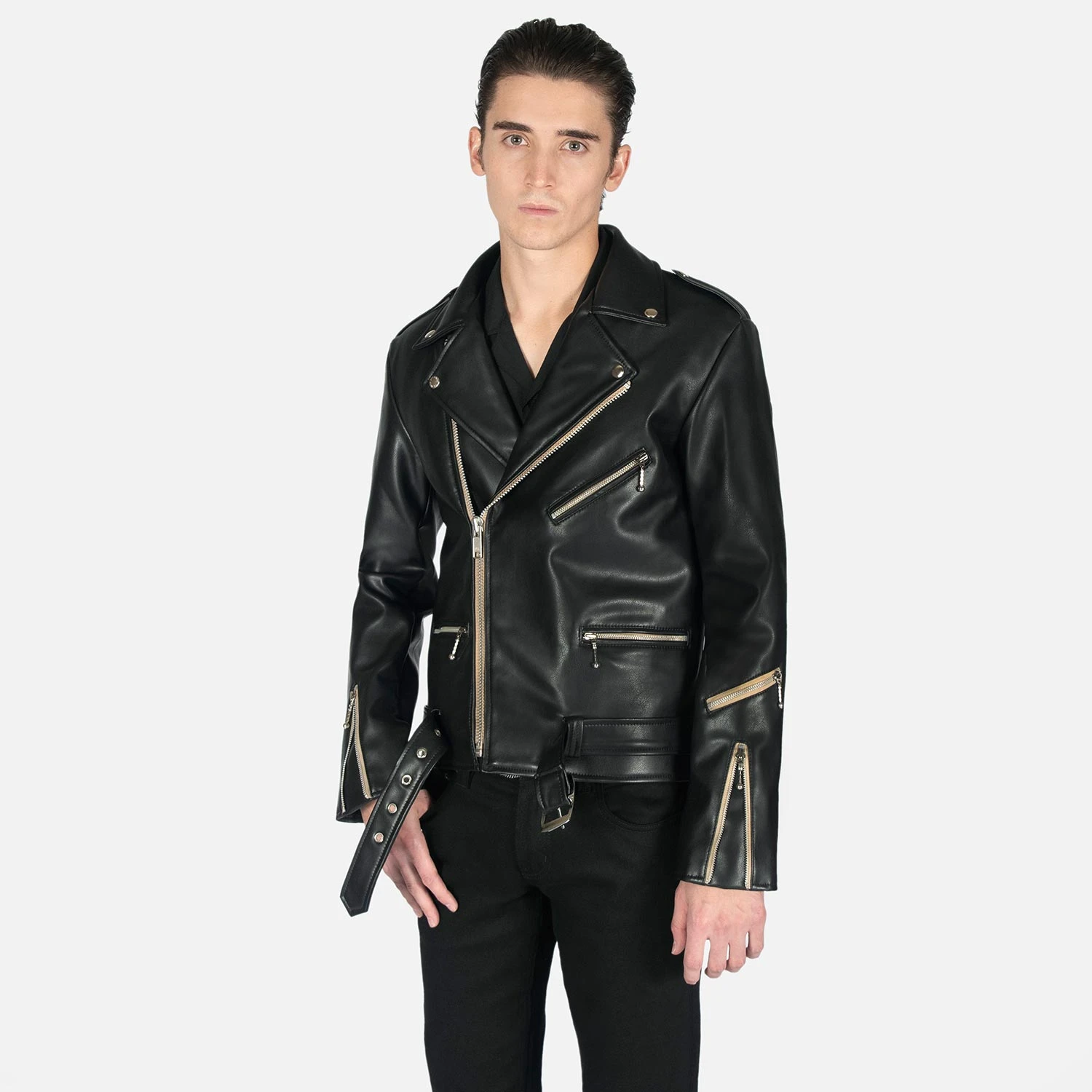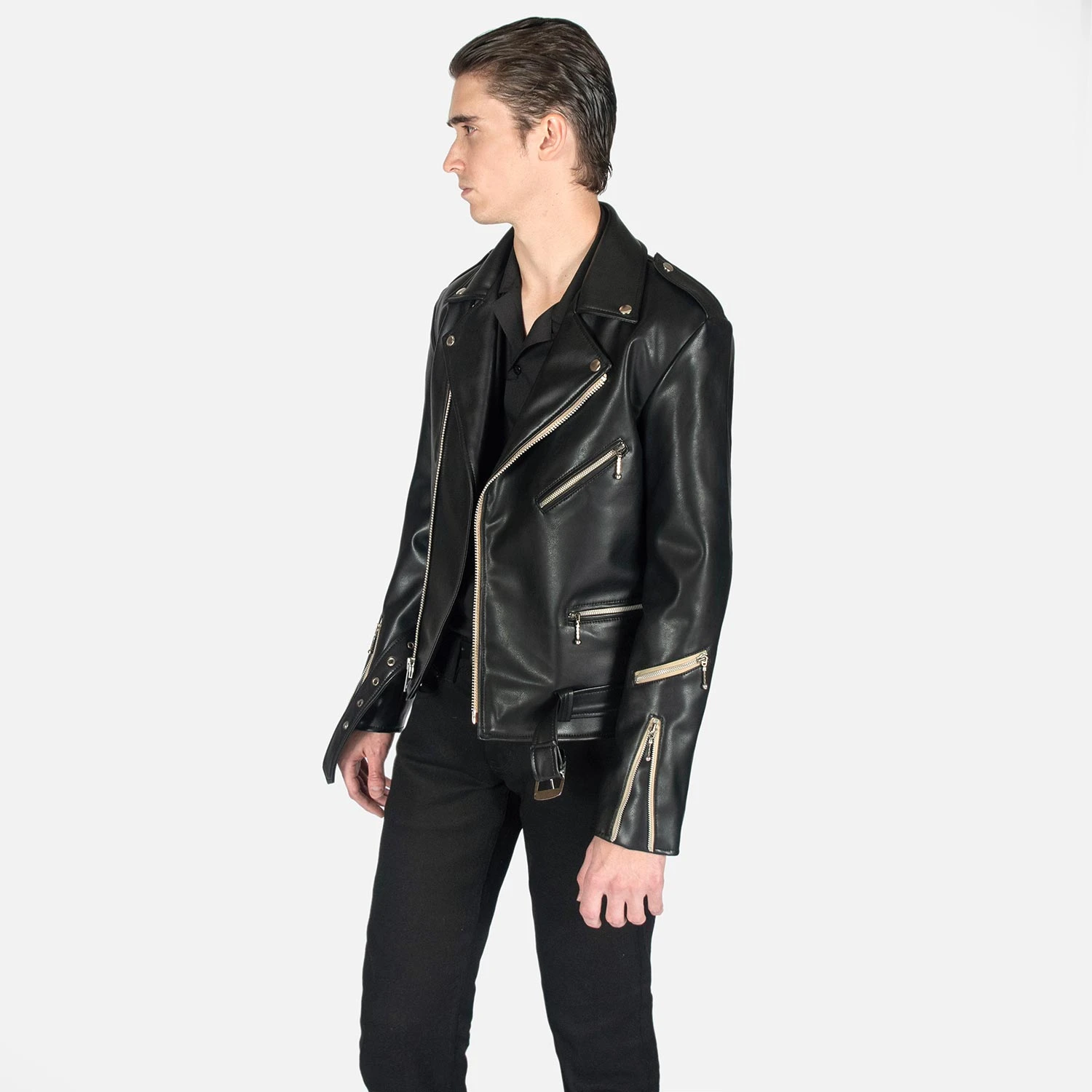 The Vegan Barracuda is ready for action. It is made from our custom STH Vegan Leatherâ„¢ and for those who prefer a quality leather substitute. Classic lapels, epaulettes, grey zipper fabric, belt, and forearm zipper. This artificial leather jacket combines old school style with stand-out features, notably a forearm zipper, polished nickel ball pull zippers, side straps, and a curved hem. The body offers quilted lining and the sleeves are non-quilted. This fitted, durable, and animal friendly jacket relaxes and conforms to your shape and breaks in perfectly. The new Vegan Barracuda is part of our STH Clothier custom fabric collection.