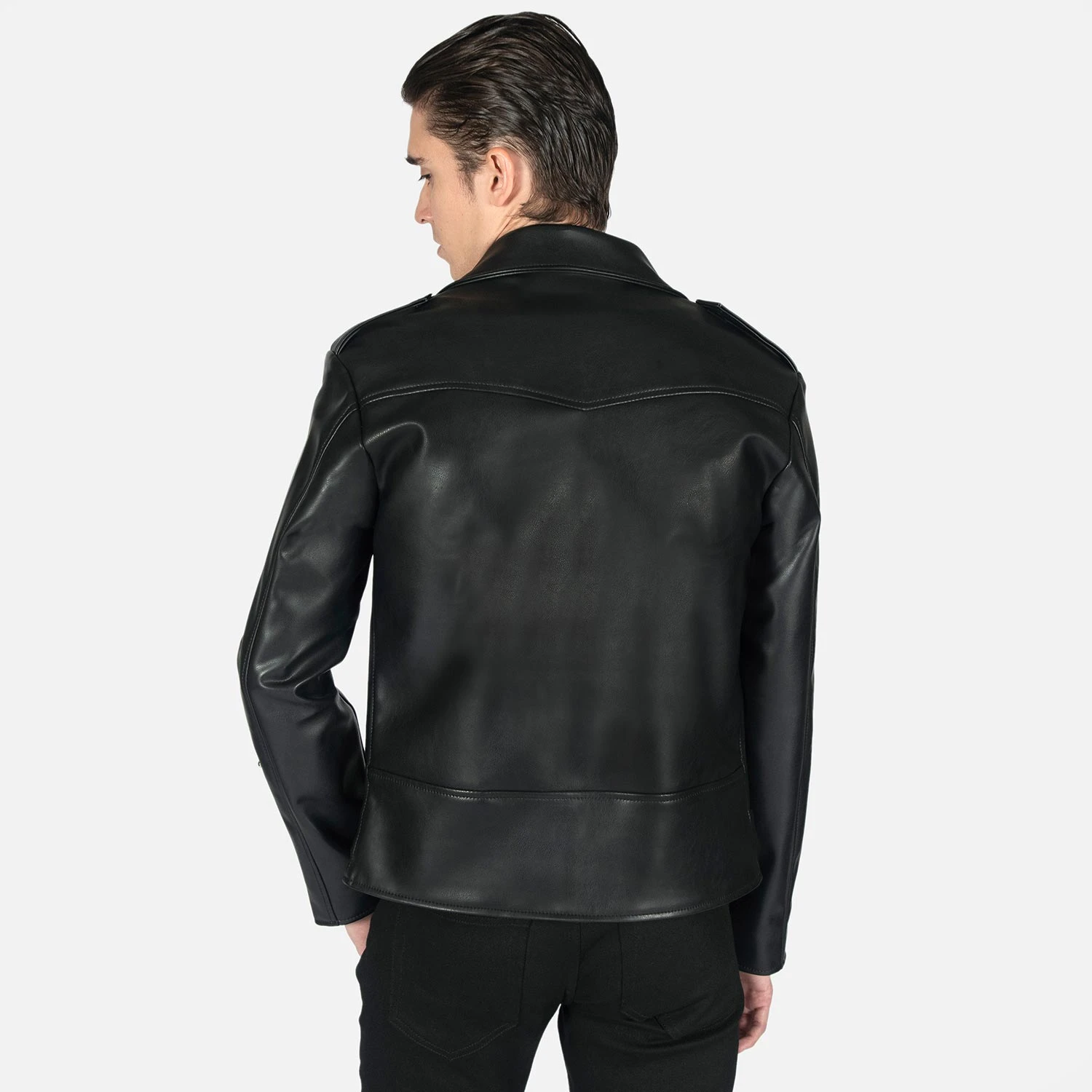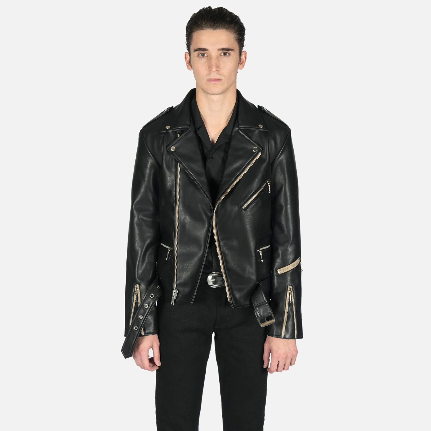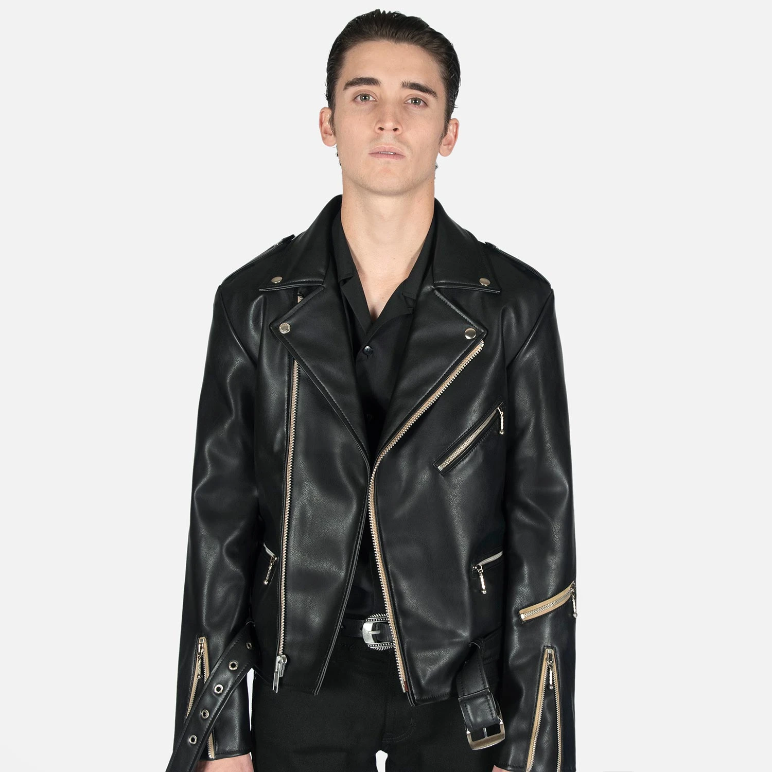 The Vegan Barracuda is ready for action. It is made from our custom STH Vegan Leatherâ„¢ and for those who prefer a quality leather substitute. Classic lapels, epaulettes, grey zipper fabric, belt, and forearm zipper. This artificial leather jacket combines old school style with stand-out features, notably a forearm zipper, polished nickel ball pull zippers, side straps, and a curved hem. The body offers quilted lining and the sleeves are non-quilted. This fitted, durable, and animal friendly jacket relaxes and conforms to your shape and breaks in perfectly. The new Vegan Barracuda is part of our STH Clothier custom fabric collection.