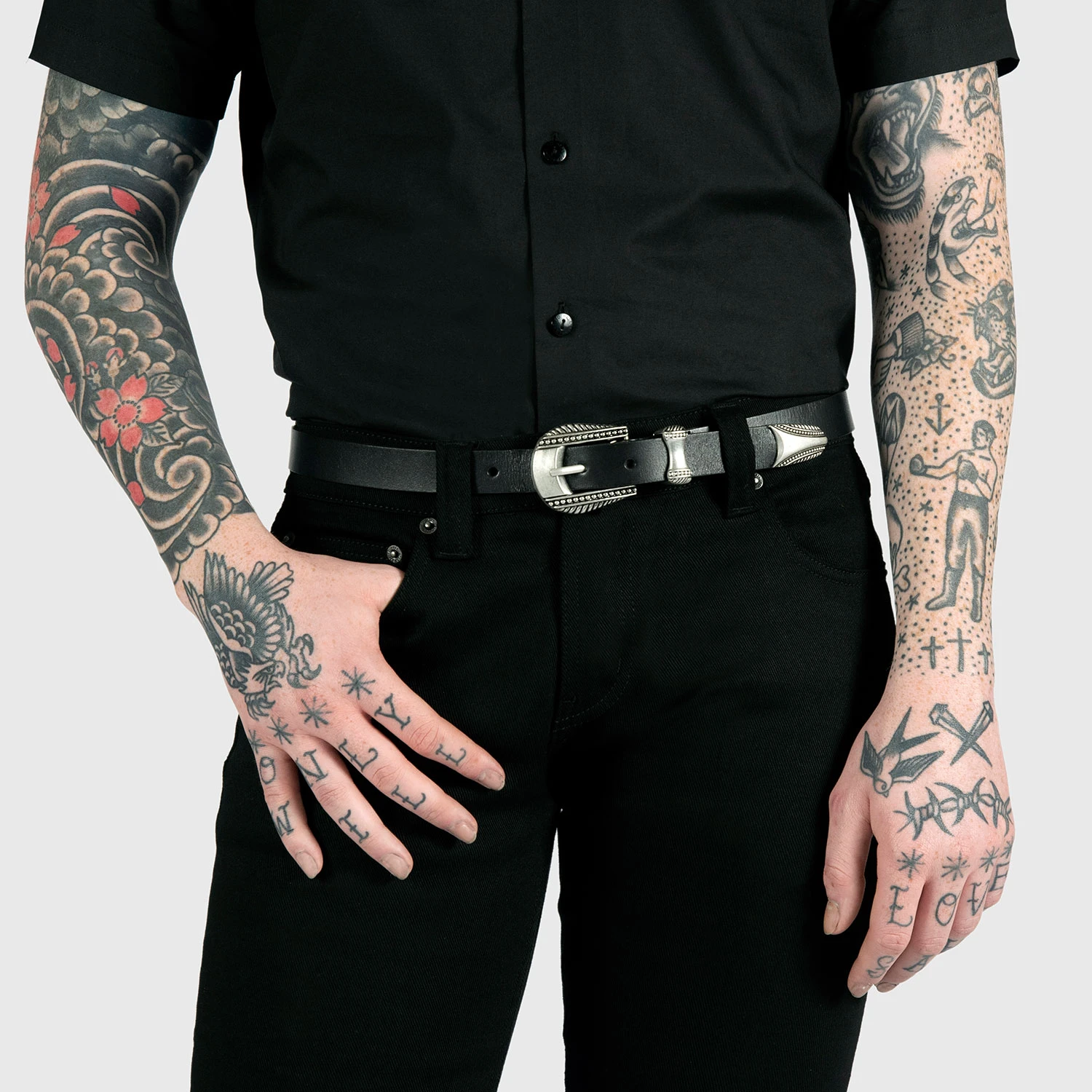 Men’s artificial leather belt. A strong and durable leather substitute. Western floral detail on buckle.