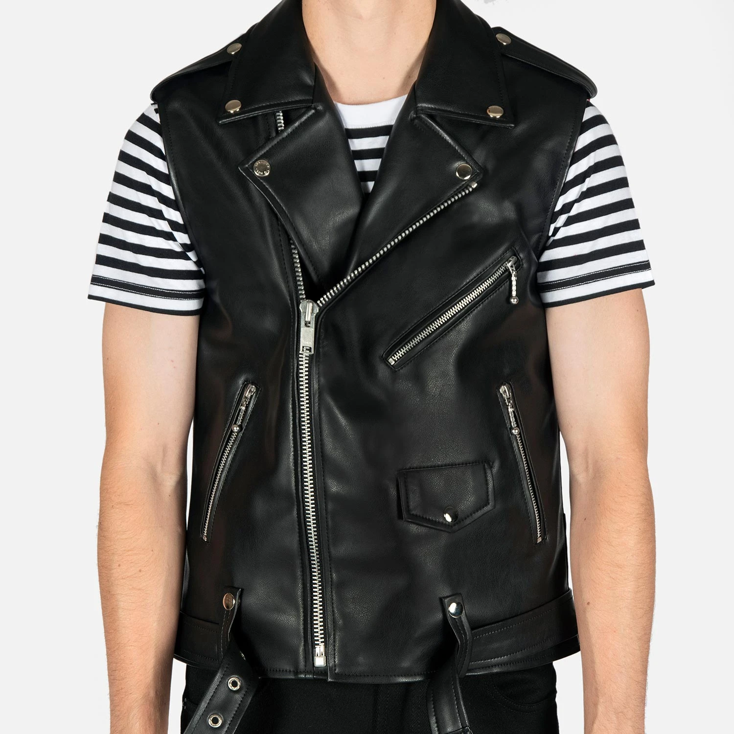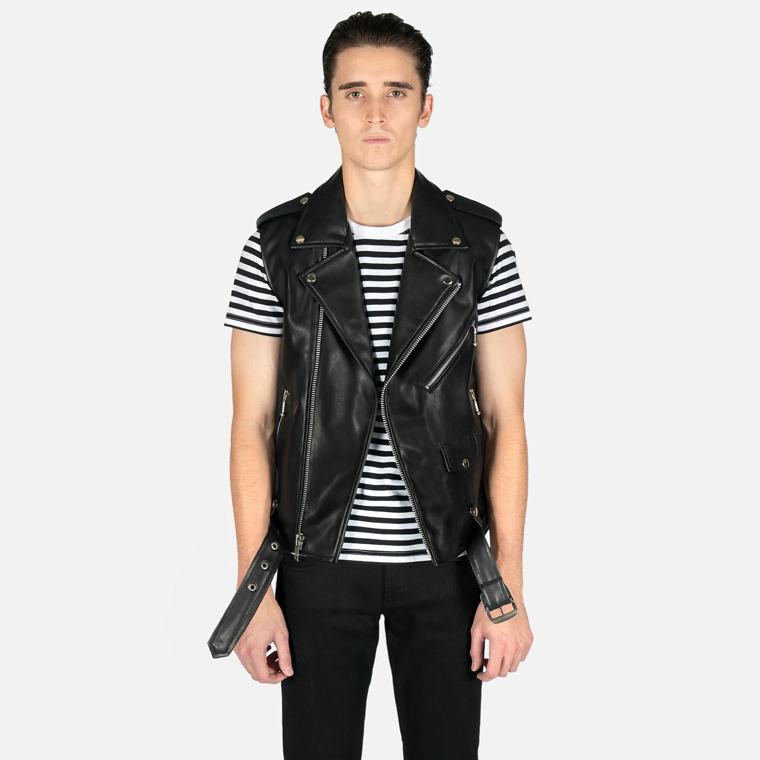 The Vegan Commando Vest is made from our custom STH Vegan Leather™ and for those who prefer a quality leather substitute. Our most traditional and recognizable artificial leather jacket, re-designed as a vest. It features a removable belt, polished nickel ball pull zippers, and quilted lining. The Vegan Commando Vest has narrow shoulders compared to the Vegan Commando jacket to avoid leather hanging over the shoulders. This fitted, durable, and animal friendly vest relaxes and conforms to your shape and breaks in perfectly. The new Vegan Commando Vest is part of our STH Clothier custom fabric collection.