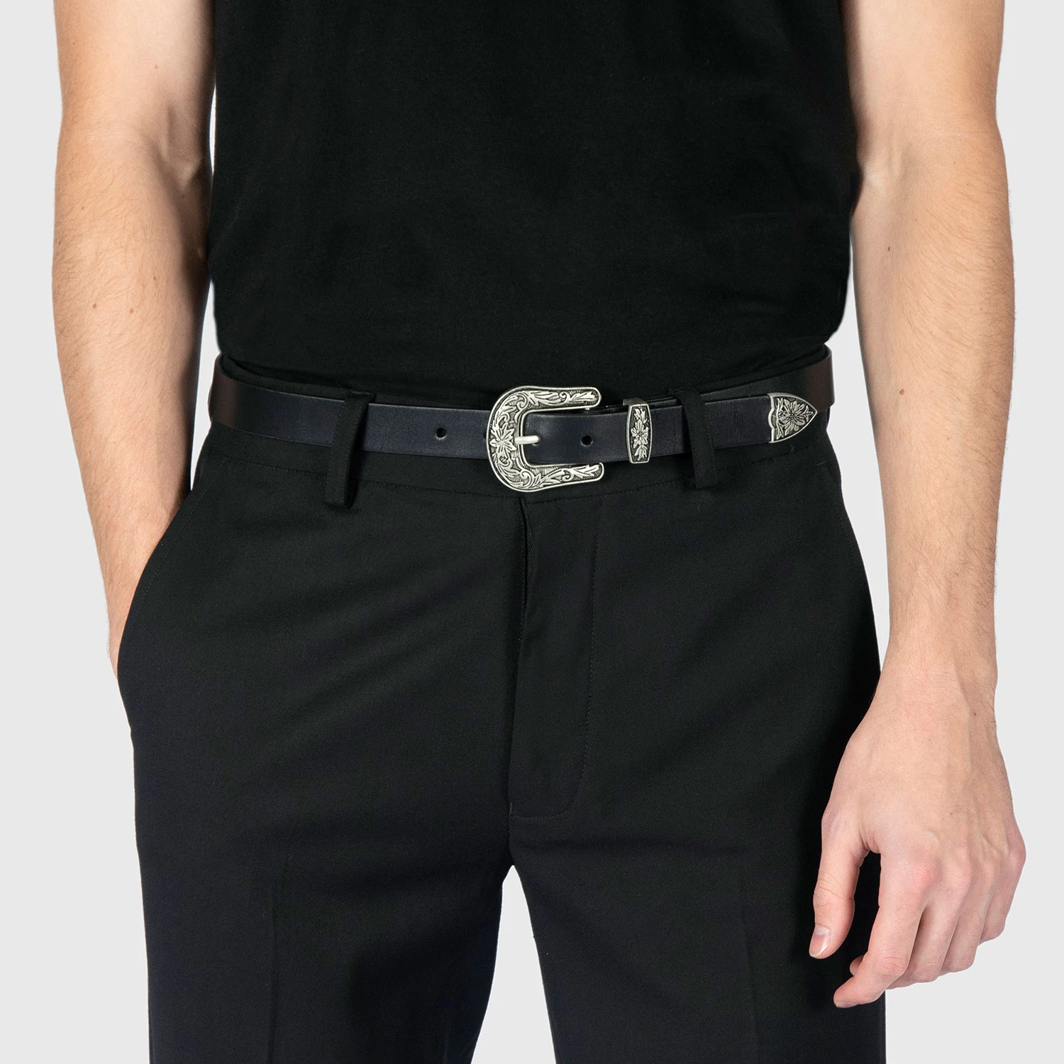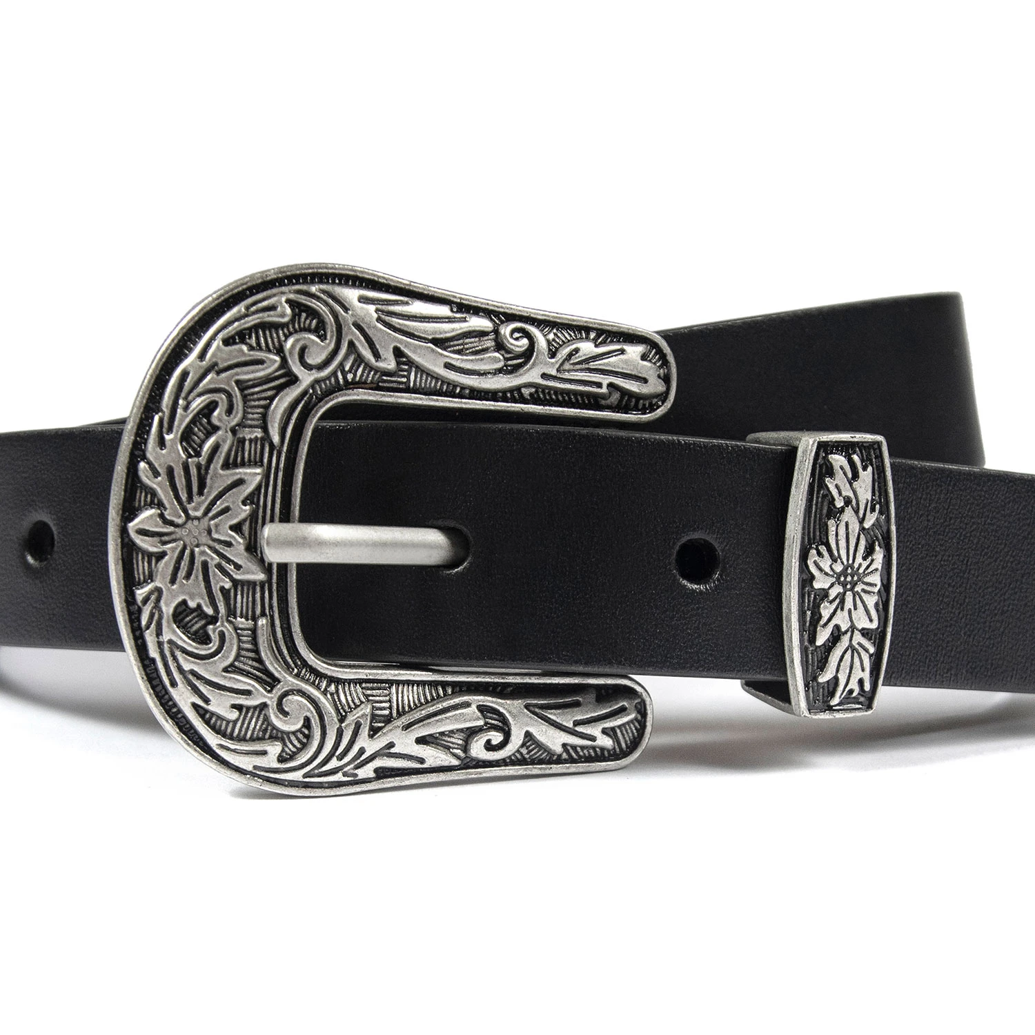 Men’s artificial leather belt. A strong and durable leather substitute. Western floral detail on buckle.