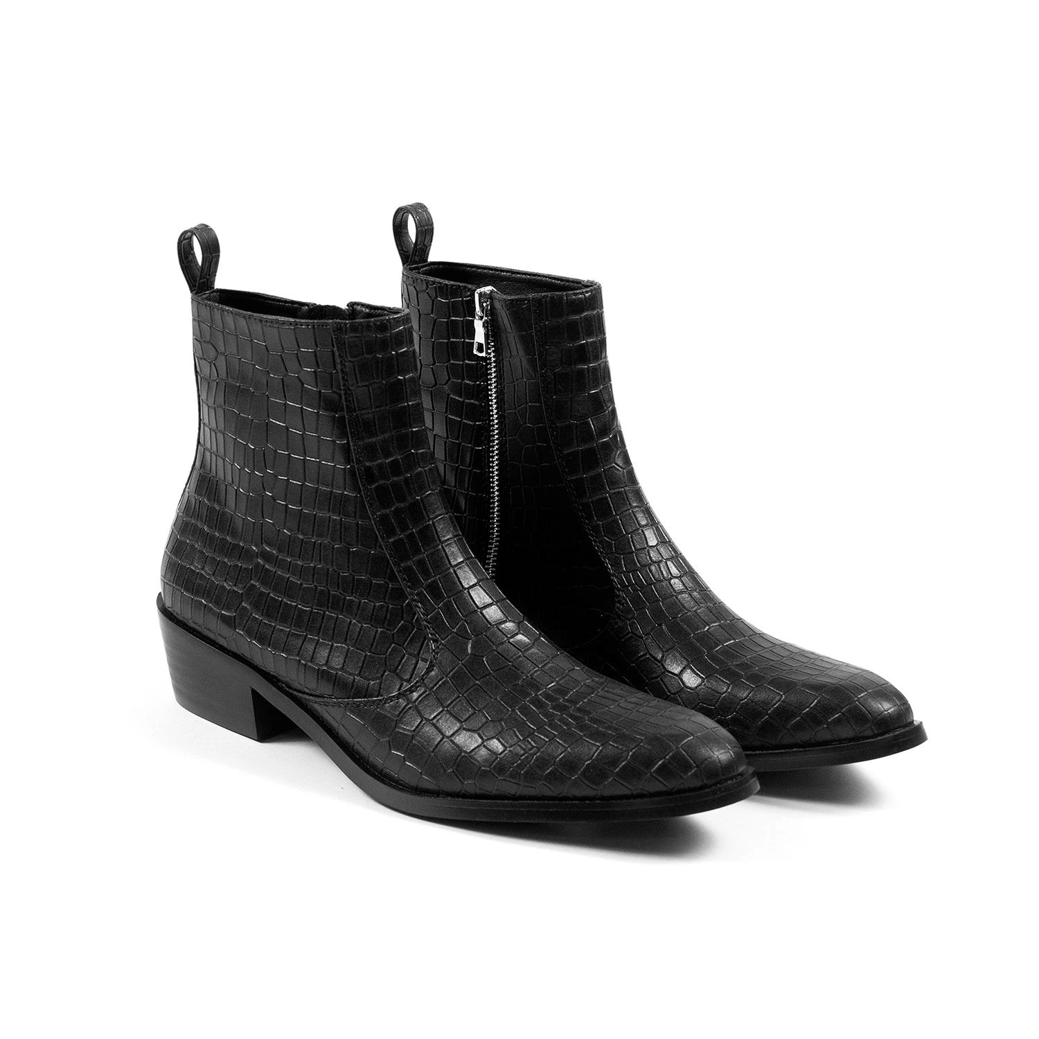 The Vegan Richards is a men’s black snakeskin pattern, vegan leather boot with a side ankle zipper closure. This vegan leather is a great substitute featuring leather qualities like grain, strength, and durability.